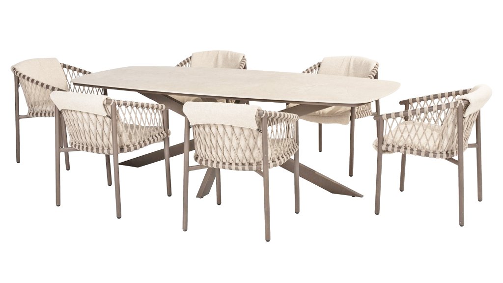 Ein wunderschöner, eleganter Tisch mit einer atemberaubenden ovalen Keramikplatte, erhältlich in 240 cm oder 300 cm. Die Platte strahlt nicht nur Eleganz aus, sondern besticht auch durch ihr markantes, modernes Aussehen. Das markante Kreuzbein ist in drei Farben erhältlich, sodass Sie diesen Tisch mühelos an Ihre Bedürfnisse und Vorlieben anpassen können. Ob Industrieschwarz, warmes Latte oder schickes Terre – jede Farbe verleiht dem Tisch einen einzigartigen Charakter und einen Hauch von Luxus. Mit seinen großzügigen Abmessungen bietet dieser Tisch ausreichend Platz für ein gemütliches Essen mit Freunden oder ein intimes Abendessen mit der Familie. Die Kombination aus raffinierter Keramik und dem starken, stilvollen Bein macht diesen Tisch nicht nur funktional, sondern setzt auch ein atemberaubendes Statement in Ihrem Garten.