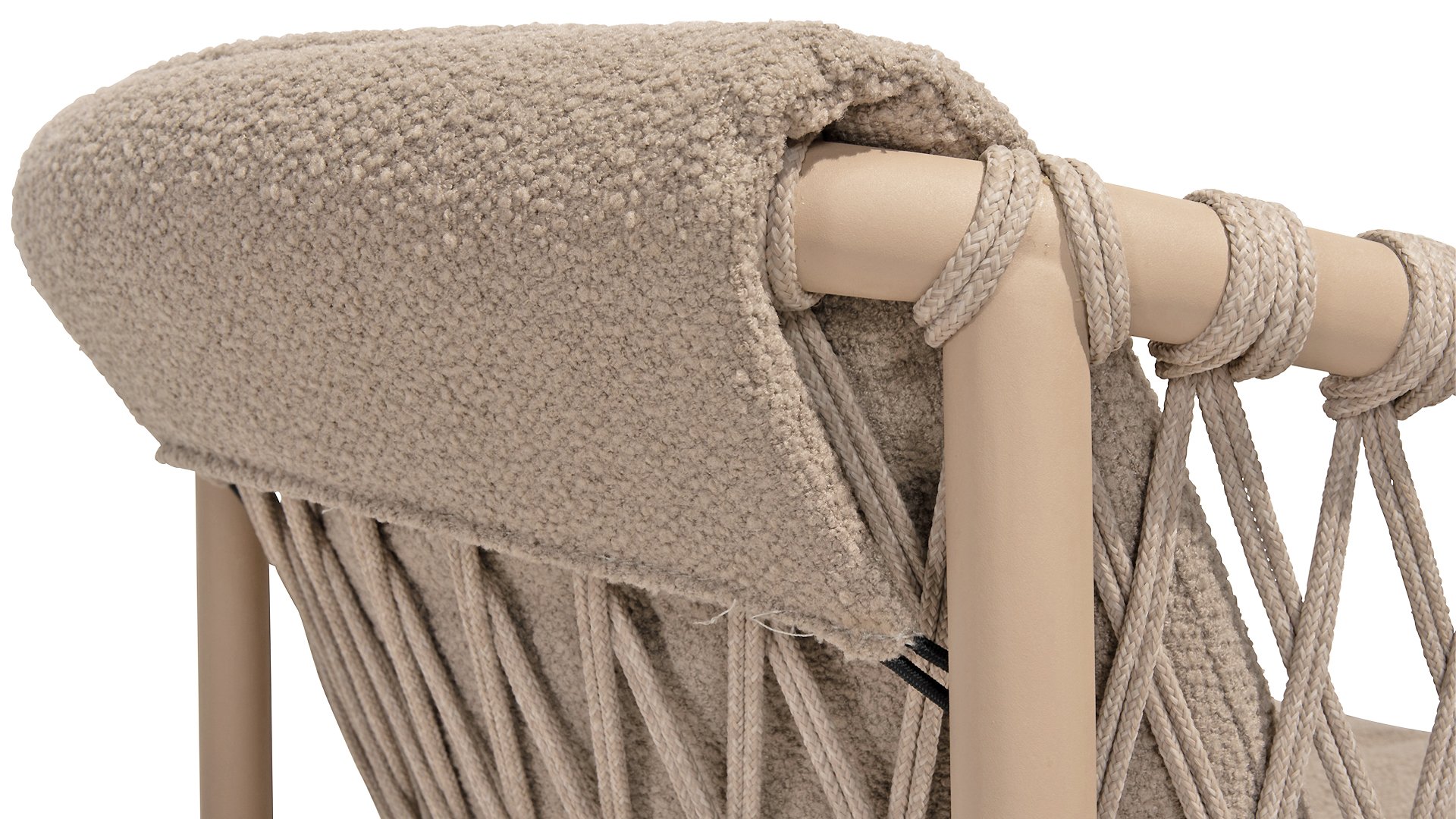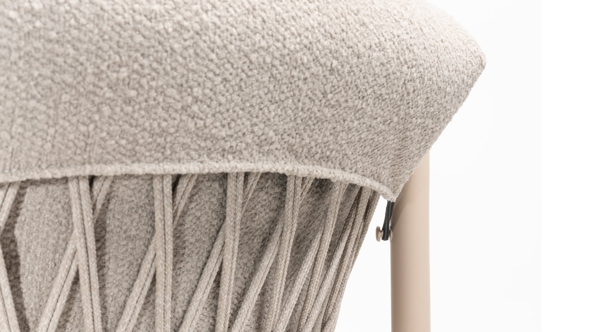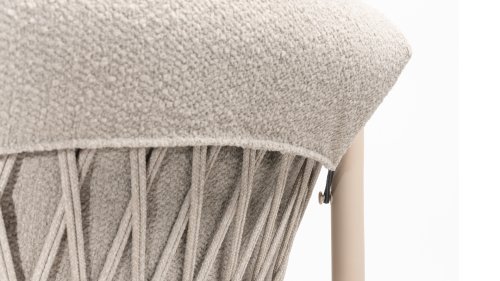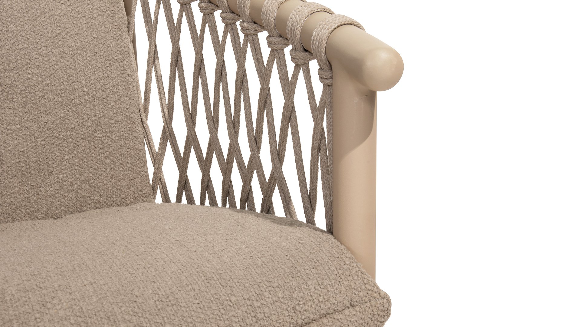 Der Sitzbezug besteht aus Olefin, einem synthetischen Material, das für seine Festigkeit und Wetterbeständigkeit bekannt ist. Die Bouclé Clay-Polsterung verleiht eine luxuriöse und weiche Textur, die sowohl ästhetisch ansprechend als auch praktisch ist.