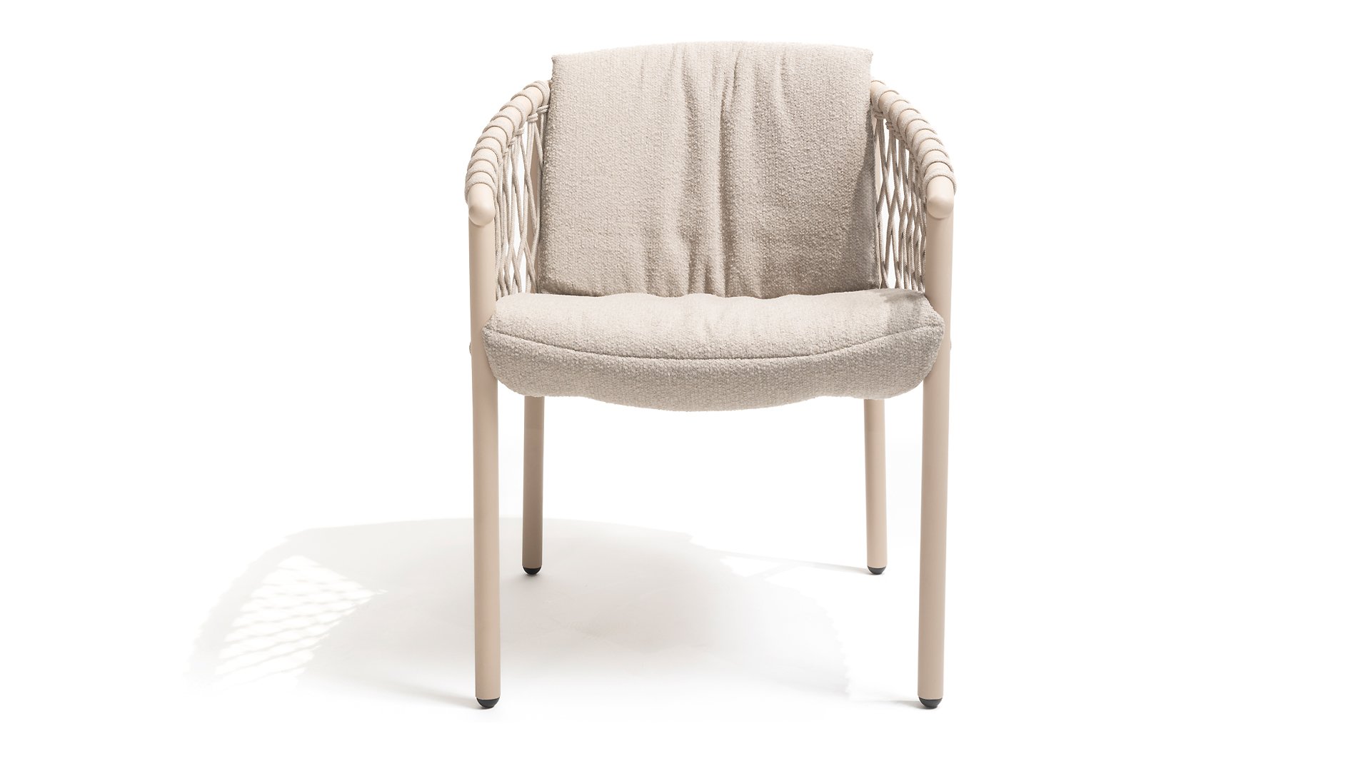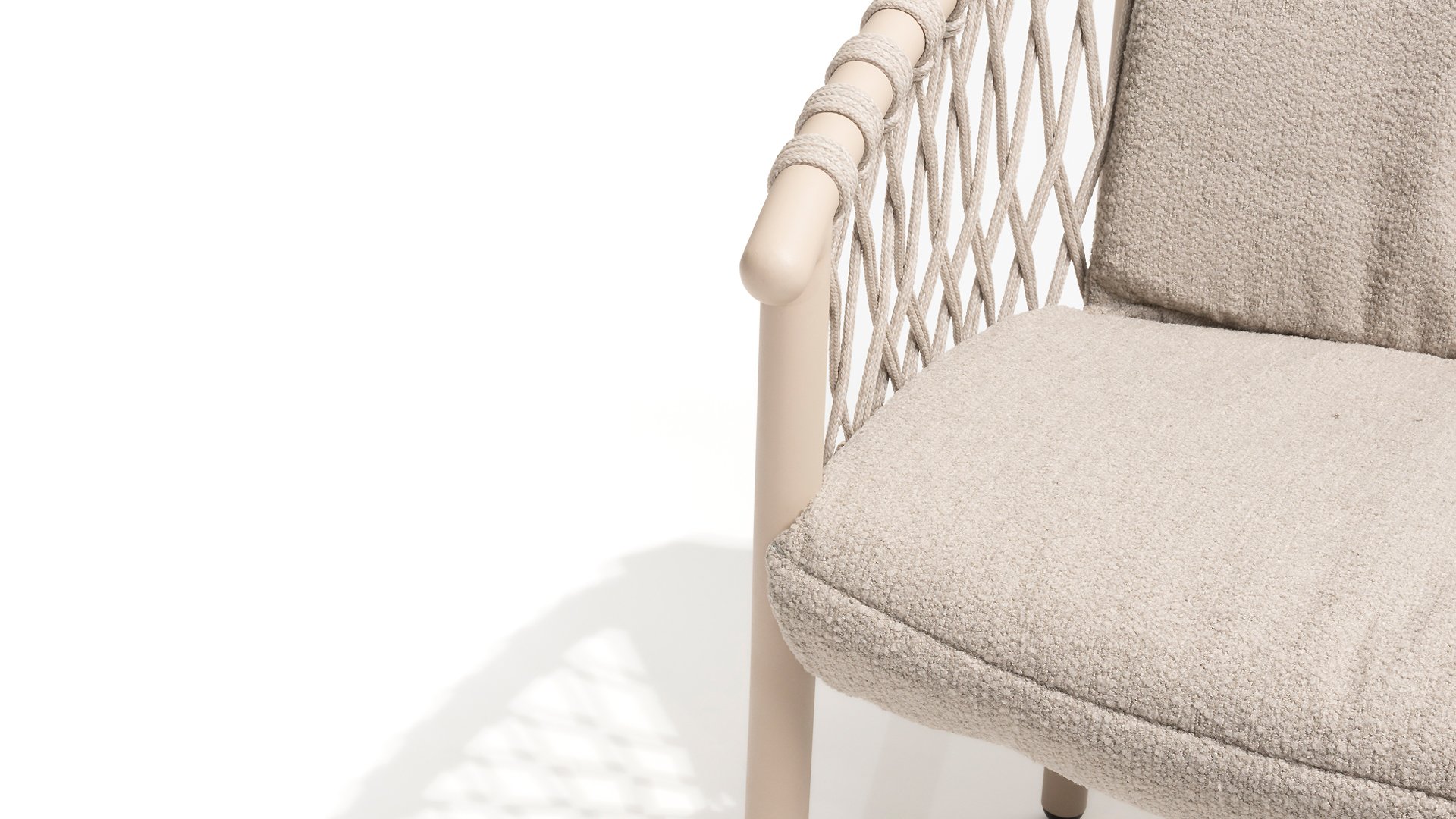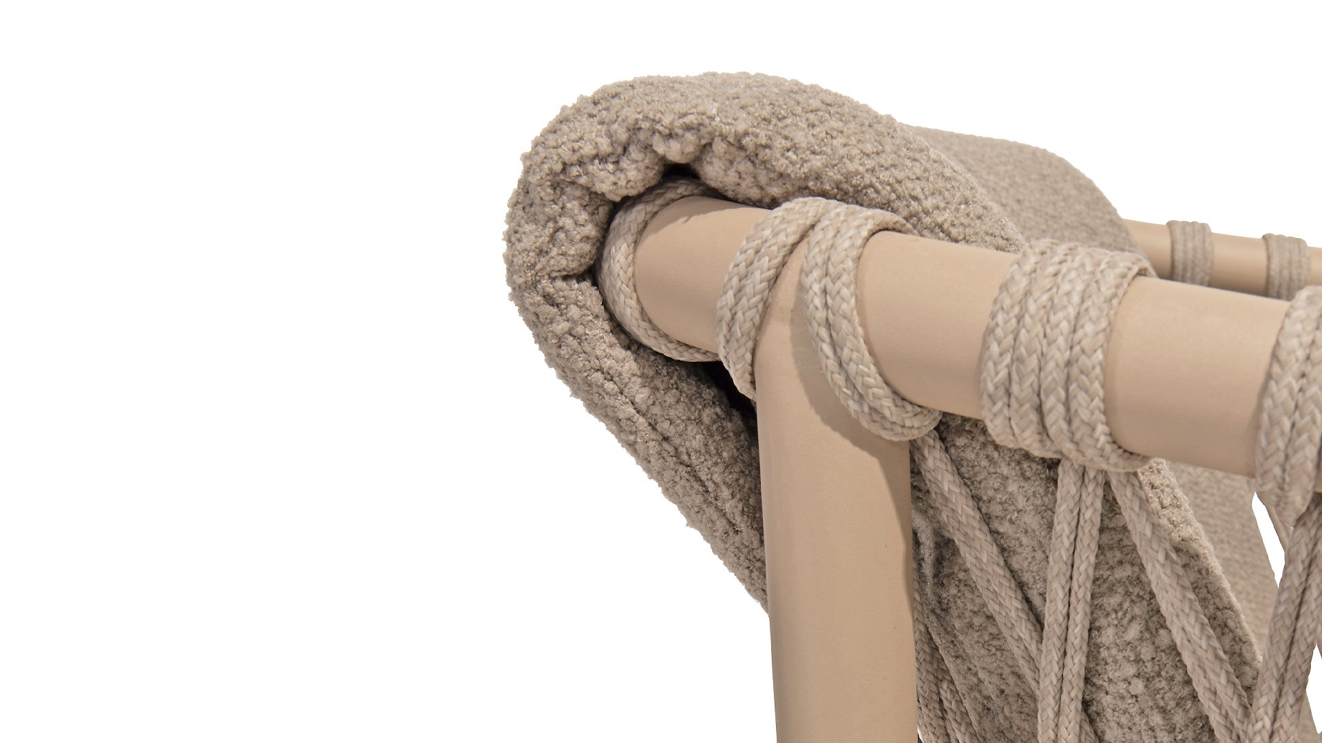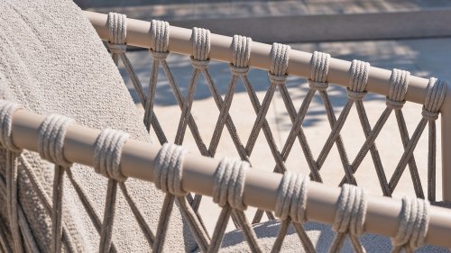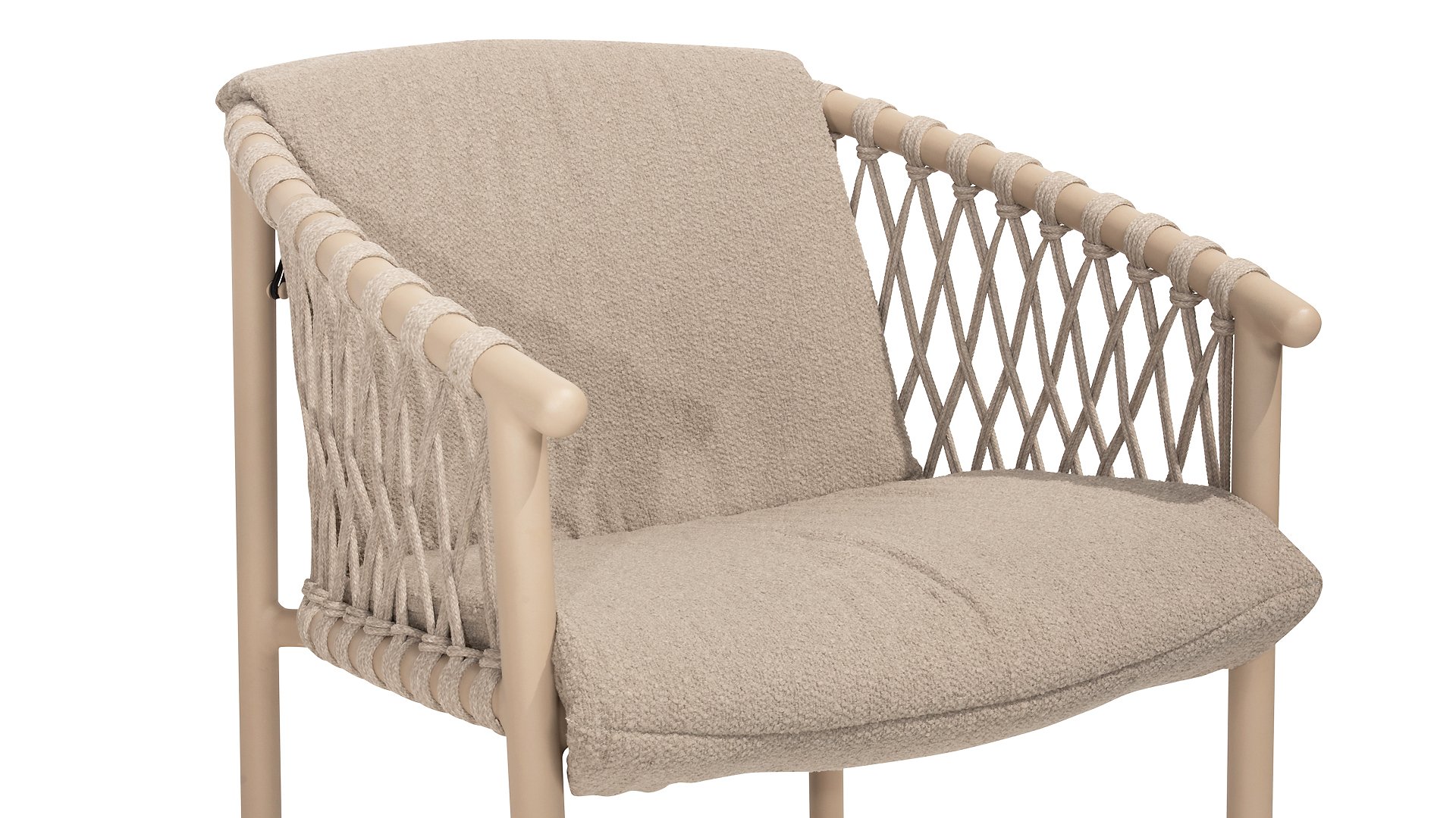 Der Sitzbezug besteht aus Olefin, einem synthetischen Material, das für seine Festigkeit und Wetterbeständigkeit bekannt ist. Die Bouclé Clay-Polsterung verleiht eine luxuriöse und weiche Textur, die sowohl ästhetisch ansprechend als auch praktisch ist.