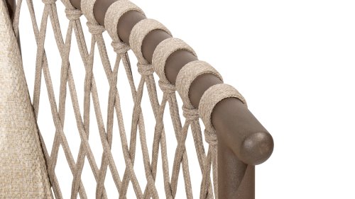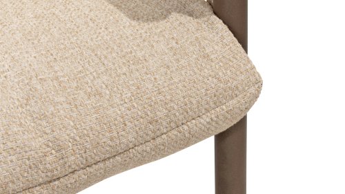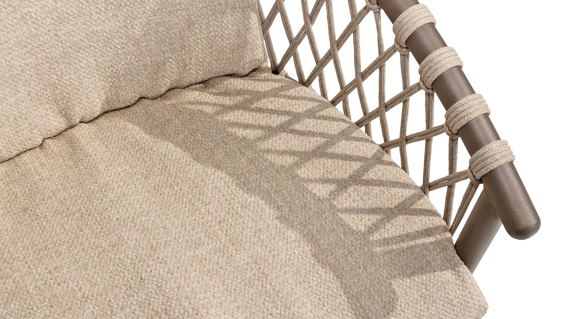 Der Sitzbezug besteht aus Olefin, einem synthetischen Material, das für seine Festigkeit und Wetterbeständigkeit bekannt ist. Die Bouclé Clay-Polsterung verleiht eine luxuriöse und weiche Textur, die sowohl ästhetisch ansprechend als auch praktisch ist.
