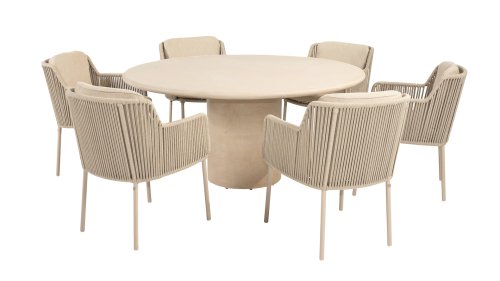 Verleihen Sie Ihrem Außenbereich mit dem 4 Seasons Outdoor Bernini Gartenmöbel-Set in der neuen Farbe Latte ein stilvolles Upgrade. Dieses luxuriöse Esszimmer-Set ist vom legendären italienischen Künstler Bernini inspiriert, der für seine fließenden Linien und sein raffiniertes Design bekannt ist. Diese Eleganz spiegelt sich in den modernen, abgerundeten Schalenstühlen und der hochwertigen Verarbeitung dieses trendsetzenden Gartenmöbel-Sets wider.