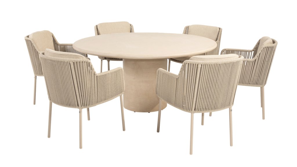 Der Hampton ist aus hochwertigem Mortex gefertigt, einem langlebigen und wasserfesten Material, das für seine natürliche Optik und außergewöhnliche Wetterbeständigkeit bekannt ist. Jede Tischplatte wird von Hand bearbeitet und schafft so einen einzigartigen, warmen Look, der sowohl moderne als auch mediterrane Gärten perfekt ergänzt.