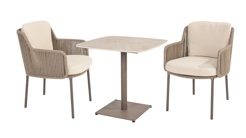 Dieser 75x75cm große Tisch verfügt über eine elegante Keramikplatte, die sowohl stilvoll als auch praktisch ist. Die Keramik ist nicht nur langlebig und leicht zu reinigen, sondern bietet auch eine luxuriöse Optik. Die Basis ist in einem warmen, erdigen Farbton namens Terre gehalten, der perfekt zu modernen und rustikalen Innenräumen/Gärten passt.