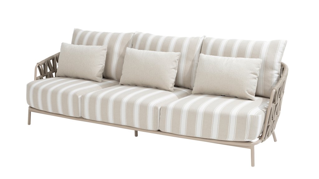 Der Rahmen besteht aus robustem, pulverbeschichtetem Aluminium in einem warmen Sandton und ist mit handgeflochtenem Rope in einem eleganten Muster versehen. Die dicken Kissen bieten nicht nur eine luxuriöse Optik, sondern auch hervorragenden Sitzkomfort. Die Olefin-Kissenbezüge sind wetterfest, farbecht und schnelltrocknend – ideal für das niederländische Klima.