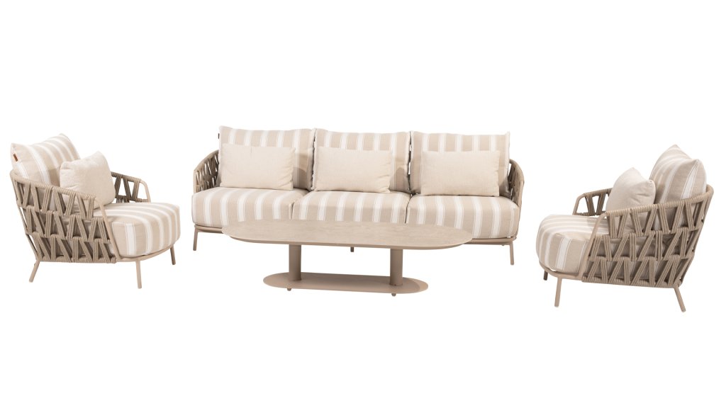 Der Rahmen besteht aus robustem, pulverbeschichtetem Aluminium in einem warmen Sandton und ist mit handgeflochtenem Rope in einem eleganten Muster versehen. Die dicken Kissen bieten nicht nur eine luxuriöse Optik, sondern auch hervorragenden Sitzkomfort. Die Olefin-Kissenbezüge sind wetterfest, farbecht und schnelltrocknend – ideal für das deutsche Klima.