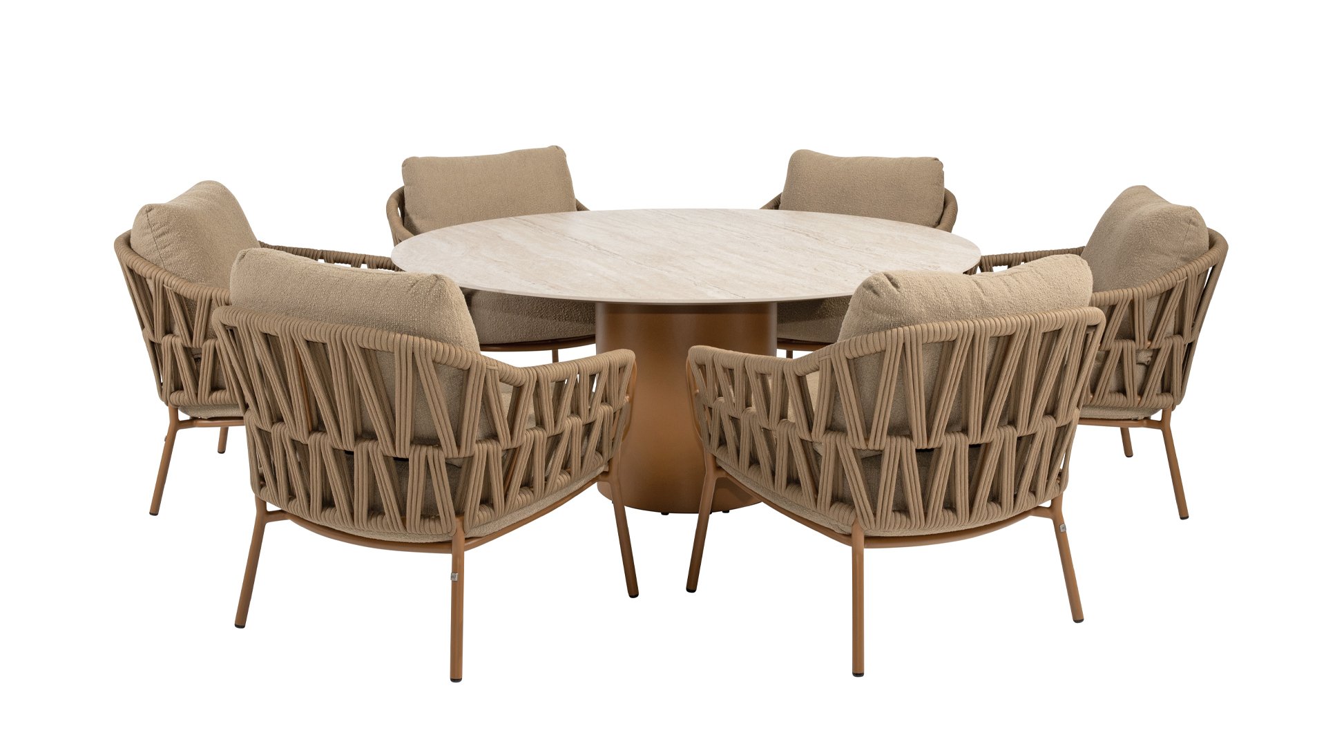 Der Name Biarritz erinnert an das glamouröse französische Badeort, berühmt für seine elegante Atmosphäre und seine feine Kultur. Diese Möbel sind ebenso stilvoll und zeitlos wie das ikonische Resort an der Atlantikküste. Das warme, bernsteinfarbene Gestell erinnert an die Sonnenuntergänge über dem Ozean, während die luxuriösen Kissen den Komfort bieten, den man nach einem Tag am Strand oder in der Stadt verdient.