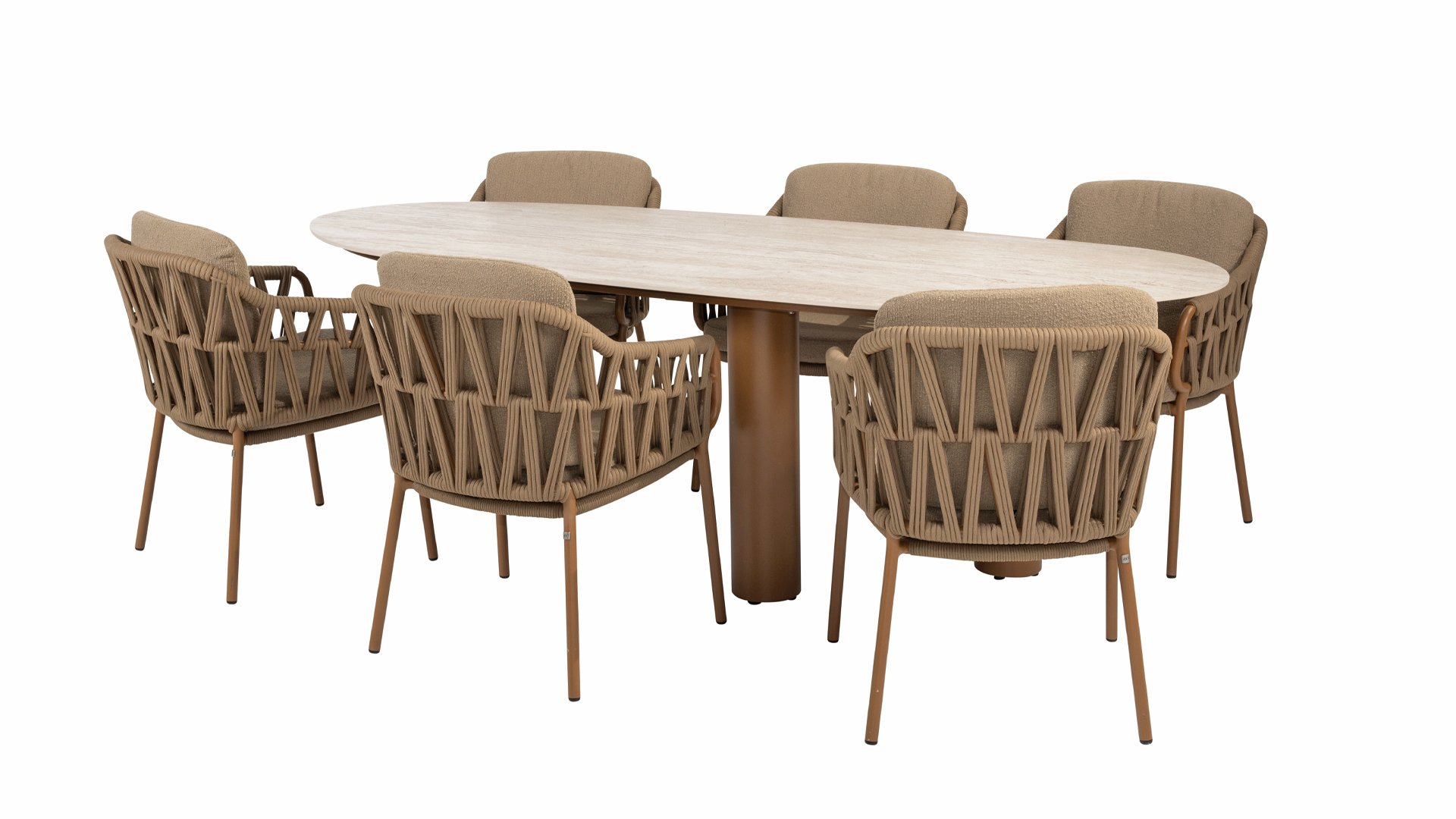 Der robuste Rahmen besteht aus pulverbeschichtetem Aluminium in einem warmen Erdton, kombiniert mit einem auffallend dicken Seilgeflecht. Diese handwerkliche Verarbeitung verleiht der Biarritz-Serie ein robustes und zugleich edles Aussehen. Die wetterbeständigen Olefin-Kissenbezüge sind UV- und schimmelresistent – ideal für jahrelangen Einsatz im Freien.