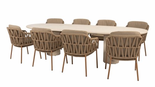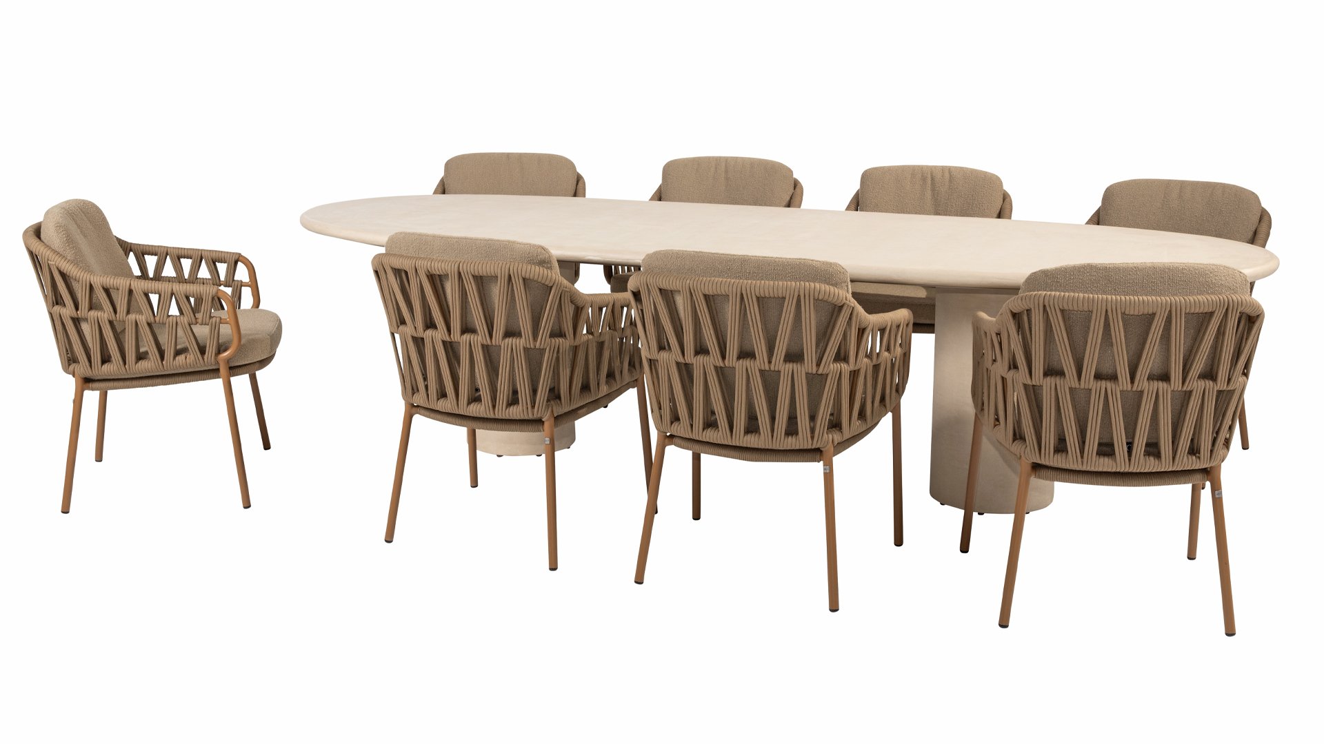 Der Tisch ist in verschiedenen Größen erhältlich, sodass Sie immer den passenden Hampton für Ihren Außenbereich finden. Wählen Sie die runde Version mit Ø160cm für eine gemütliche Atmosphäre mit einem einzelnen, eleganten Mittelbein oder die großzügigen ovalen Versionen mit 240cm oder 300cm. Beide verfügen über zwei schlanke, vertikale Beine, die für Stabilität und ein markantes, geradliniges Design sorgen. Für alle, die ein entspannteres Essen bevorzugen, gibt es auch eine Low-Dining Version Ø160cm, ideal für entspannte Momente im Lounge-Stil.