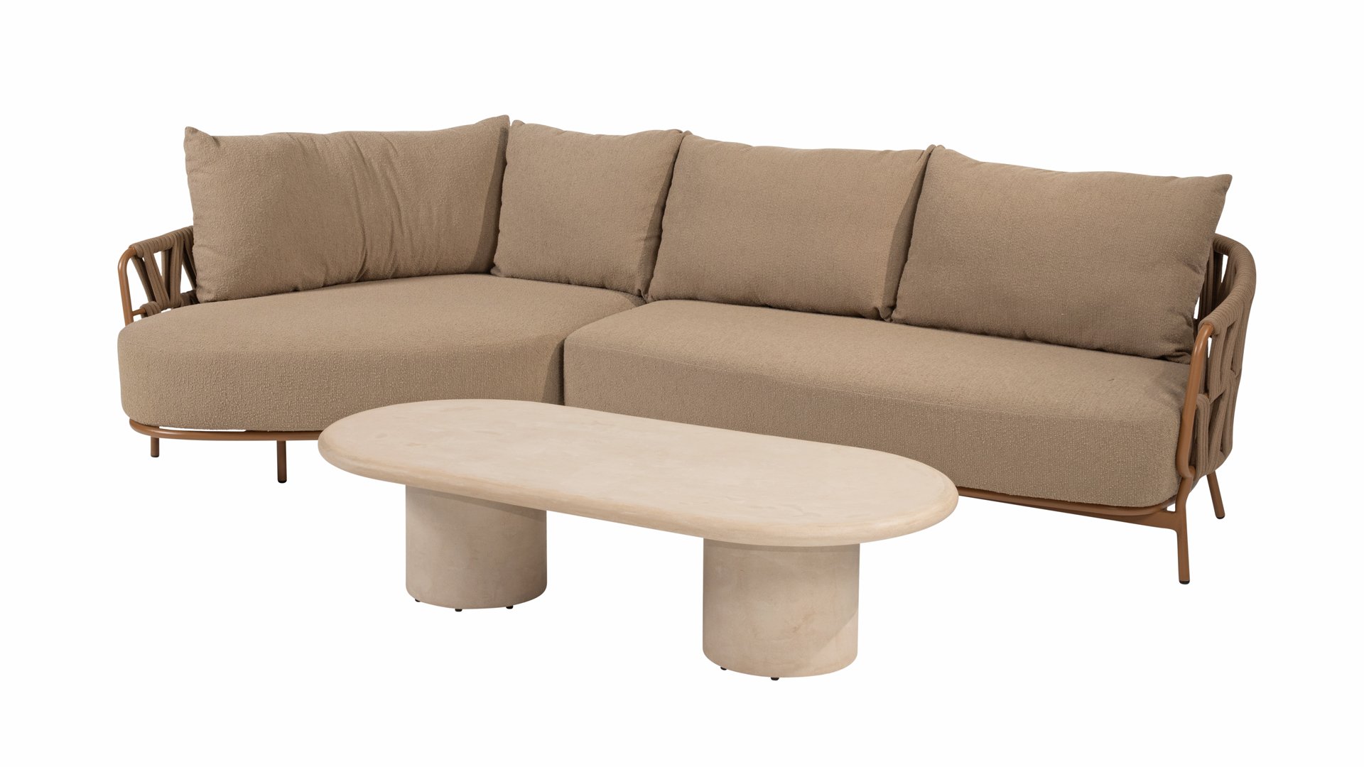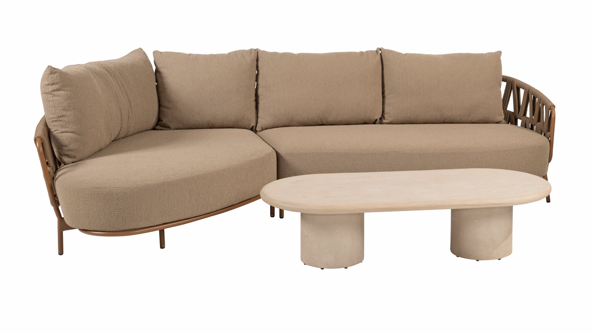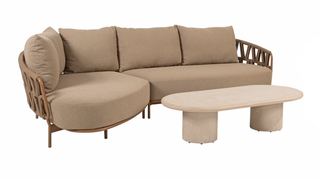 Der robuste Rahmen besteht aus pulverbeschichtetem Aluminium in einem warmen Erdton, kombiniert mit einem auffallend dicken Seilgeflecht. Diese handwerkliche Verarbeitung verleiht der Biarritz -Serie ein robustes und zugleich edles Aussehen. Die geräumigen Sitzflächen, die prallen Kissen und die weichen Texturen machen diese Lounge zu einem luxuriösen Ort für lange Sommertage.