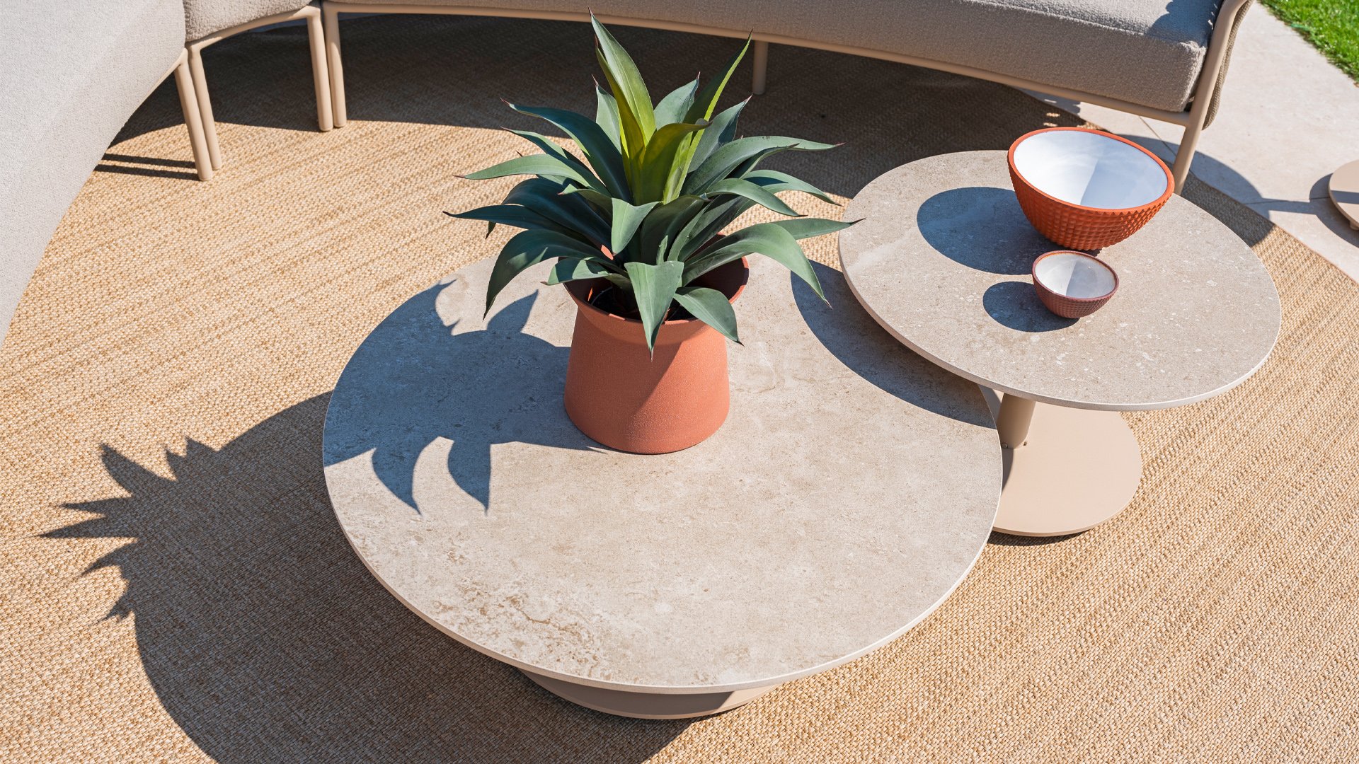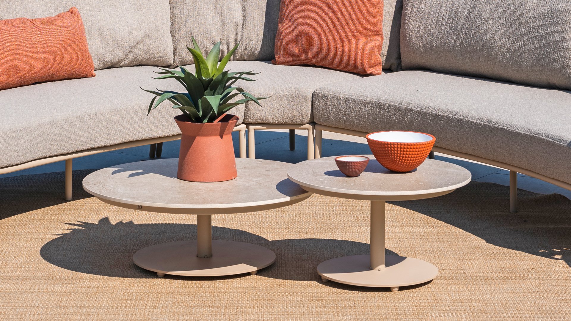 Die Boaz-Tischserie besteht aus 3 Größen und 2 Farben Terre und Latte.