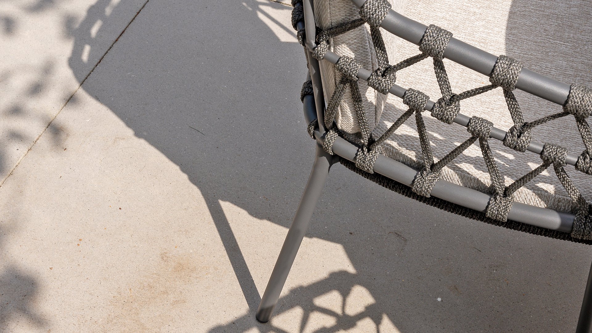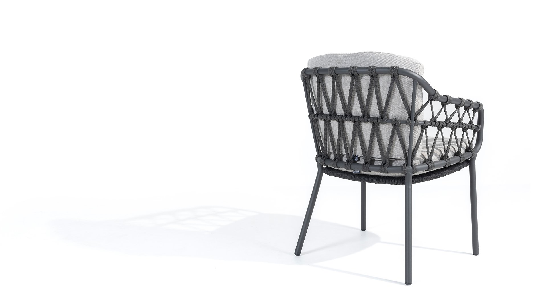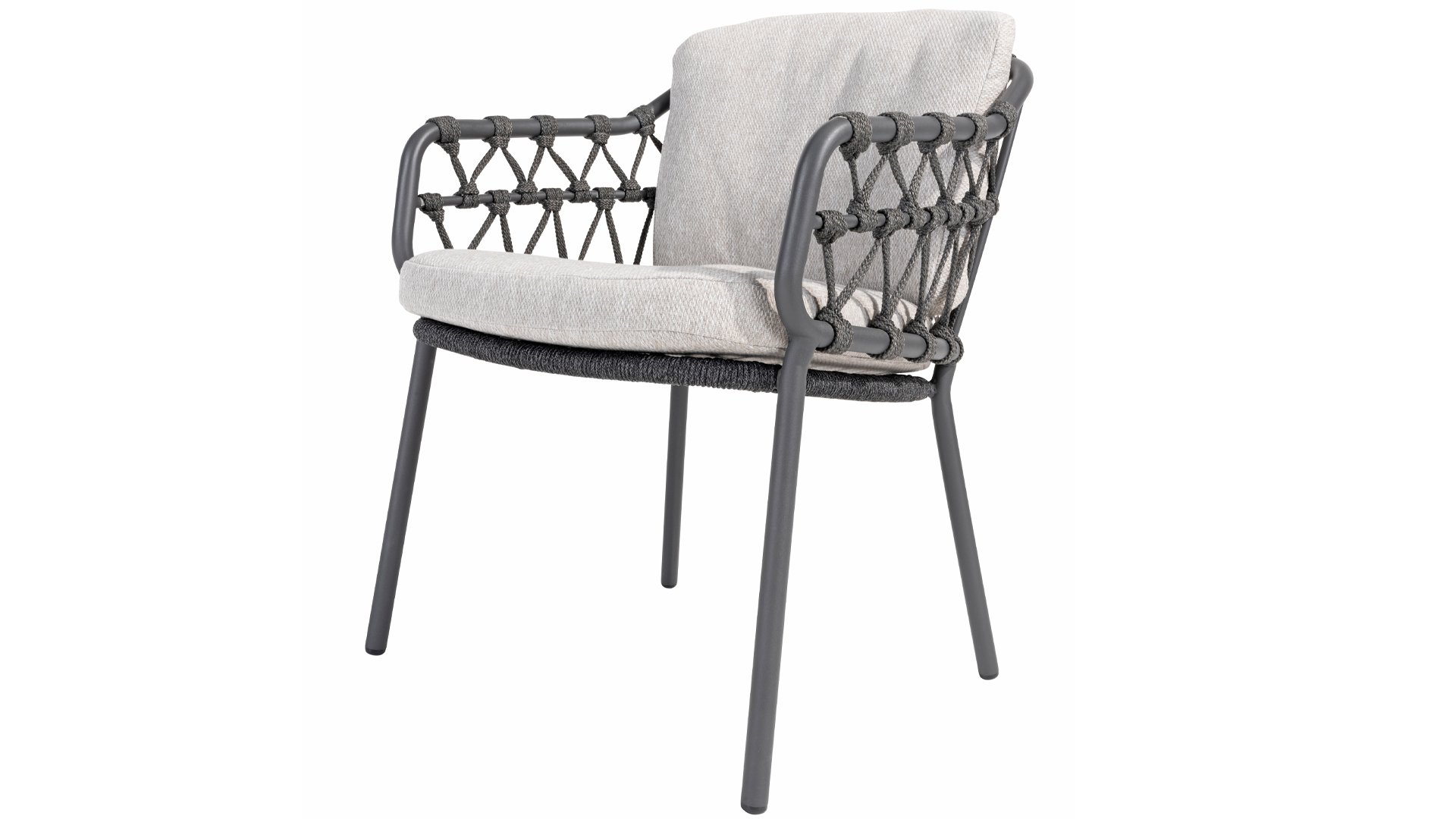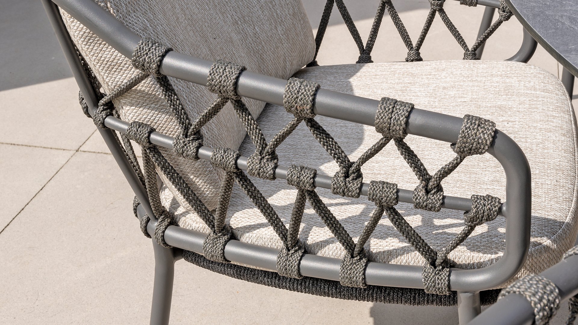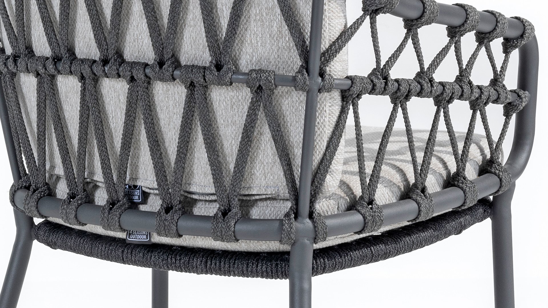 Der 4Seasons Calpi-Dining Stuhl besteht aus einer Edelstahlbasis mit Ropeteilen, die gegen verschiedene Witterungseinflüsse beständig sind.