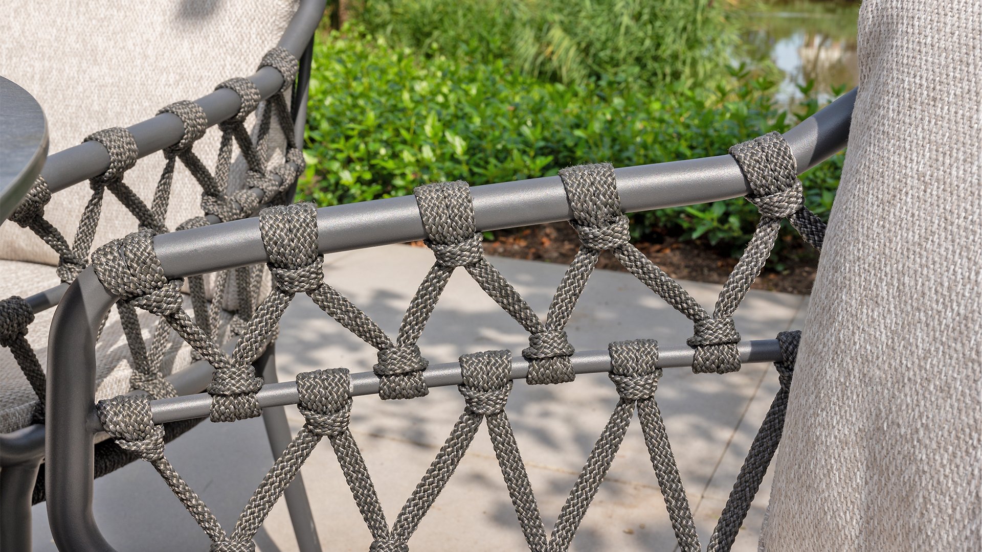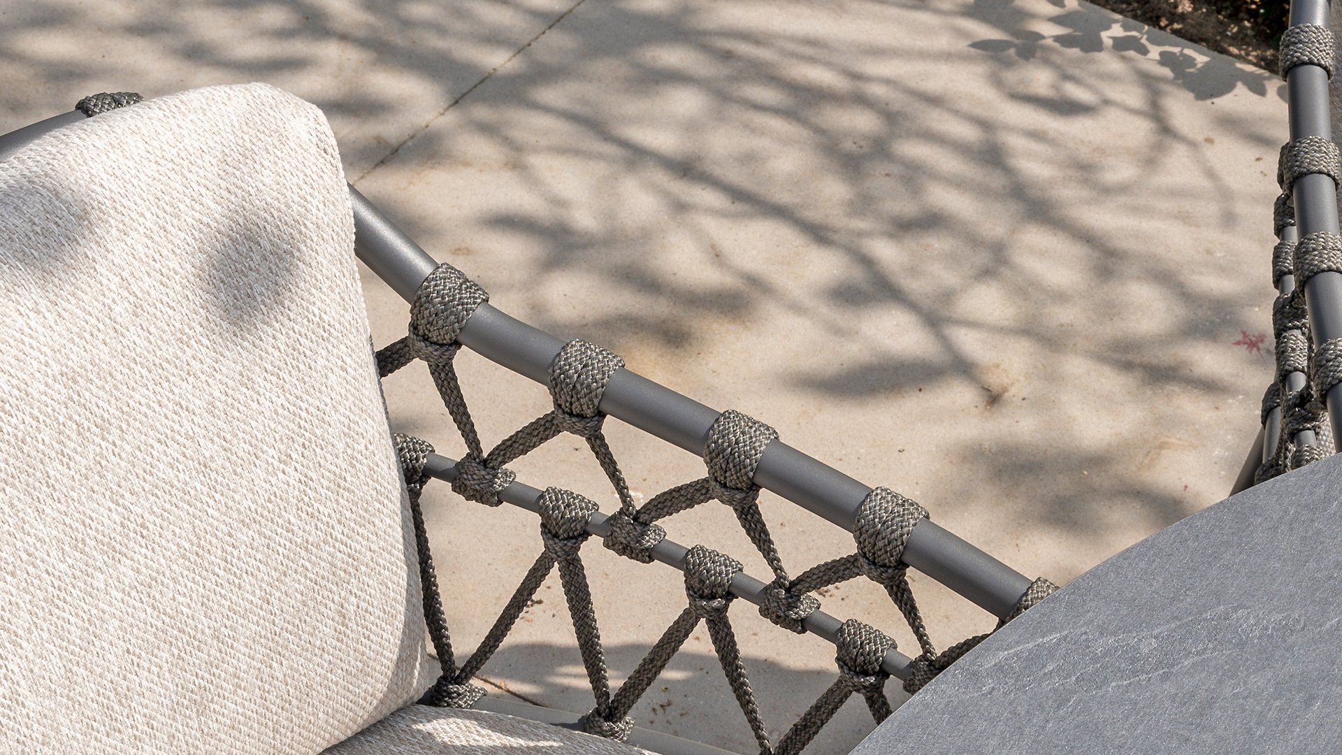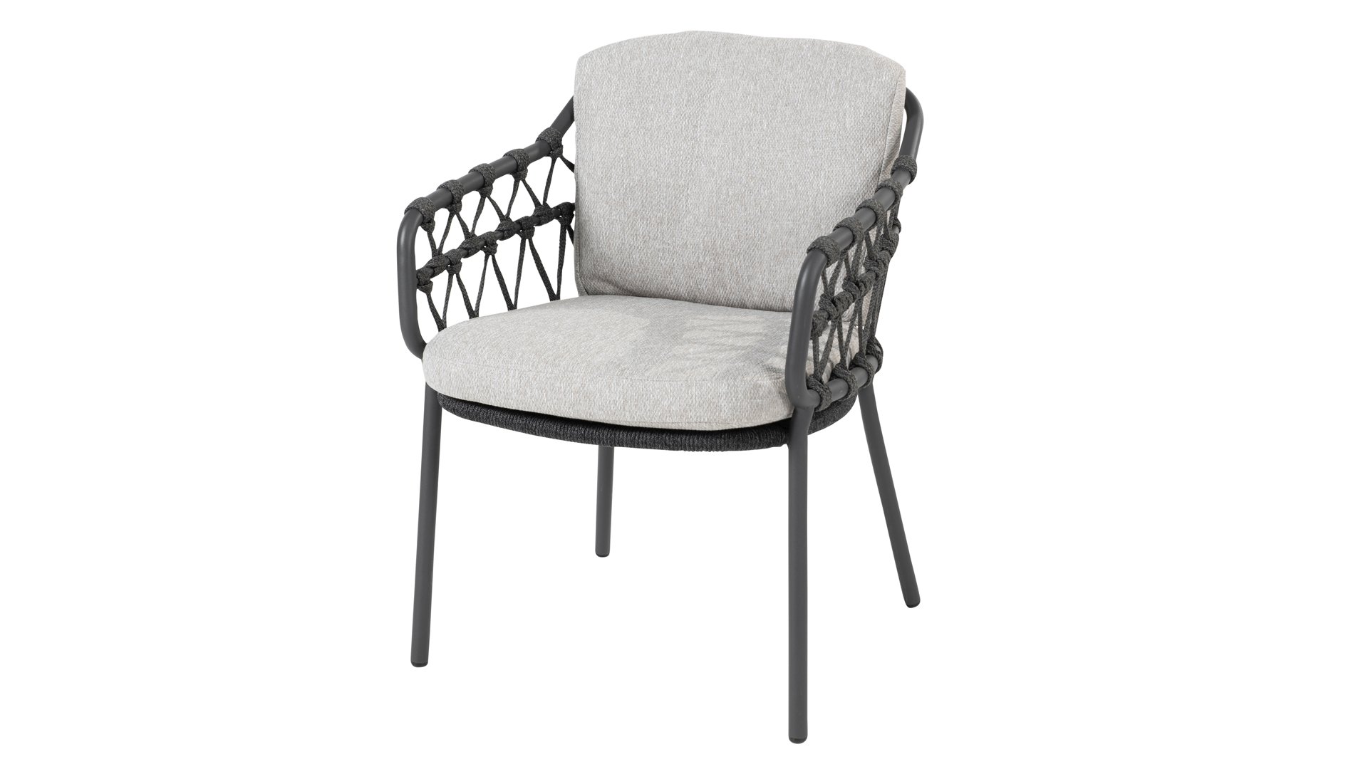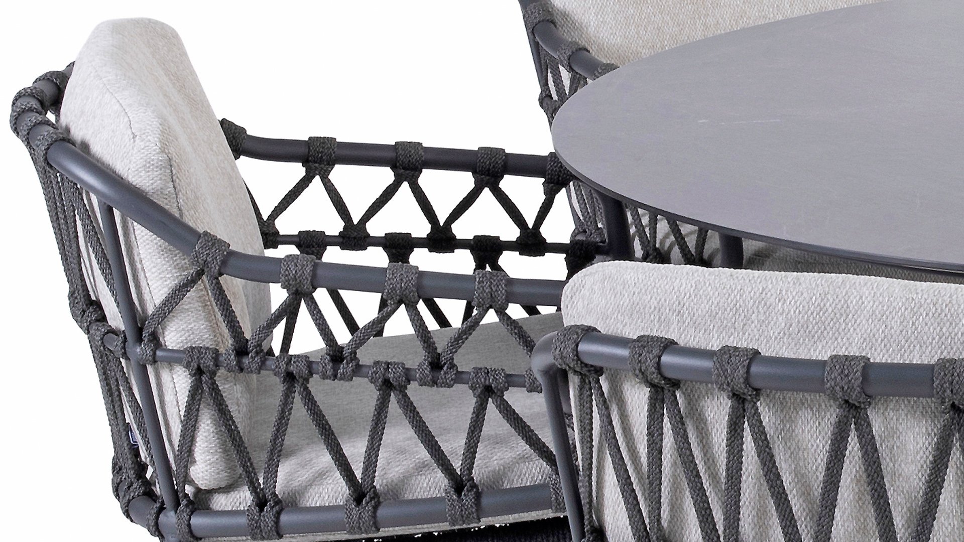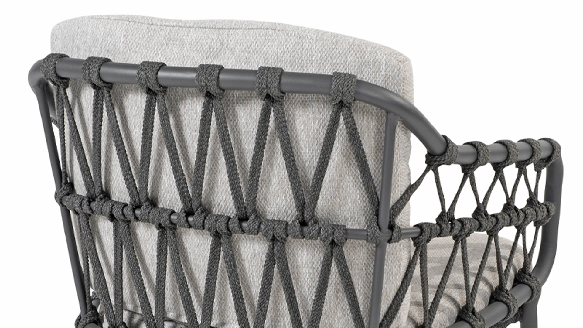 Der 4Seasons Calpi-Dining Stuhl besteht aus einer Edelstahlbasis mit Ropeteilen, die gegen verschiedene Witterungseinflüsse beständig sind.