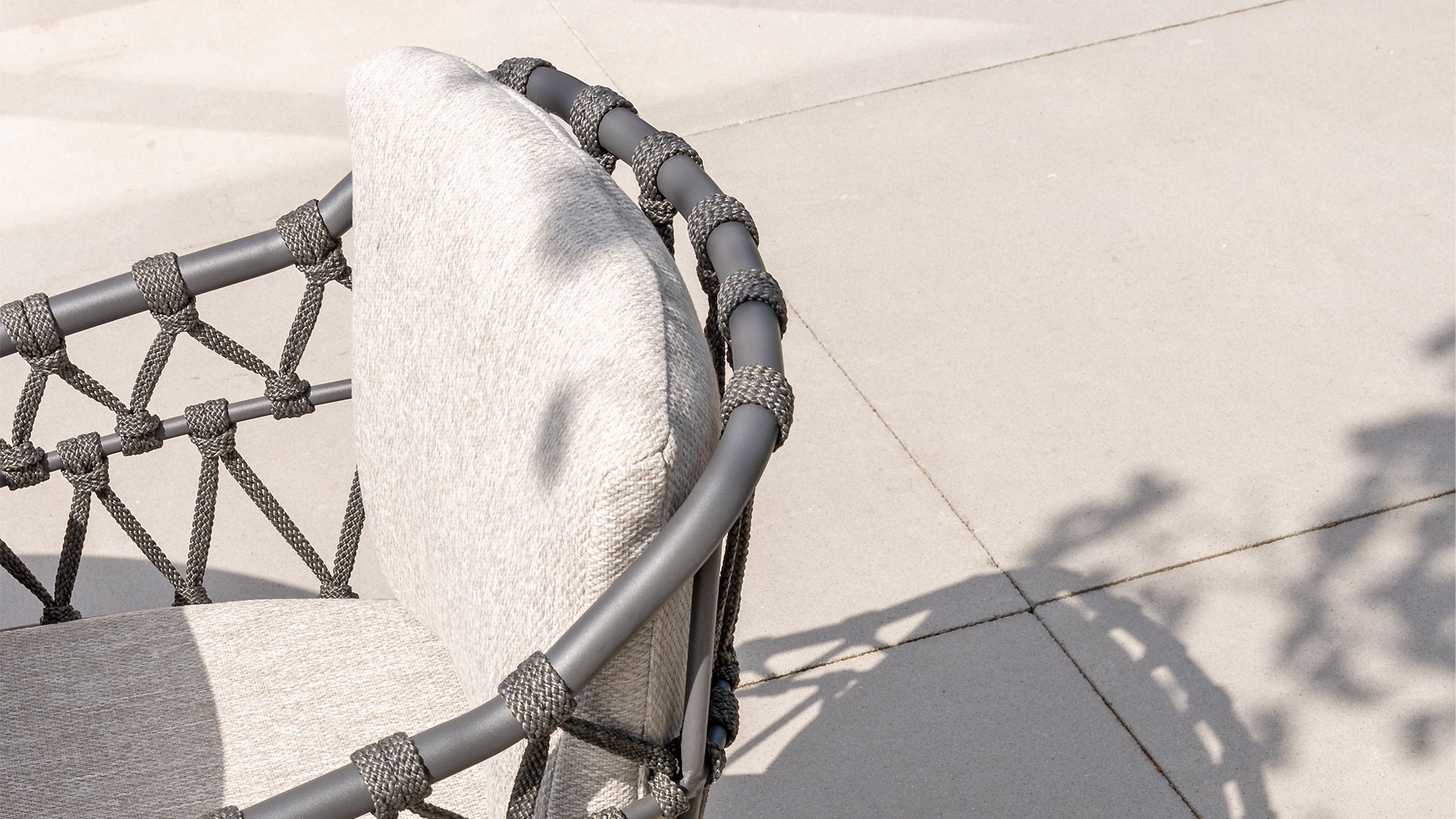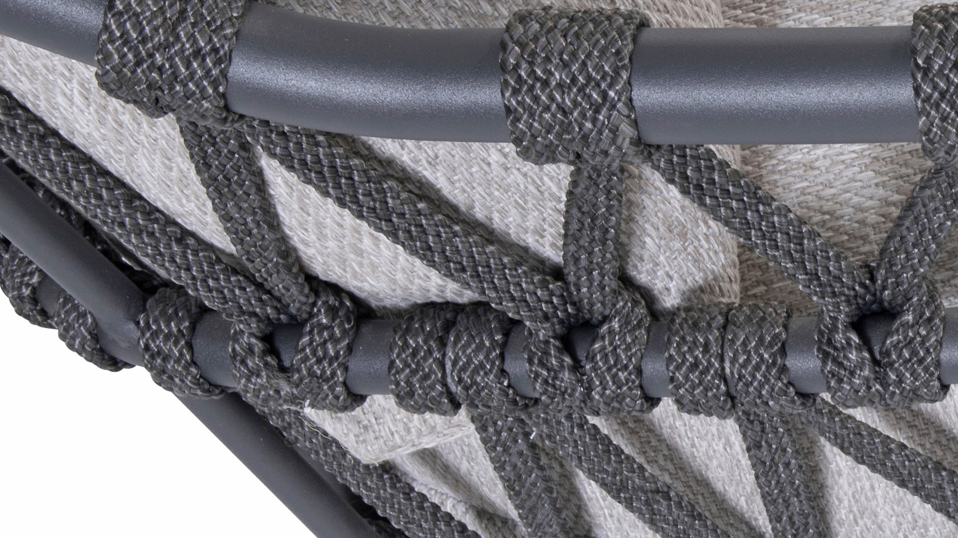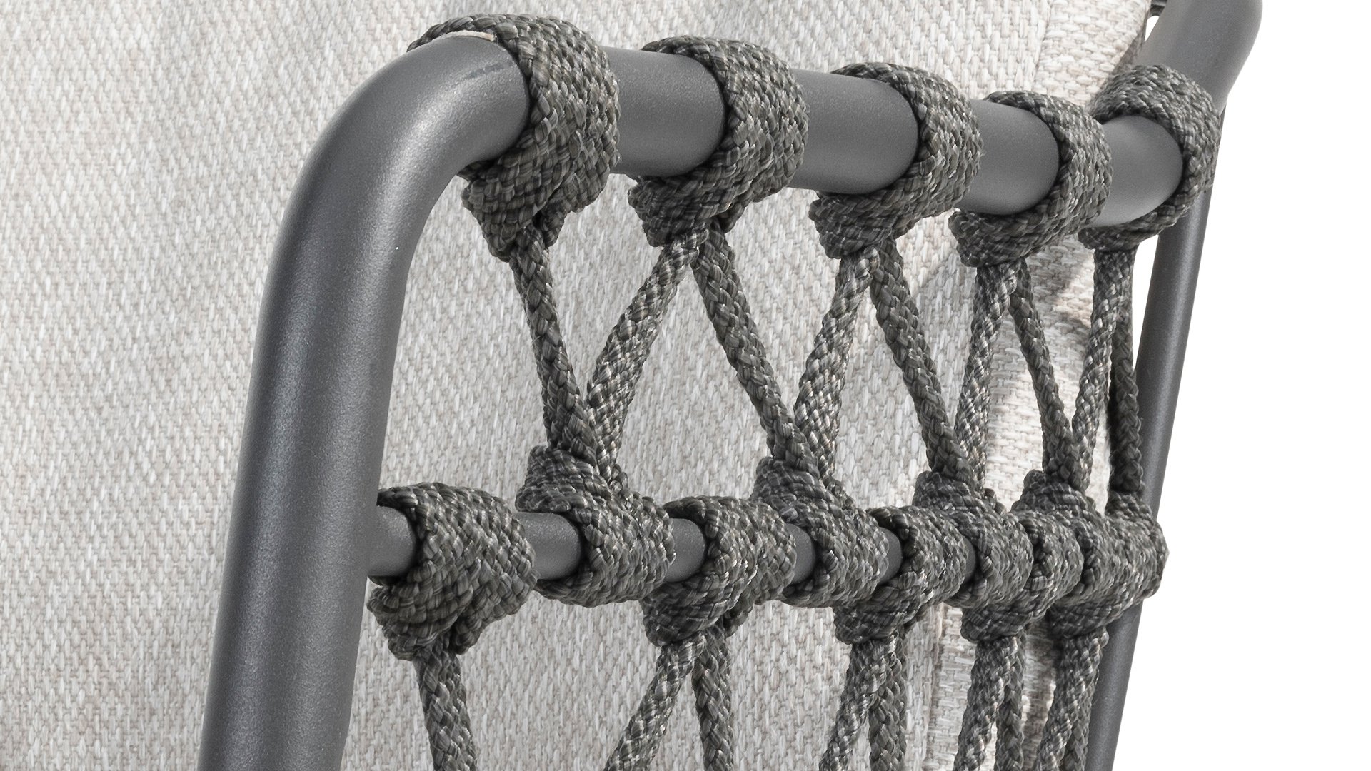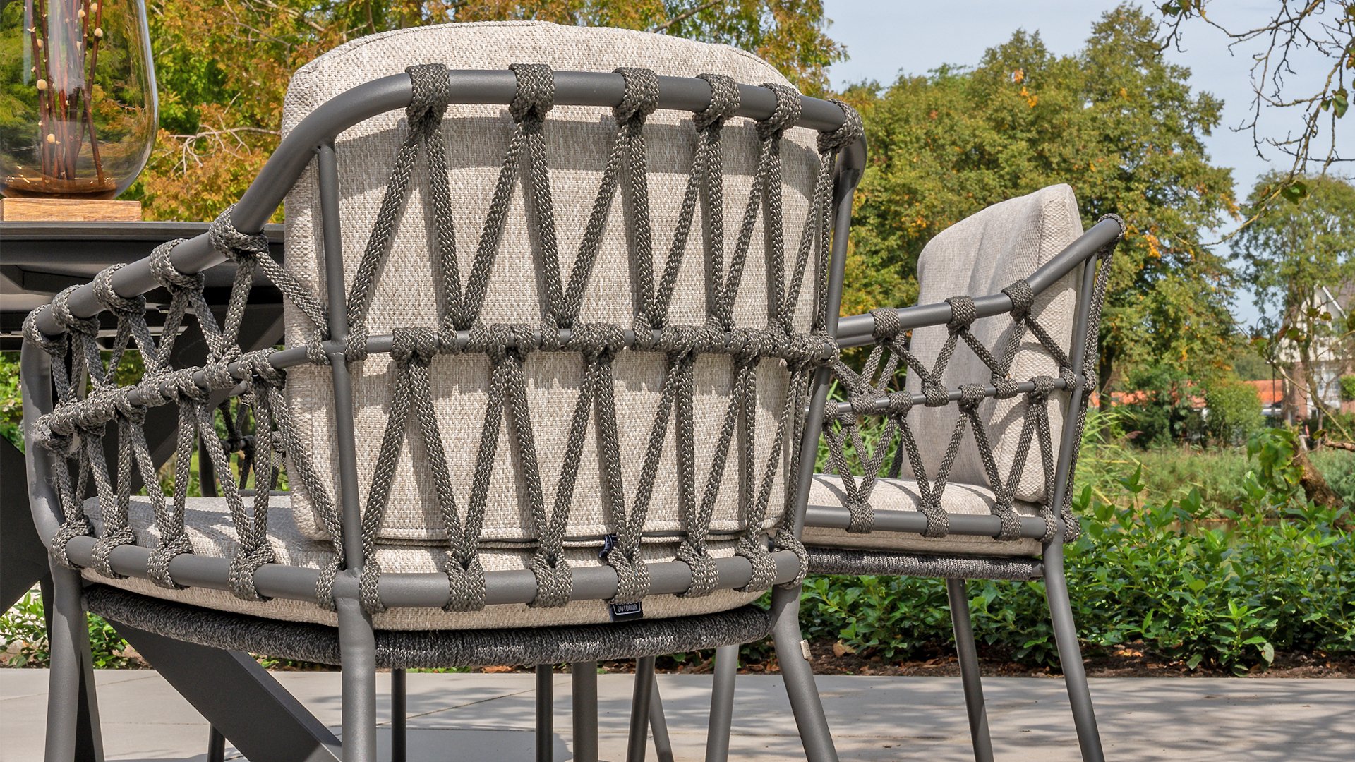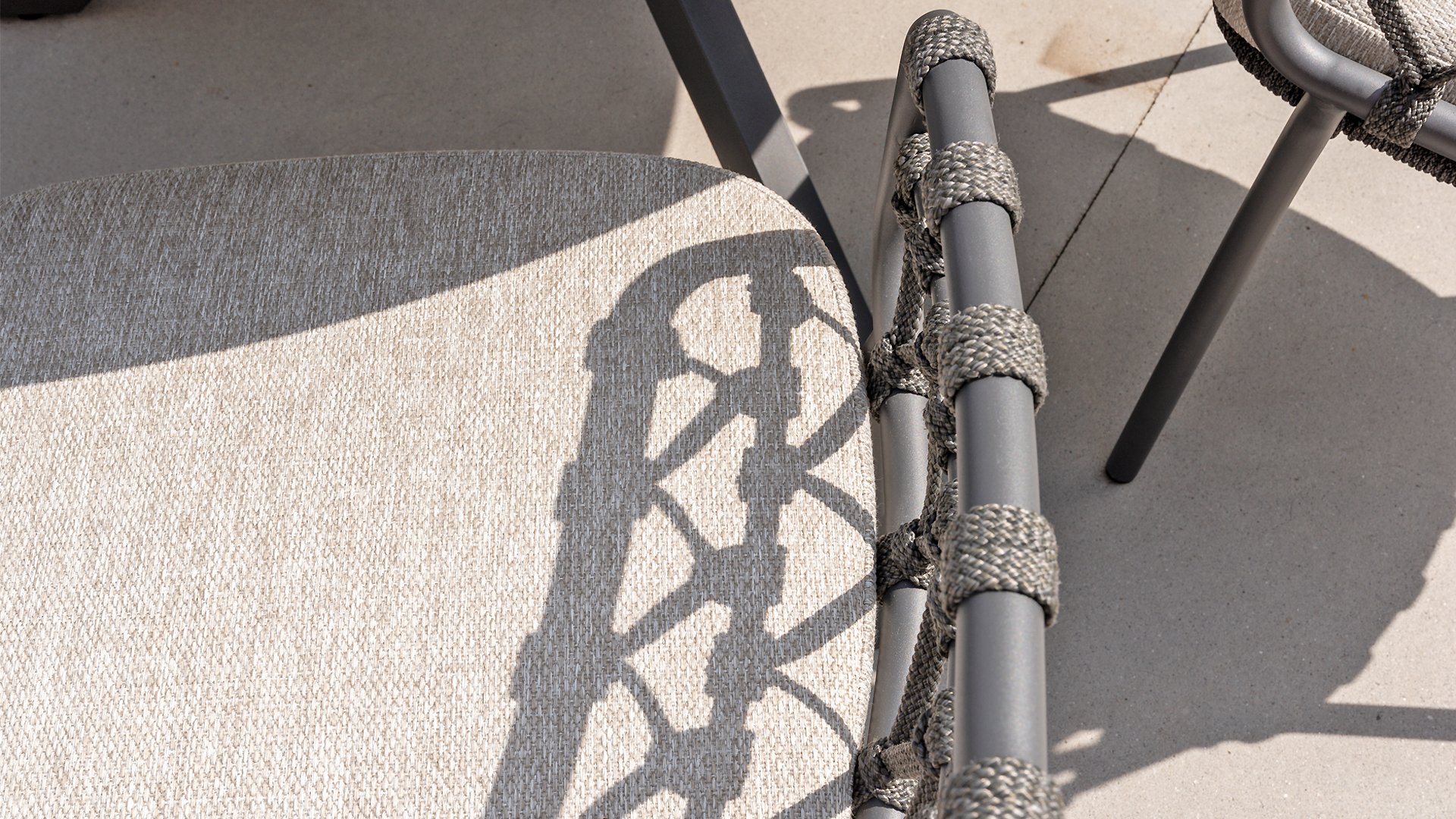 Der 4Seasons Calpi-Dining Stuhl besteht aus einer Edelstahlbasis mit Ropeteilen, die gegen verschiedene Witterungseinflüsse beständig sind.