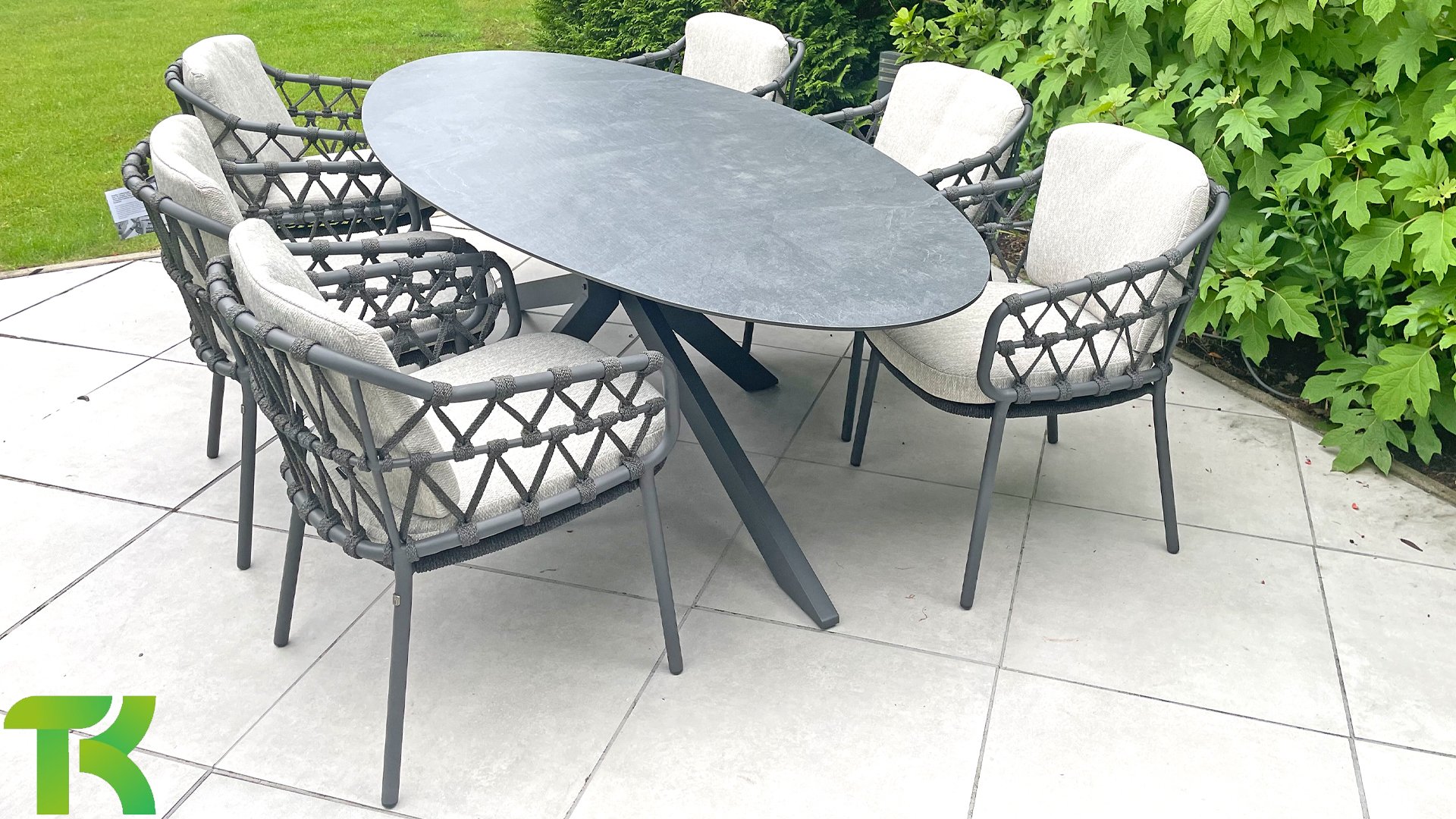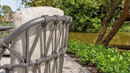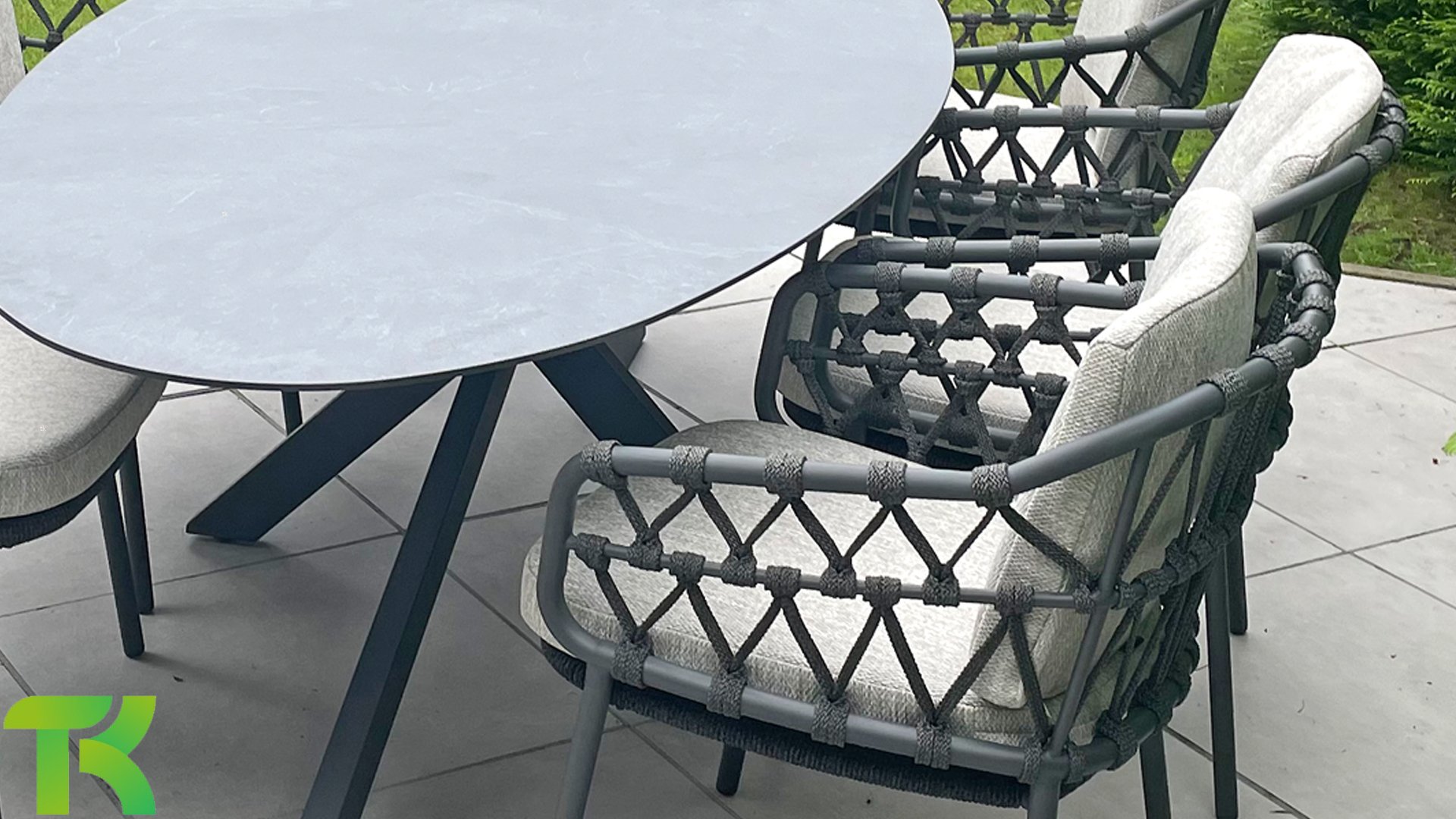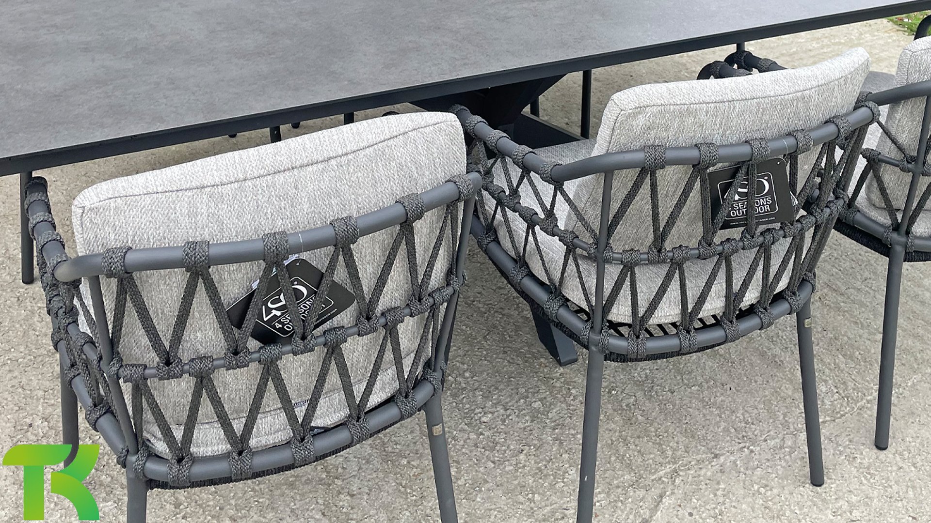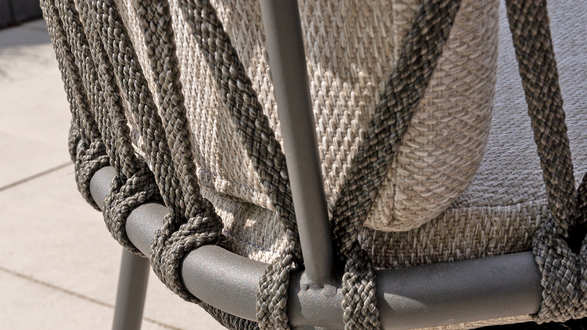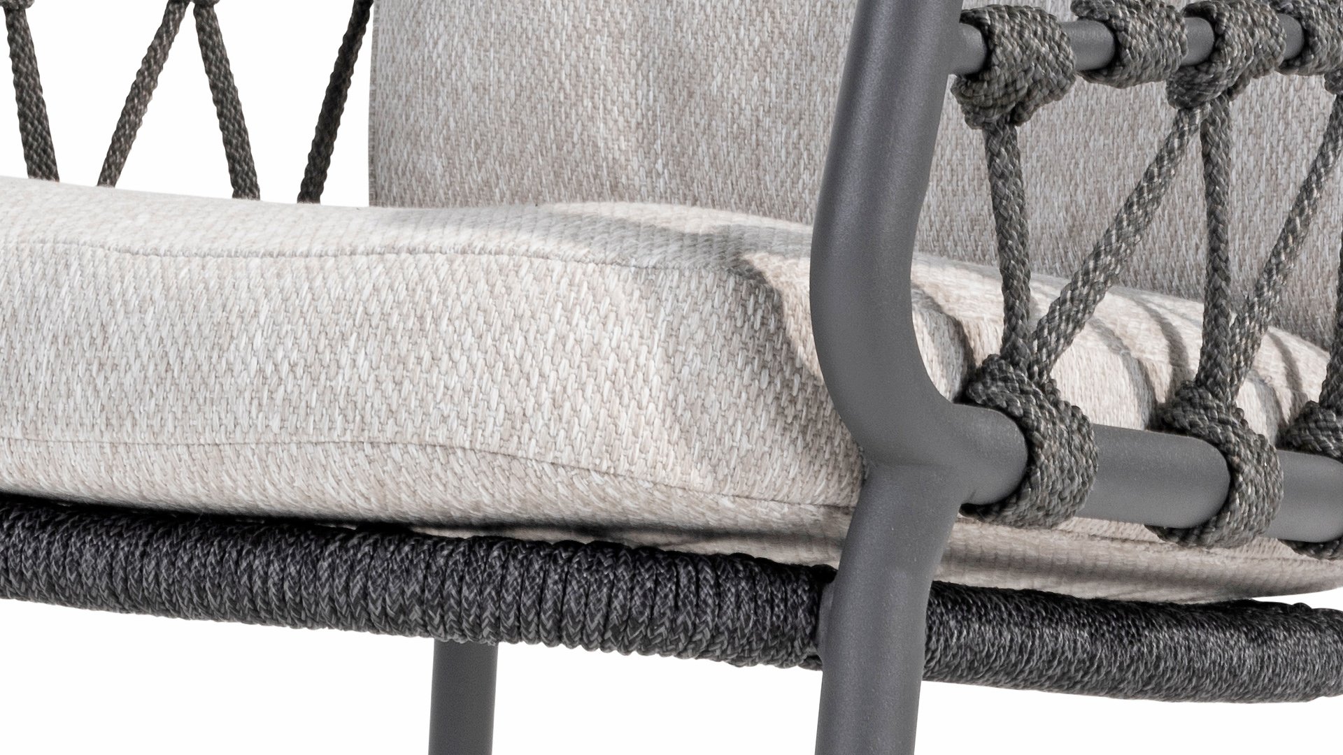 Der 4Seasons Calpi-Dining Stuhl besteht aus einer Edelstahlbasis mit Ropeteilen, die gegen verschiedene Witterungseinflüsse beständig sind.