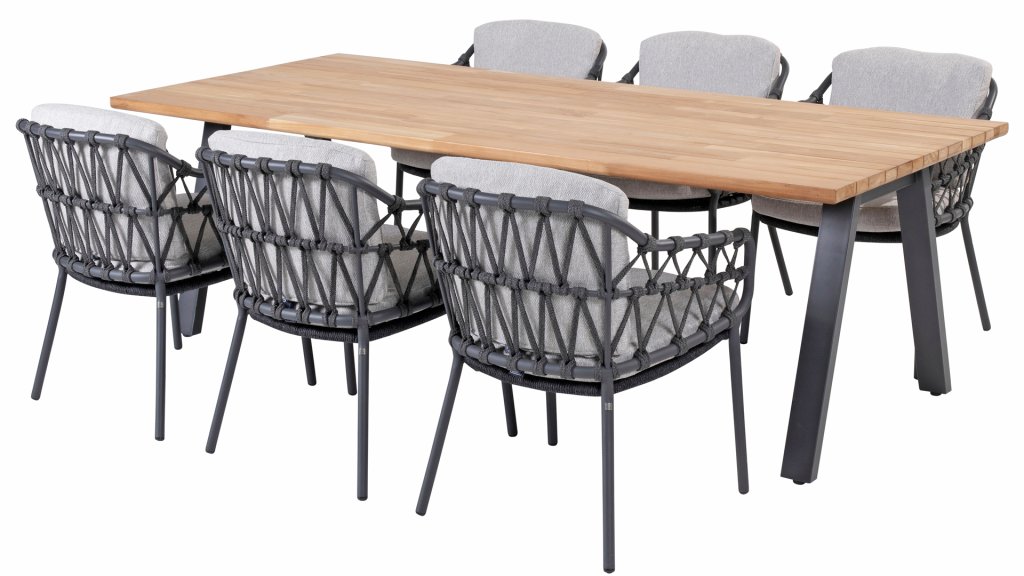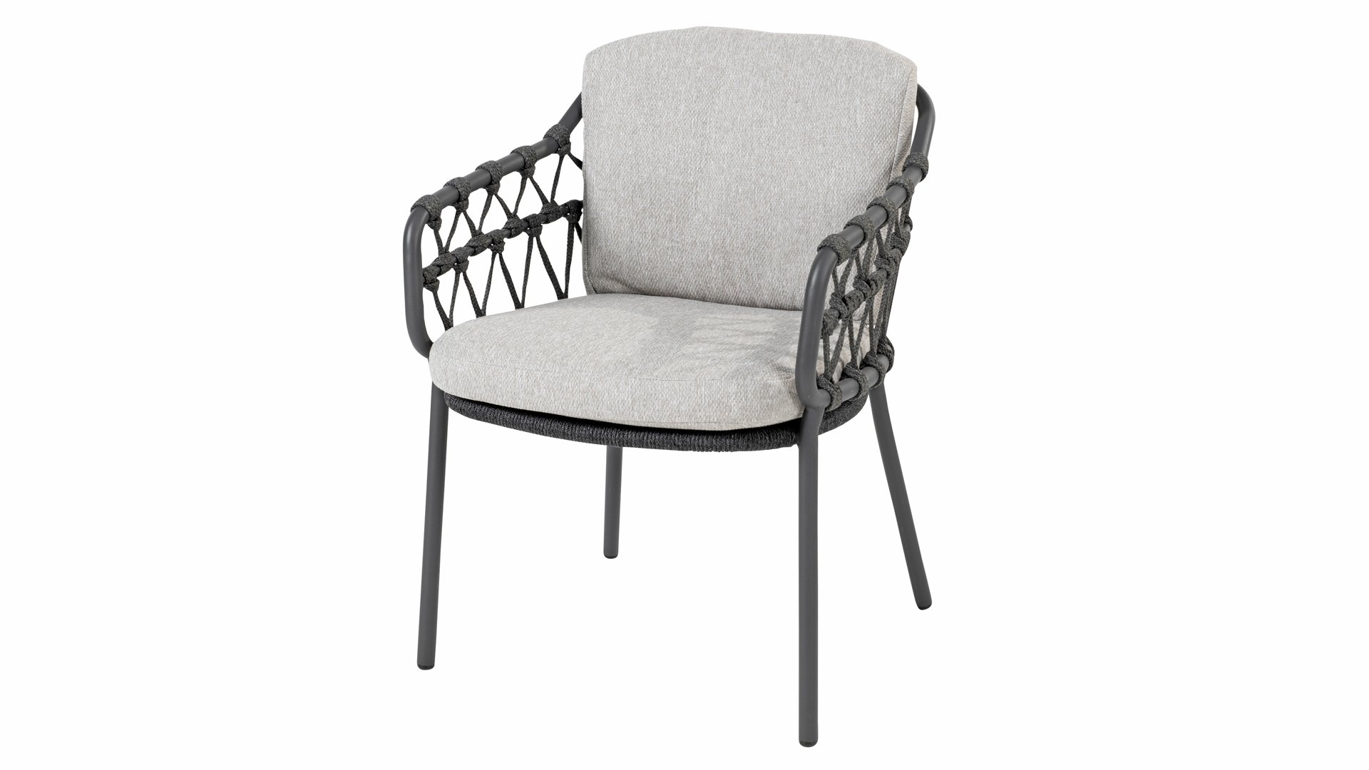 Das Calpi Dining von 4 Seasons Outdoor hat ein zeitgemäßes Design und verleiht jeder Terrasse den hochwertigen Look, den Sie suchen. Die breiten Seilpartien sind auf originelle Weise gewebt und verleihen dem Calpi einen offenen Charakter. Der Calpi wird mit einem Sitz- und Rückenkissen aus wetterfestem Stoff geliefert. Dieser Stoff wirkt wasser- und schmutzabweisend und ist somit widerstandsfähig gegen viele Witterungseinflüsse.