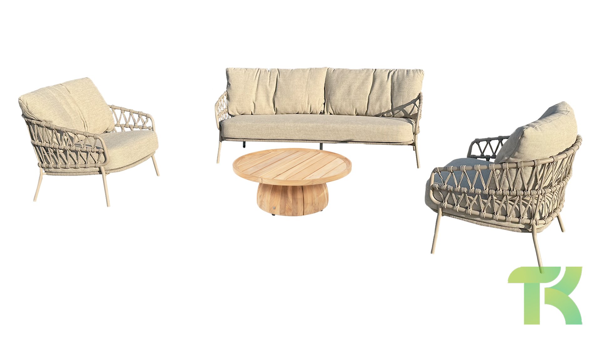 Die 4 Seasons Outdoor Calpi-Serie im neuen Gewand, Latte. Nur bei Gartenmöbel-Rabatt erhältlich! Es verfügt über ein modernes Design und verleiht jeder Terrasse das hochwertige und warme Aussehen, das Sie suchen. Die breiten Seilteile sind auf originelle Weise geflochten und verleihen dem Calpi einen offenen Charakter. Der 4Seasons Calpi wird mit Kissen aus Allwetterstoff geliefert. Dieser Stoff wirkt wasser- und schmutzabweisend und ist somit resistent gegen viele Witterungseinflüsse. Das Gestell besteht aus pulverbeschichtetem Edelstahl, wodurch sich das 4SO Calpi Loungegruppe sehr gut für den ganzjährigen Aufenthalt im Freien eignet.