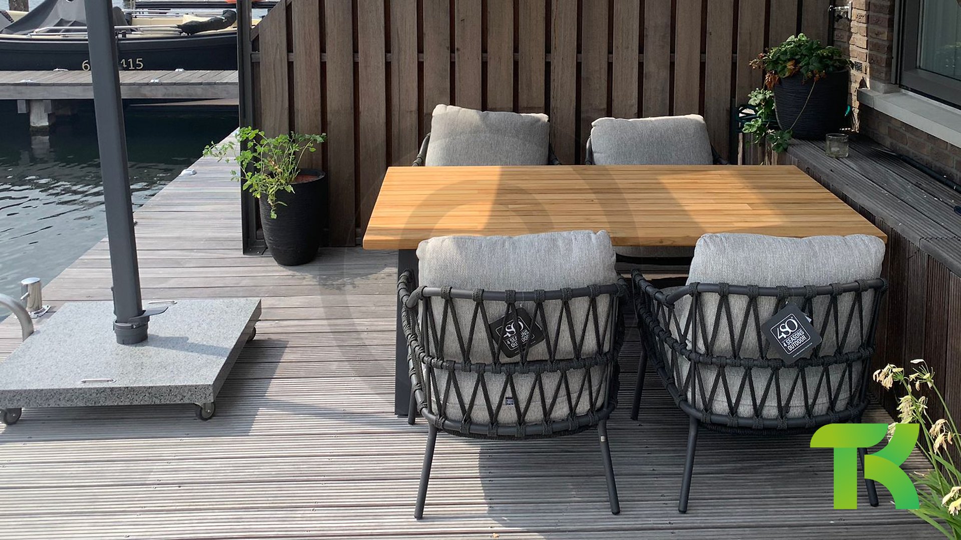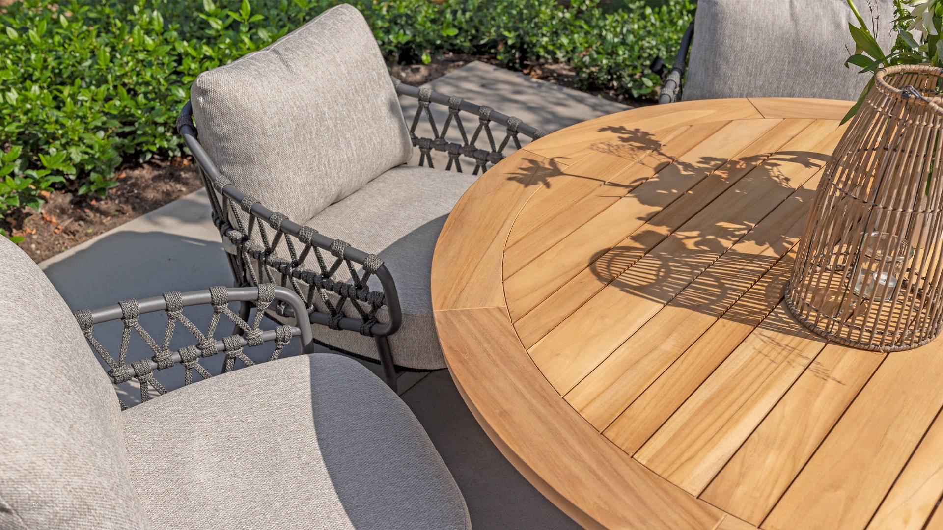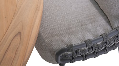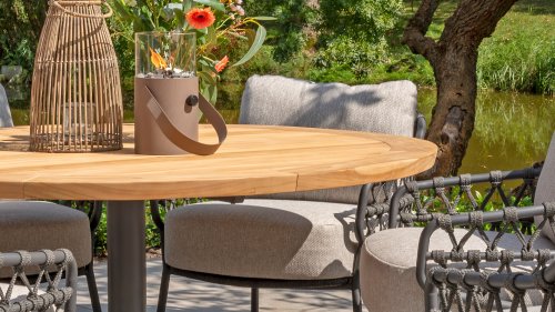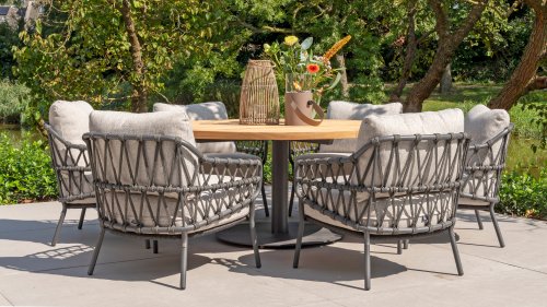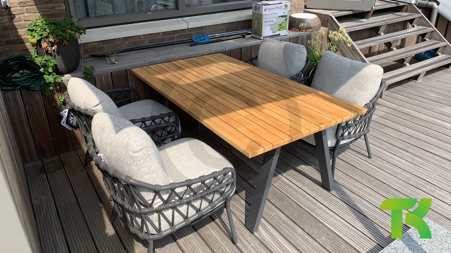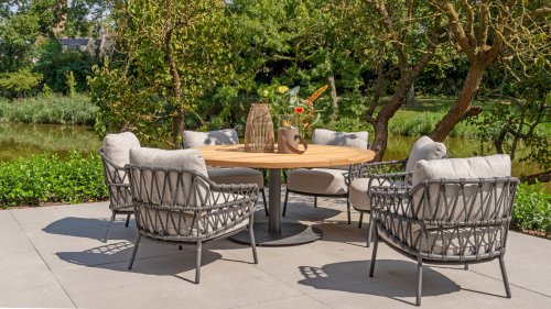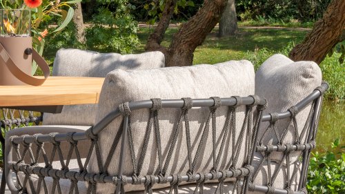Der niedrige Esstisch Saba hat einen pulverbeschichteten Edelstahlfuß mit einer Tischplatte aus Teakholz. Wir empfehlen die Pflege des Teakholzes mit unseren Pflegeprodukten von 4 Seasons Outdoor, um eine lange Lebensdauer und ein schönes Aussehen zu garantieren. Der Calpi-Stuhl besteht aus einer Edelstahlbasis mit Ropeteilen, die gegen verschiedene Witterungseinflüsse beständig sind.