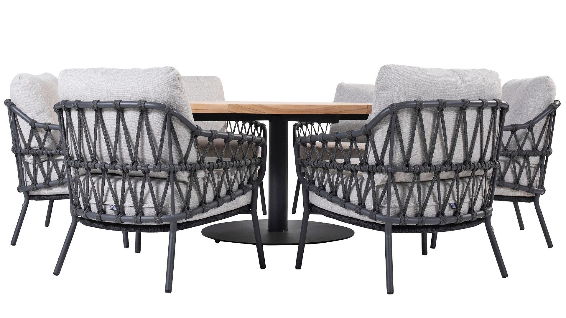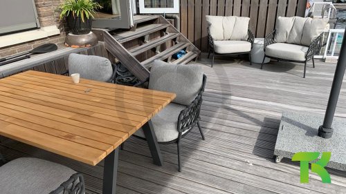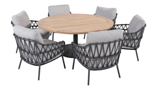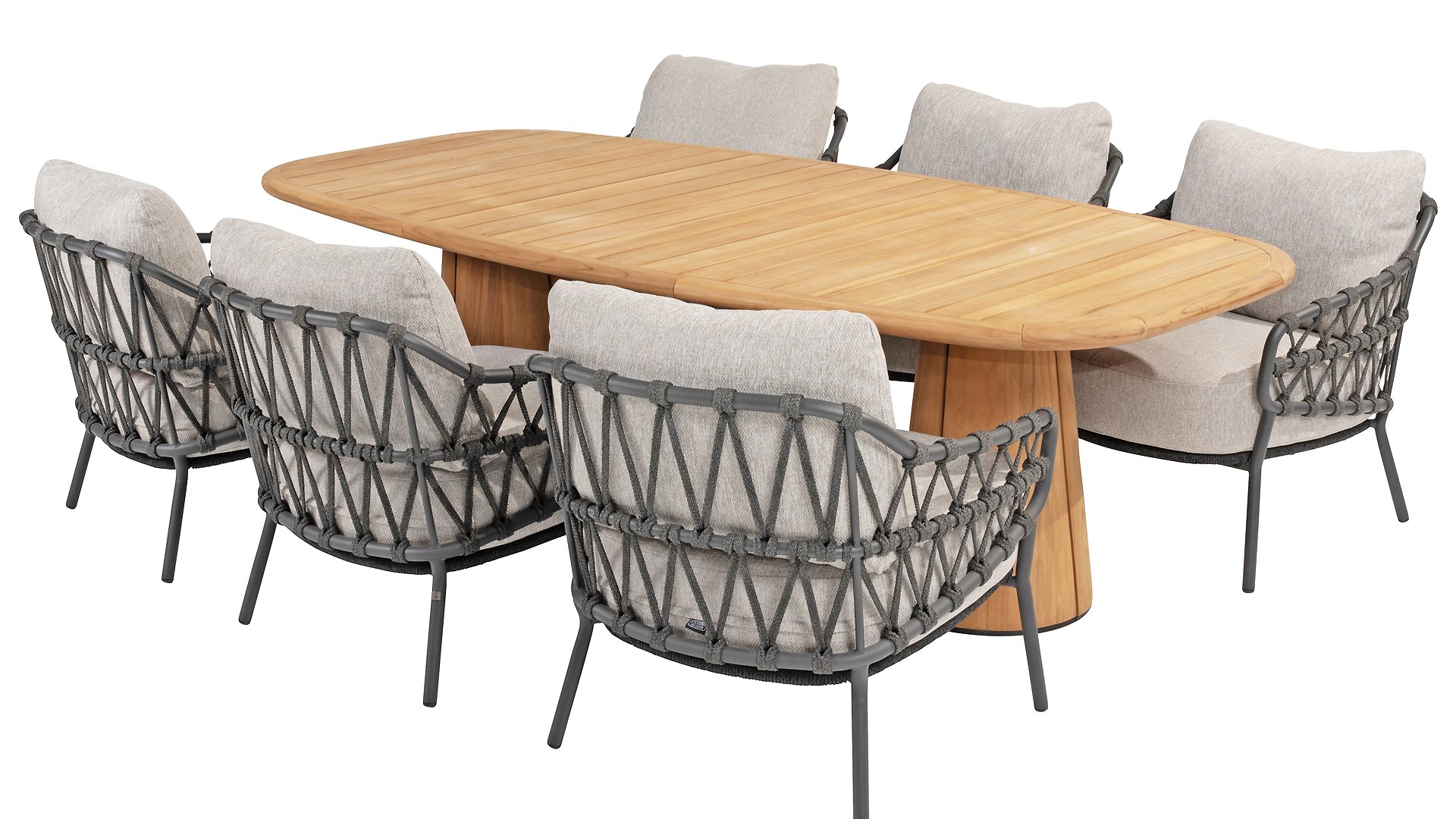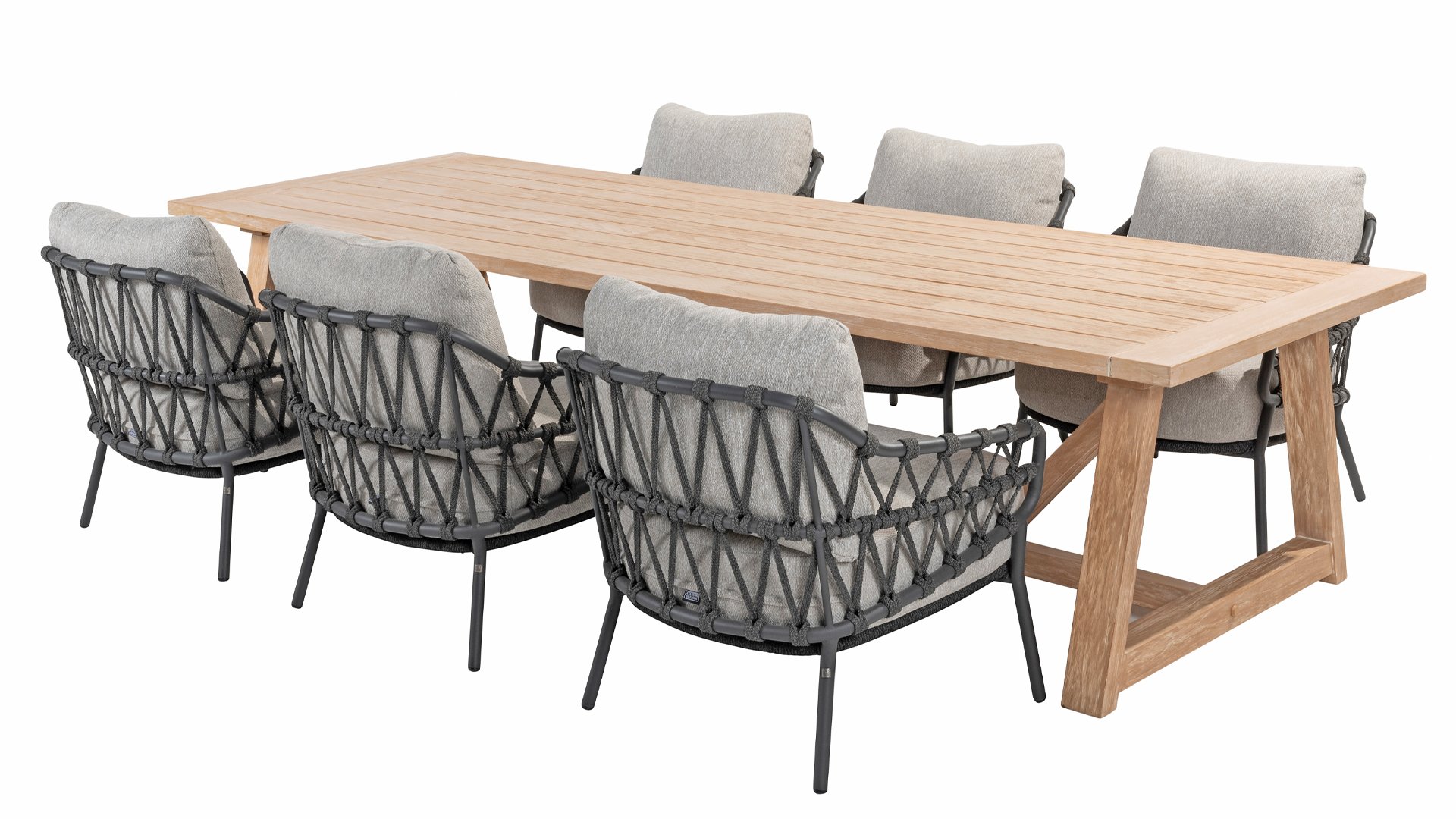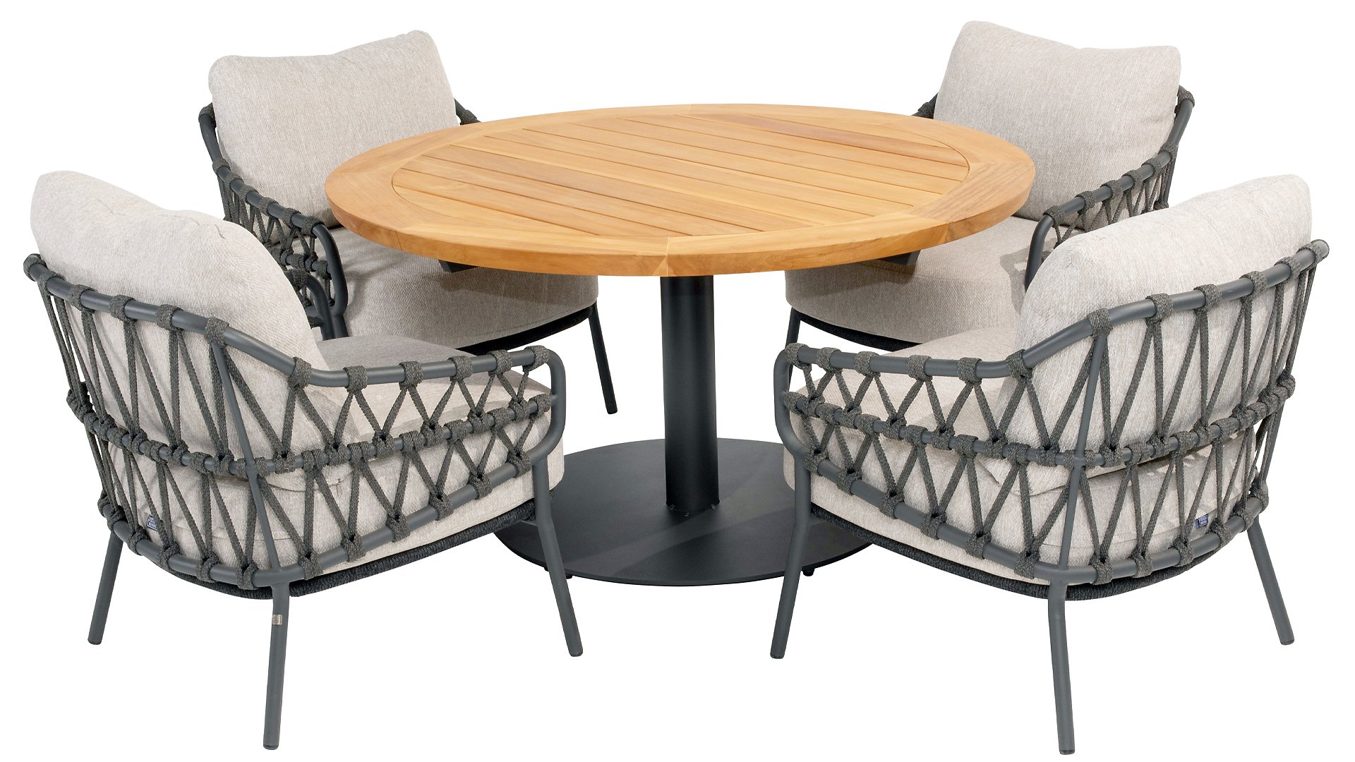 Der niedrige Esstisch Saba hat einen pulverbeschichteten Edelstahlfuß mit einer Tischplatte aus Teakholz. Wir empfehlen die Pflege des Teakholzes mit unseren Pflegeprodukten von 4 Seasons Outdoor, um eine lange Lebensdauer und ein schönes Aussehen zu garantieren. Der Calpi-Stuhl besteht aus einer Edelstahlbasis mit Ropeteilen, die gegen verschiedene Witterungseinflüsse beständig sind.