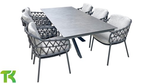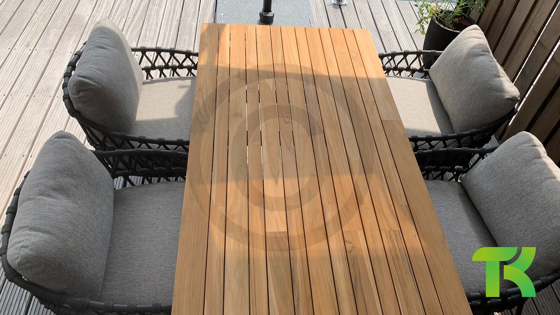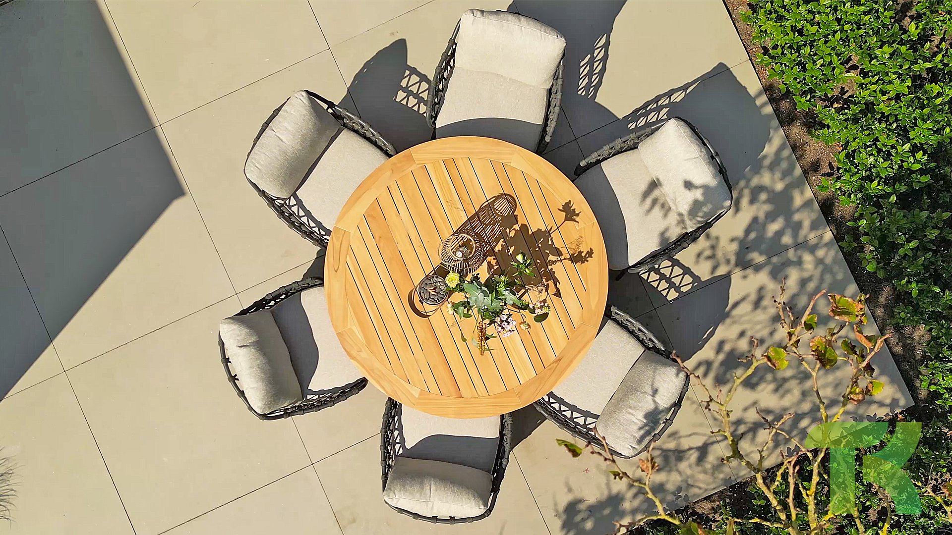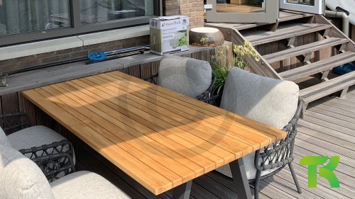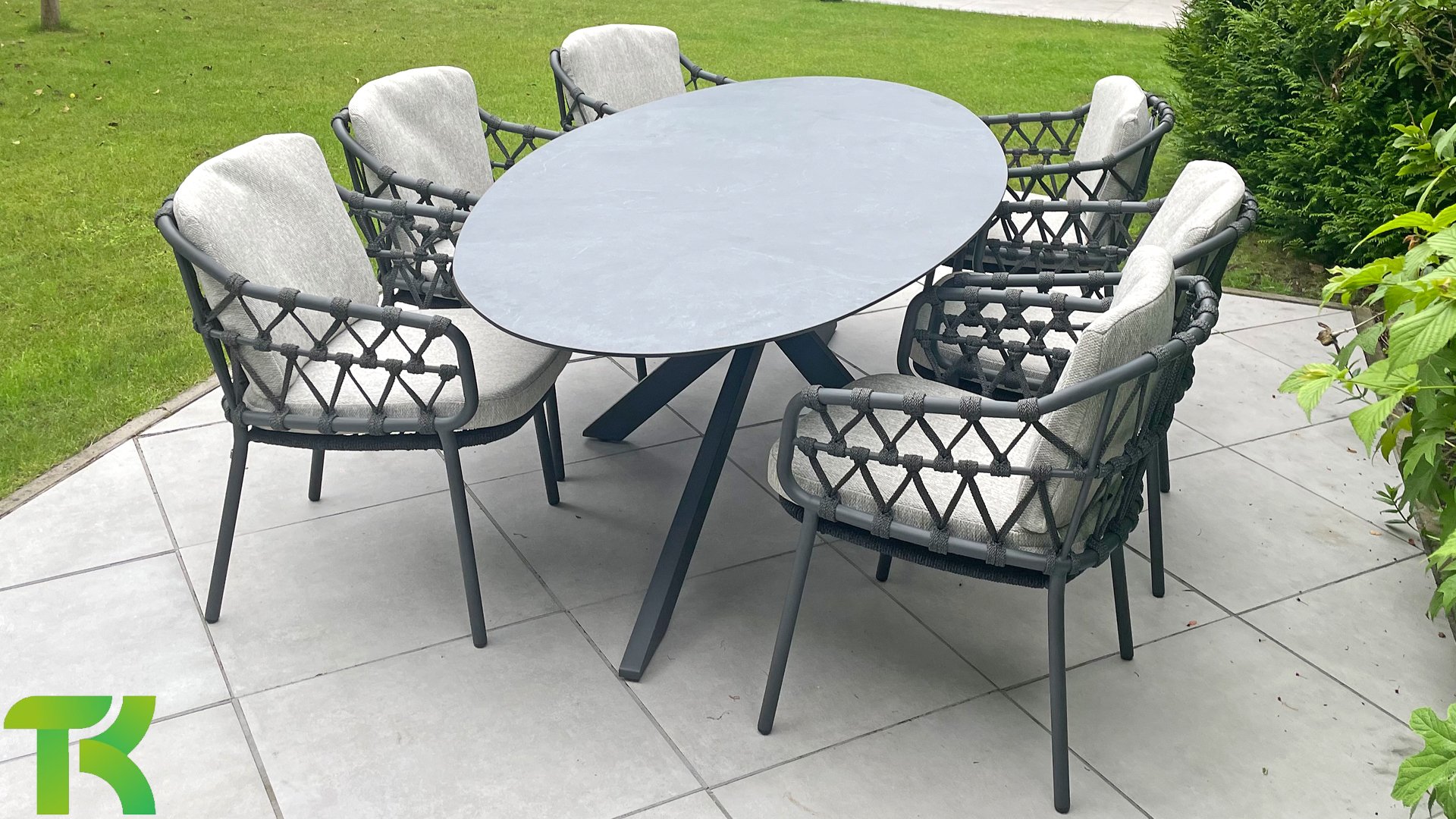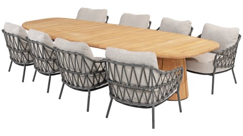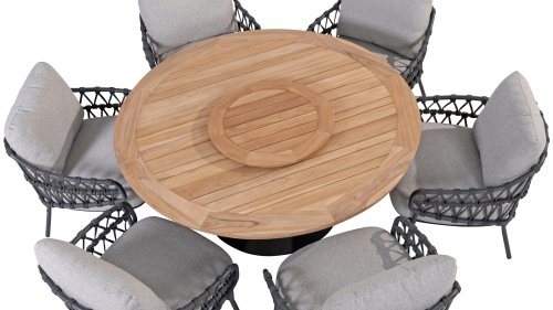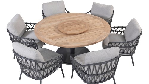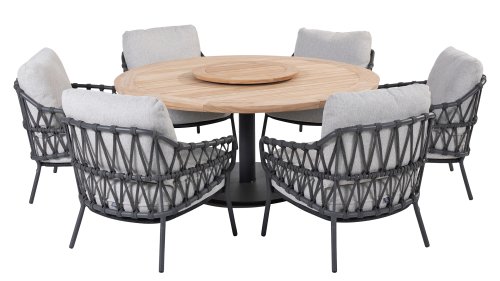 Der niedrige Esstisch Saba hat einen pulverbeschichteten Edelstahlfuß mit einer Tischplatte aus Teakholz. Wir empfehlen die Pflege des Teakholzes mit unseren Pflegeprodukten von 4 Seasons Outdoor, um eine lange Lebensdauer und ein schönes Aussehen zu garantieren. Der Calpi-Stuhl besteht aus einer Edelstahlbasis mit Ropeteilen, die gegen verschiedene Witterungseinflüsse beständig sind.