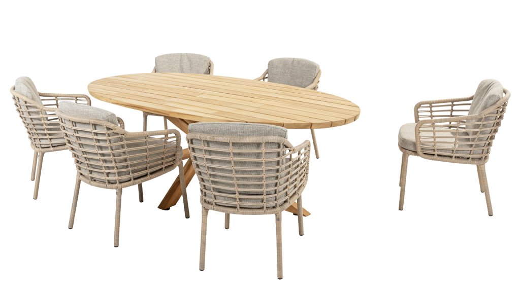 Die Taste by 4Seasons Prado Ellipse kann getrost als Kunstwerk bezeichnet werden. Schauen Sie sich an, wie kunstvoll dieses Beinset zusammengestellt ist. Die dicke Teakplatte hat eine abgeschrägte Seite und verleiht dem Tisch etwas Luftiges. Kann mit unserer gesamten Kollektion an Gartenstühlen kombiniert werden. Der Prado Ellips ist auch mit anthrazitfarbenen Aluminiumbeinen erhältlich.