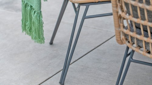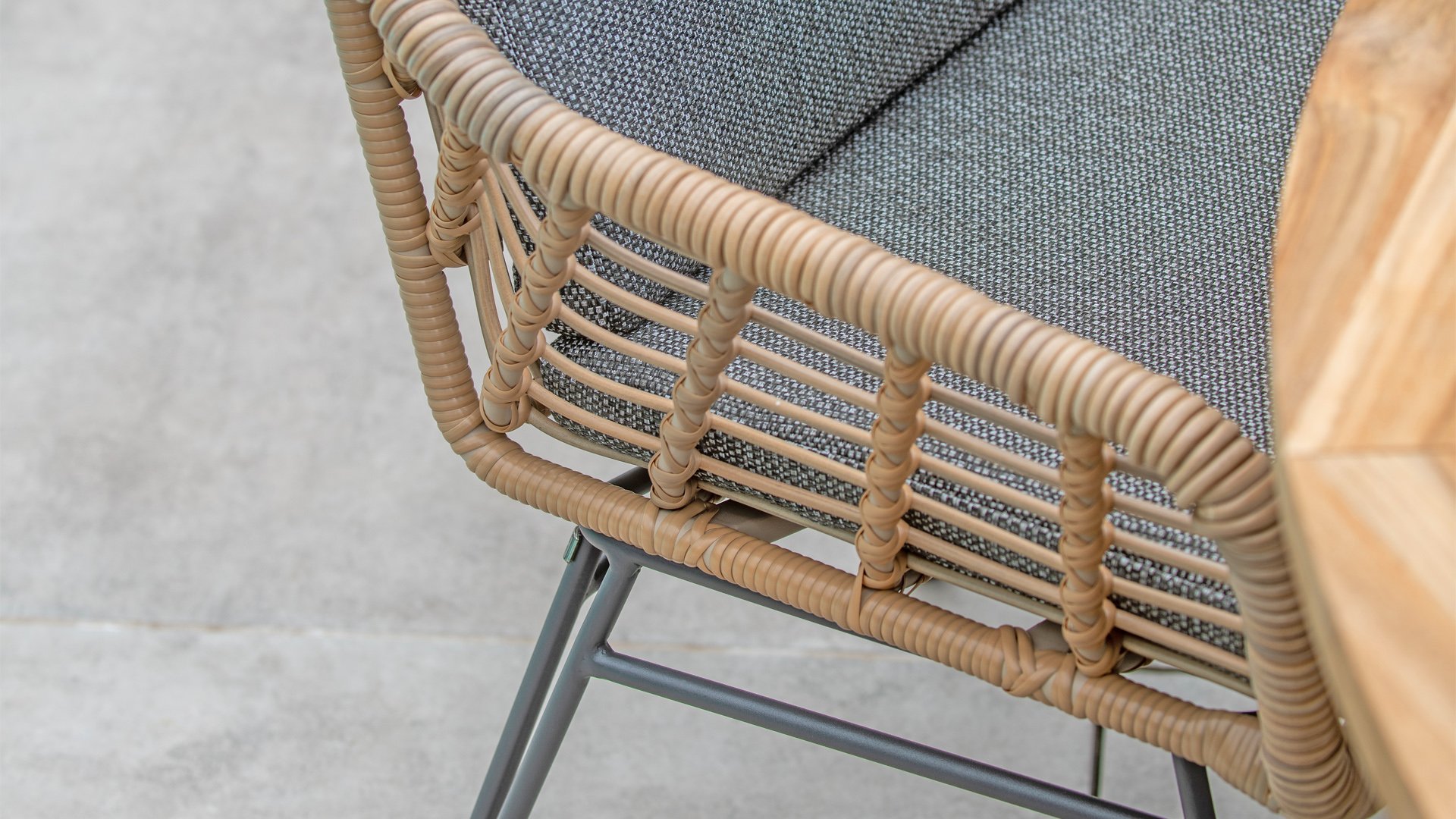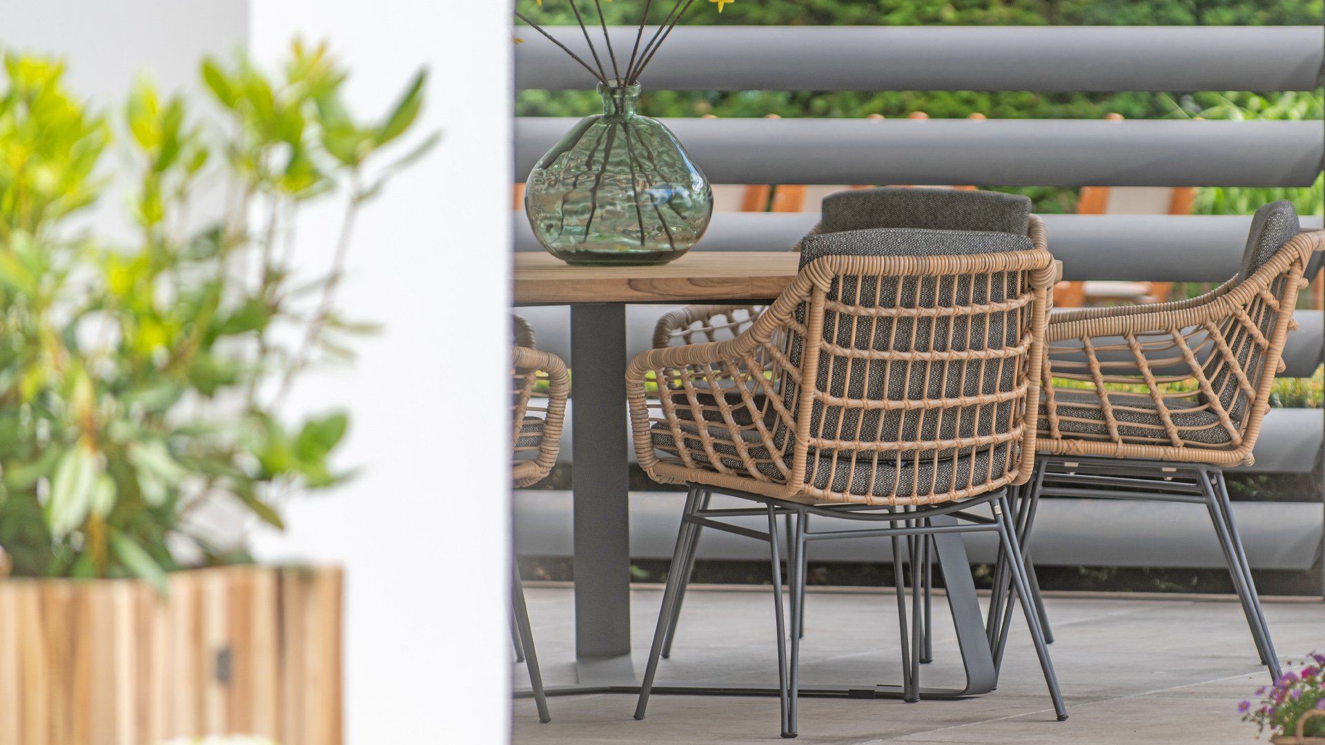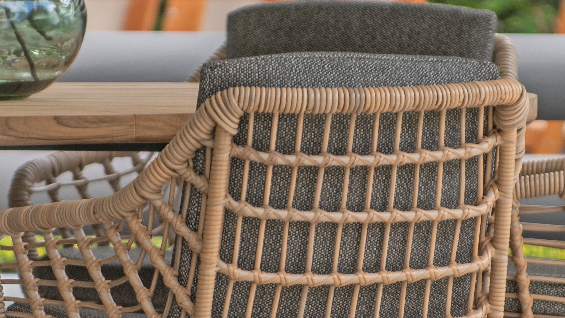 In unserer 4 Seasons Outdoor Cottage Serie sind die Gartenmöbel minimalistisch im Design mit funktionaler Schlichtheit und elegantem Design. Die schönen Rahmen sind aus Aluminium und die Beinen sind aus Edelstahl und haben eine anthrazit farbigen Pulverbeschichtung. Der Rahmen der 4SO Cottage Esstisch-Set fließen in einander und dies wird fertiggemacht mit dem einzigartige Hularo® Geflechte.Dies wurde in den Rahmen Kreuzweise eingewebt. Die runden Formen erhalten das Gleichgewicht dieses modernen Designs. Der Rahmen ist eine spielerische und zerbrechlich Zusammenspiel von glatten Linien, die wieder zusammen kommen und auseinander gehen, Die Seiten und der Rücken sind mit kunstvoll gekreuzten Hularo® Geflechte abgeschlossen, wodurch ein verspieltes Rautenmuster entsteht, ein fest für die Augen!