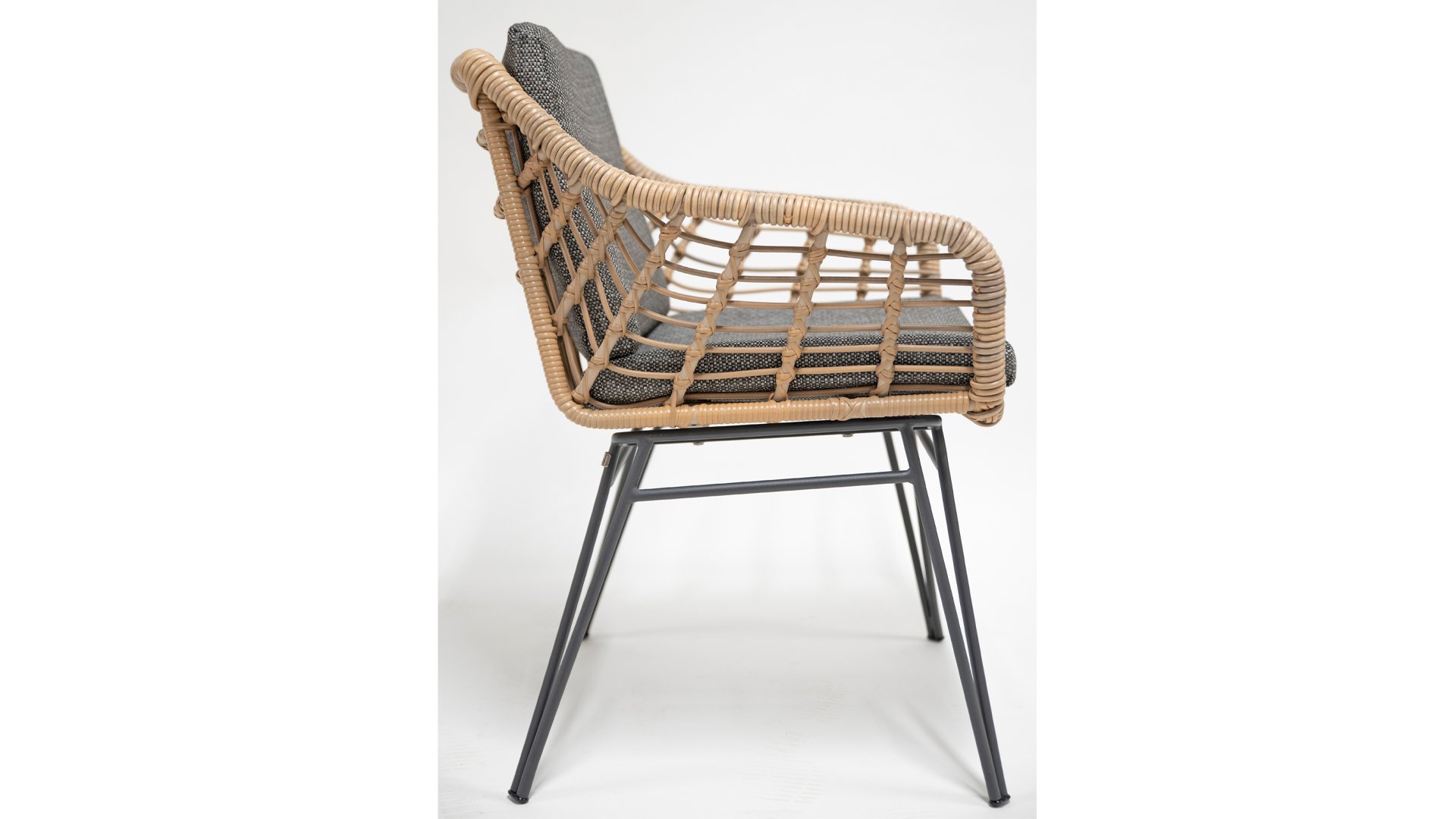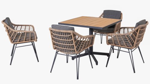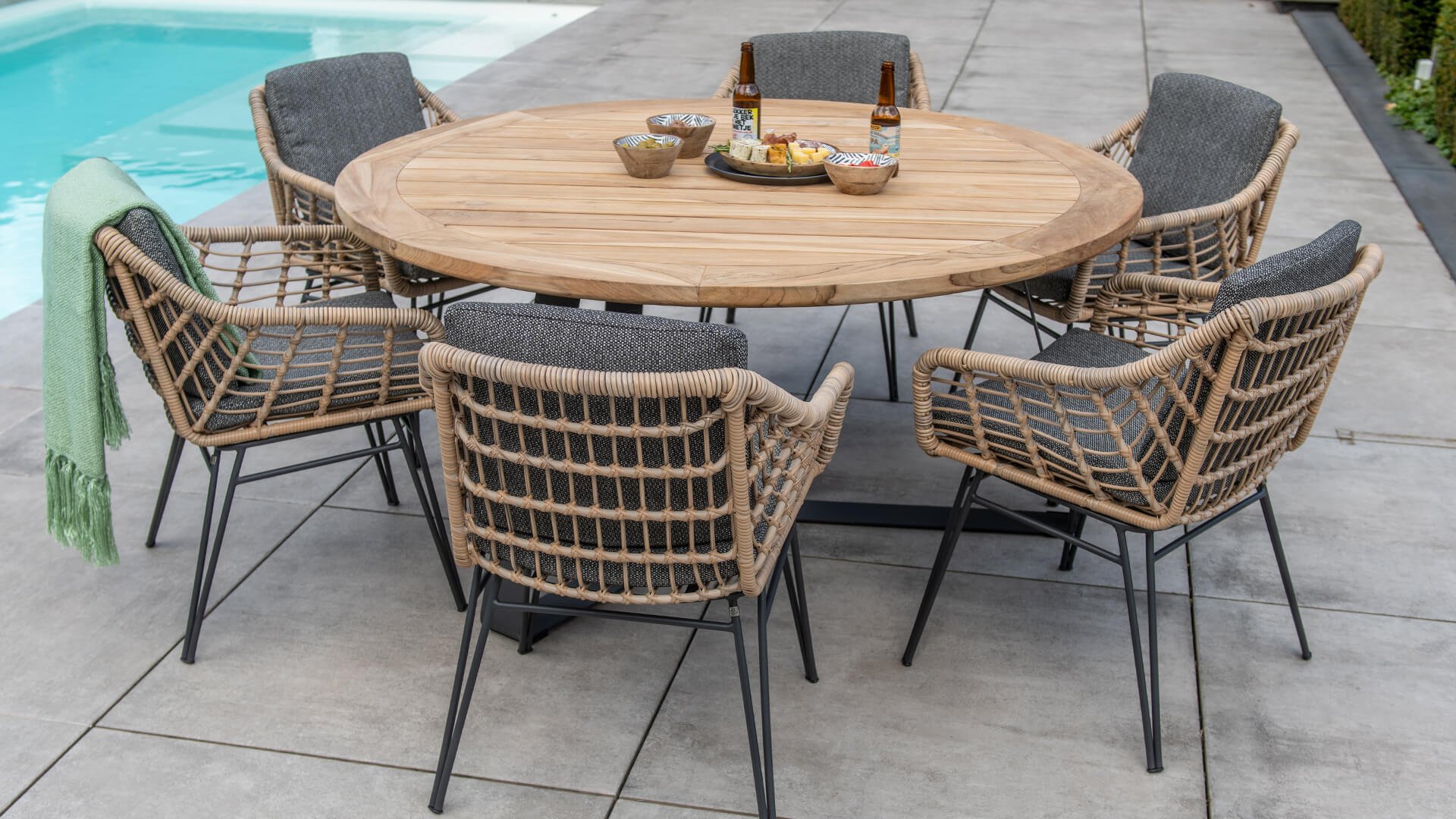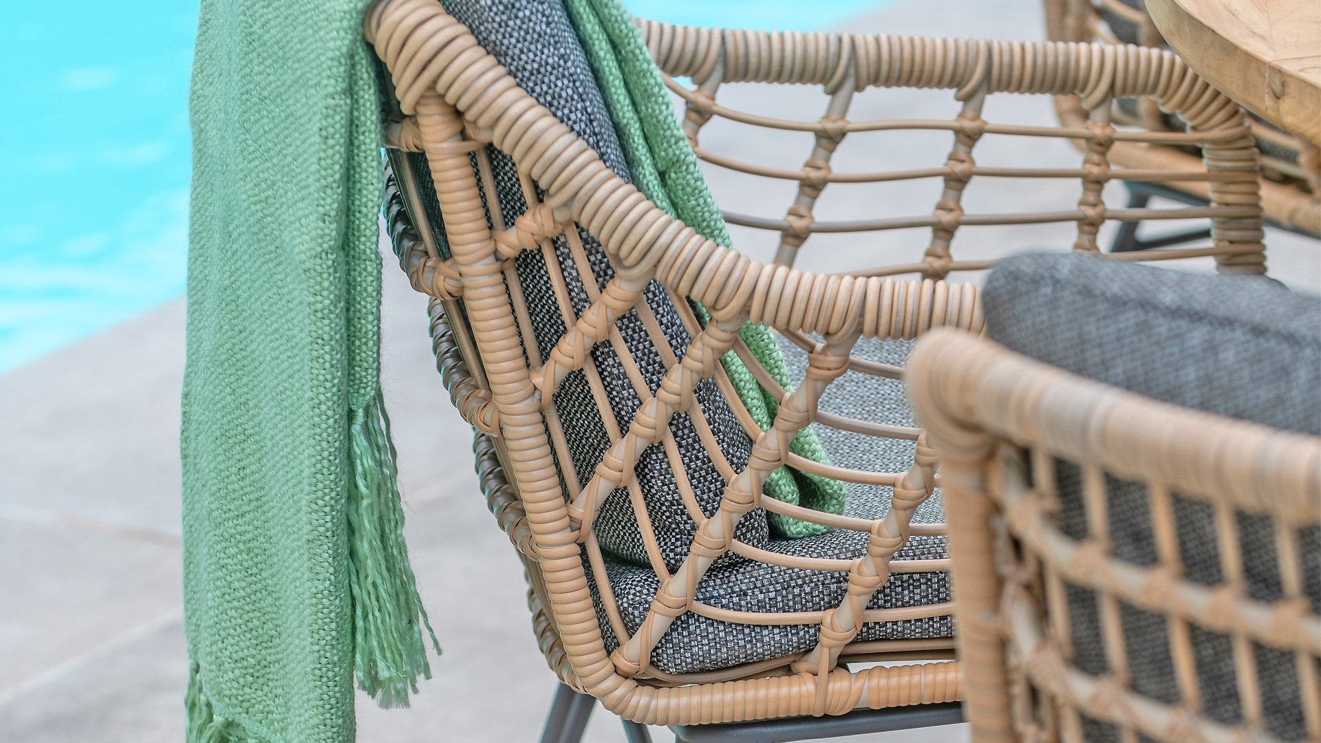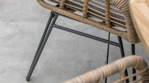 In unserer 4 Seasons Outdoor Cottage Serie sind die Gartenmöbel minimalistisch im Design mit funktionaler Schlichtheit und elegantem Design. Die schönen Rahmen sind aus Aluminium und die Beinen sind aus Edelstahl und haben eine anthrazit farbigen Pulverbeschichtung. Der Rahmen der 4SO Cottage Esstisch-Set fließen in einander und dies wird fertiggemacht mit dem einzigartige Hularo® Geflechte.Dies wurde in den Rahmen Kreuzweise eingewebt. Die runden Formen erhalten das Gleichgewicht dieses modernen Designs. Der Rahmen ist eine spielerische und zerbrechlich Zusammenspiel von glatten Linien, die wieder zusammen kommen und auseinander gehen, Die Seiten und der Rücken sind mit kunstvoll gekreuzten Hularo® Geflechte abgeschlossen, wodurch ein verspieltes Rautenmuster entsteht, ein fest für die Augen!