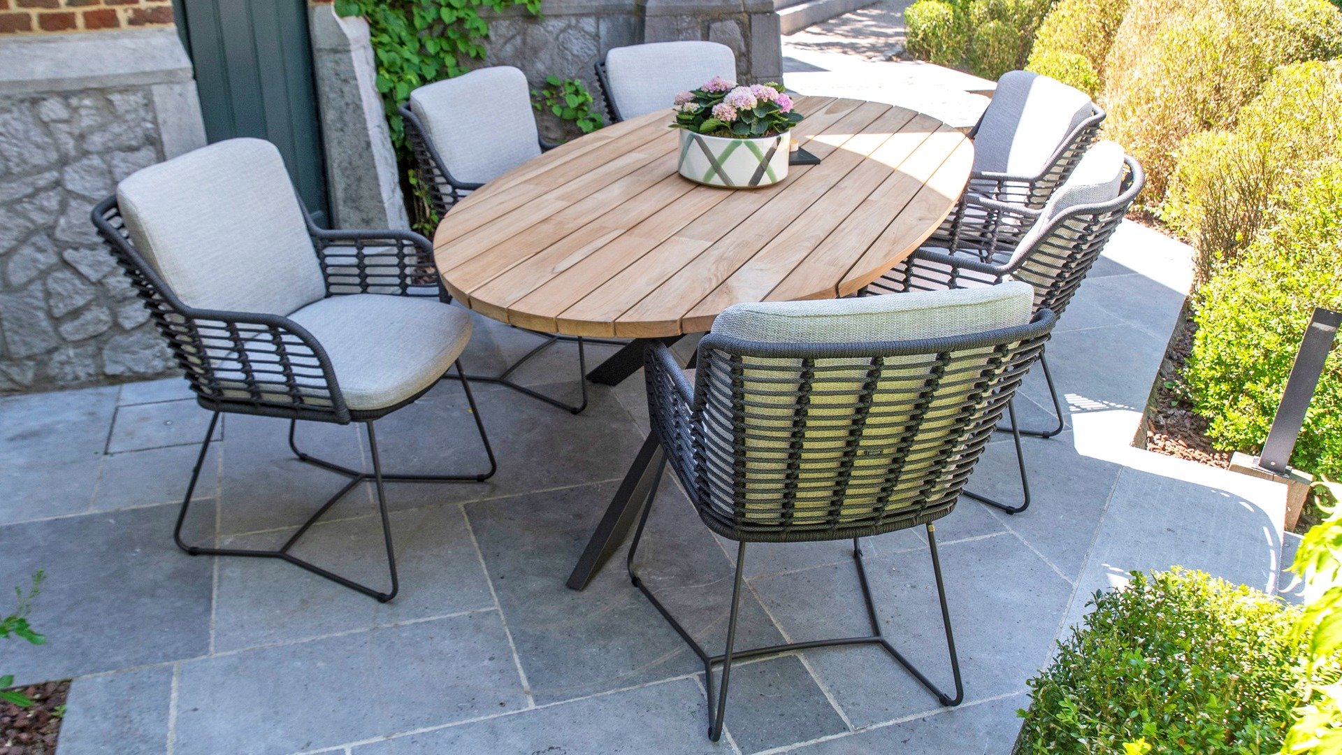 Die Taste by 4Seasons Prado Ellips kann ruhig als Kunstwerk bezeichnet werden. Schau mal, wie kunstvoll dieses Bein-Design ist. Die dicke Teakholzplatte ist schräg und verleiht dem Tisch etwas Luftiges. Kombinierbar mit unserer gesamten Kollektion von Gartensesseln. Auch mit Gestell in Anthrazit, Teak, Latte oder Terre erhältlich: