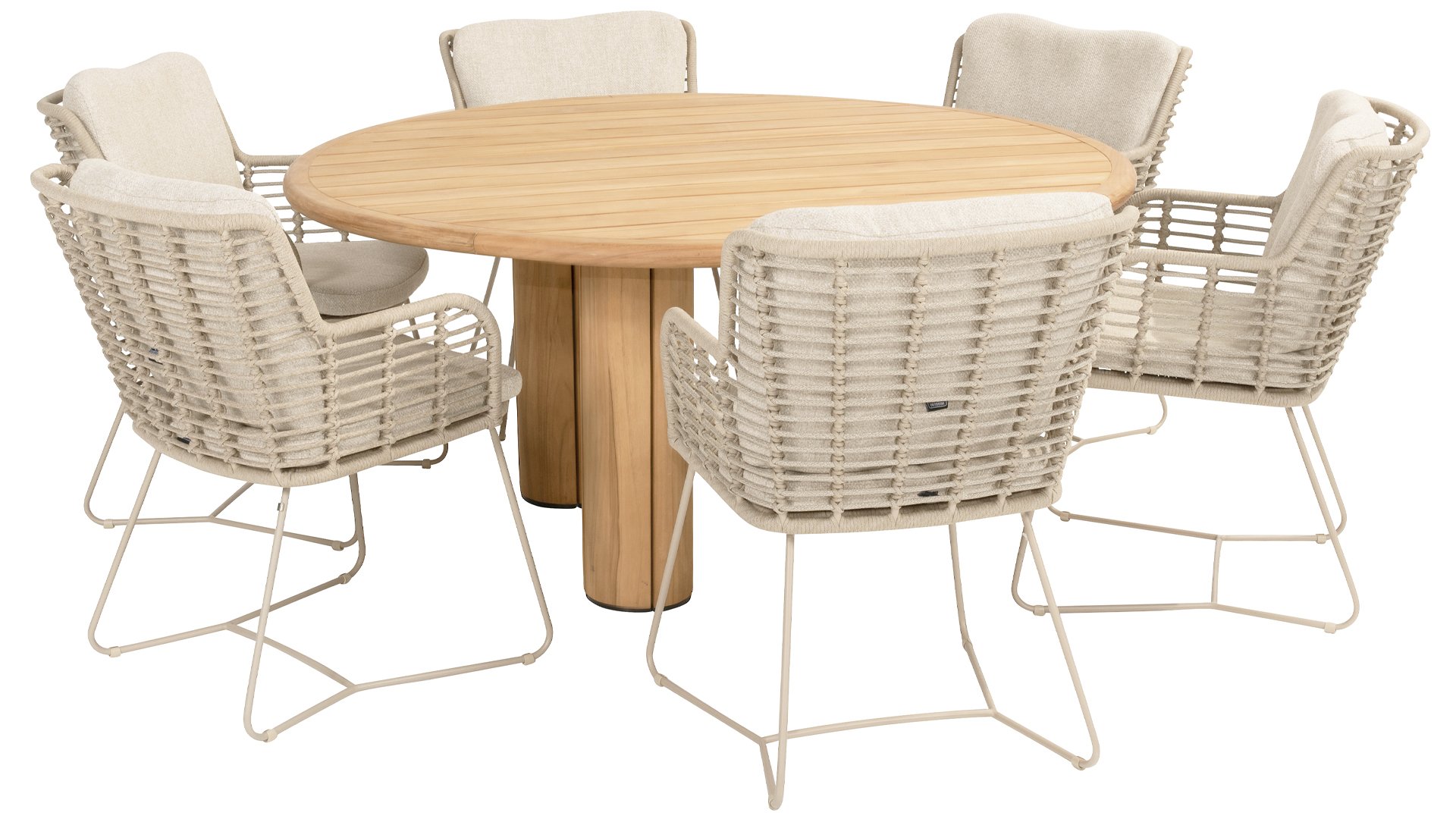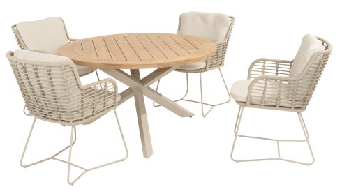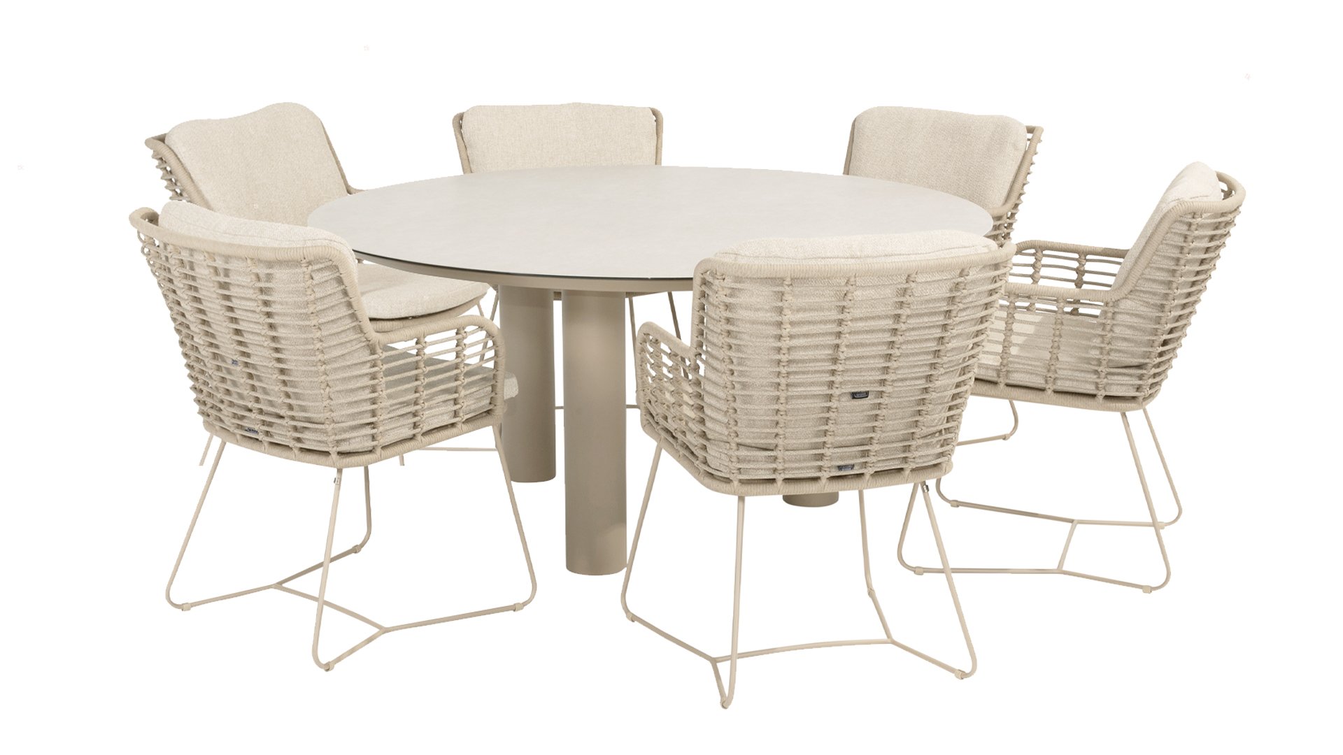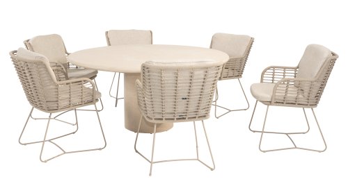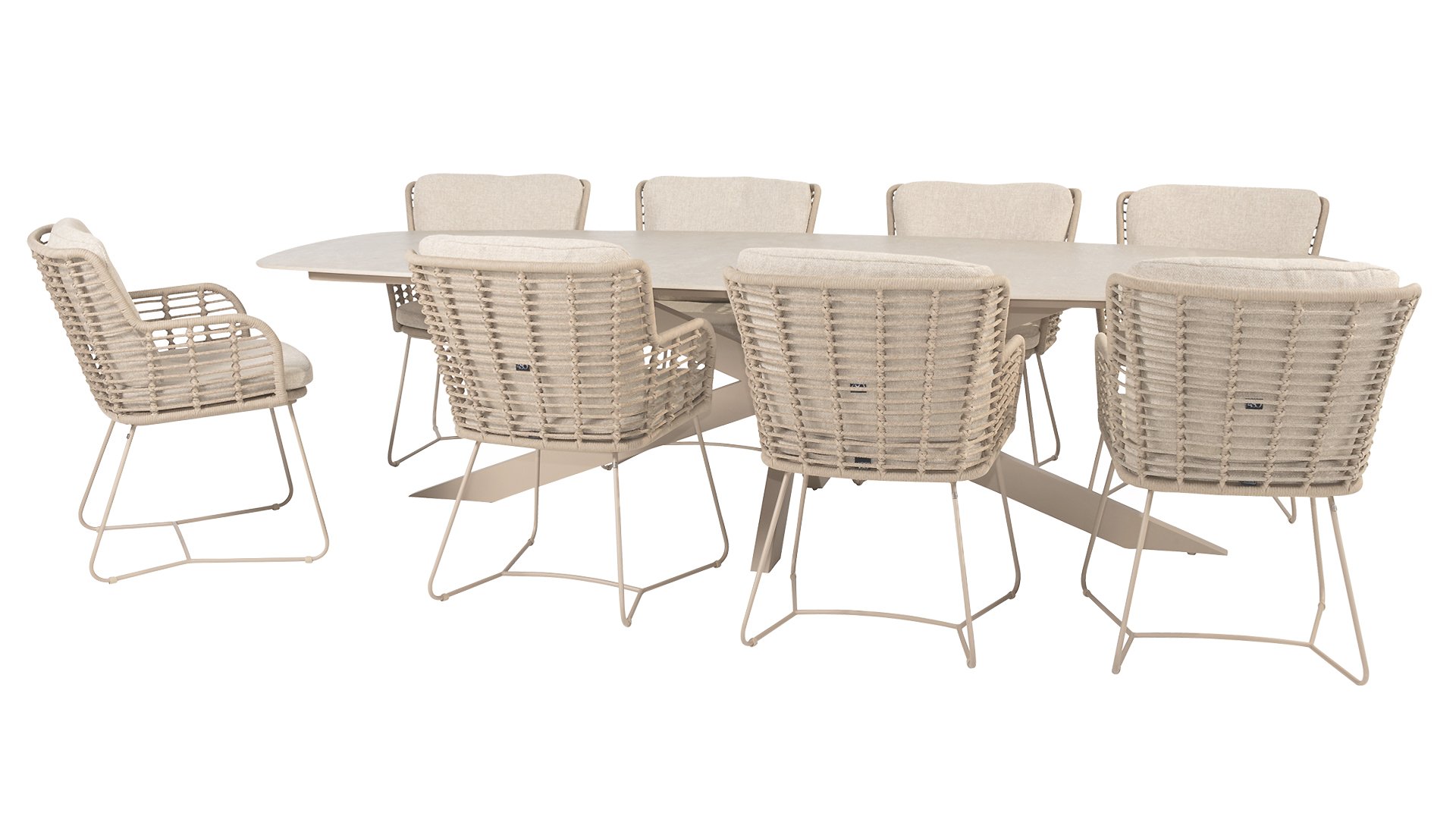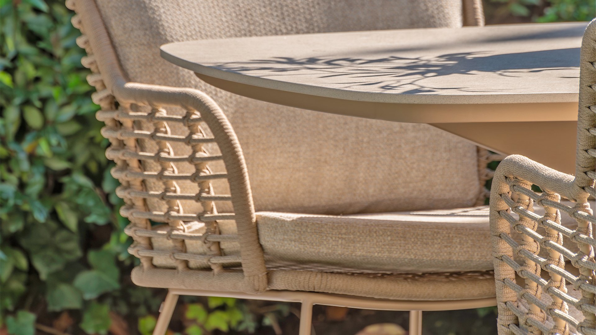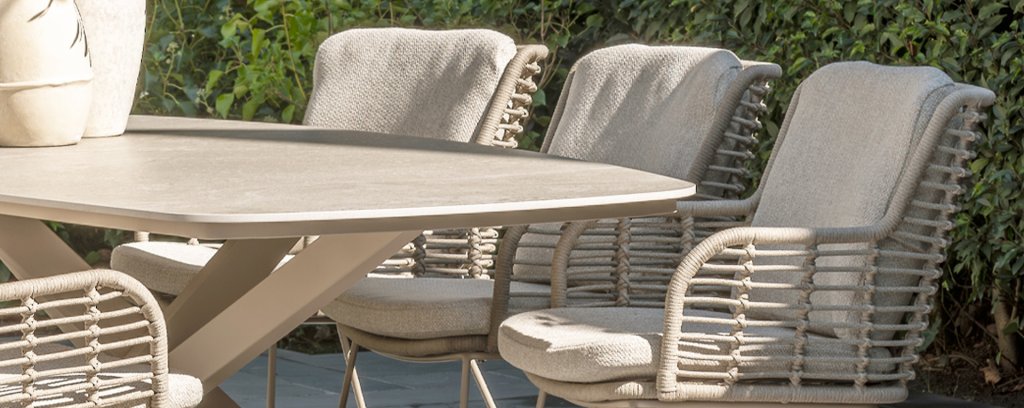 Der Rahmen des Fabrice 4SO Dining fließen in einander und dies wird fertiggemacht mit dem einzigartige Rope Geflechte. Rückenlehne und Sitzfläche ist mit dieser starken Rope geflochten und gibt ein fest, aber bequem Sitzen. Die schönen Rahmen sind aus Aluminium. Ein schönes, flaches Seil (Rope) mit einem weichen und komfortablen Aussehen wurde in den Rahmen eingewebt. Die runden und Eckige Formen erhalten das Gleichgewicht dieses modernen Designs. Der Rahmen ist eine spielerische und zerbrechlich Zusammenspiel von glatten Linien, die wieder zusammen kommen und auseinander gehen, ein fest für die Augen! Die 4Seasons Fabrice Rahmen wird mit natürlichen Latte farbige Kunststoff Faser in Form von Schnüre (Rope) abgedeckt. Die Kissen kommen in einer schönen latte farbenen Olefin-Stoff. Die 4SO Fabrice Gartenmöbel verfügen über bequeme Kissen mit Bezügen aus Olefin-Material, das extrem witterungsbeständig und langlebig ist. Einfach den Reißverschluss öffnen und bei 30 Grad waschen / trocknen.
