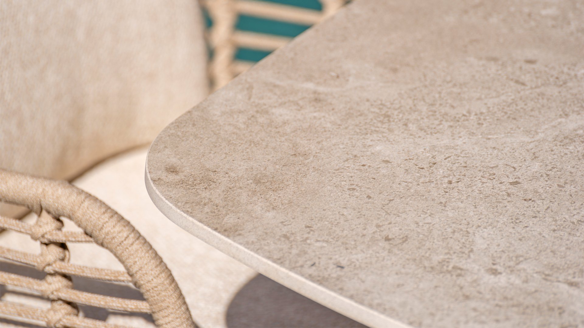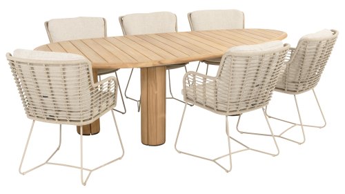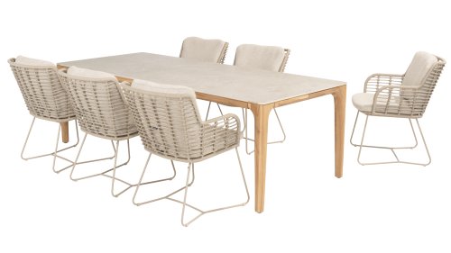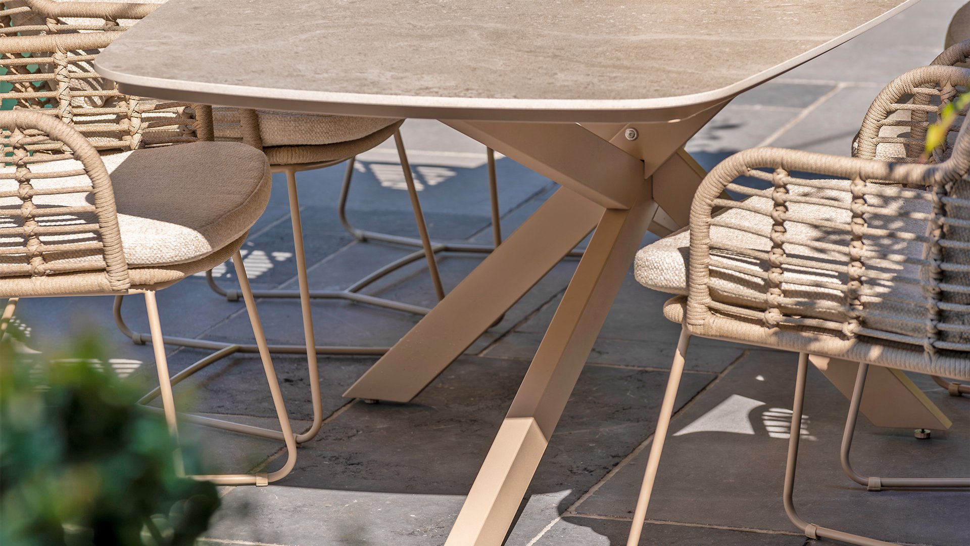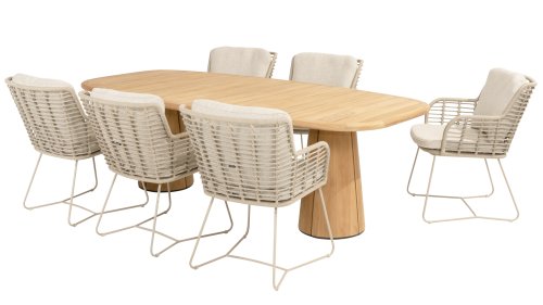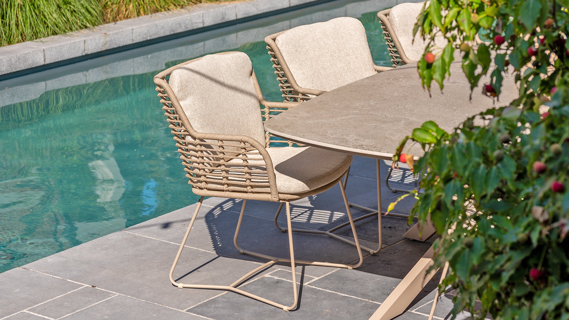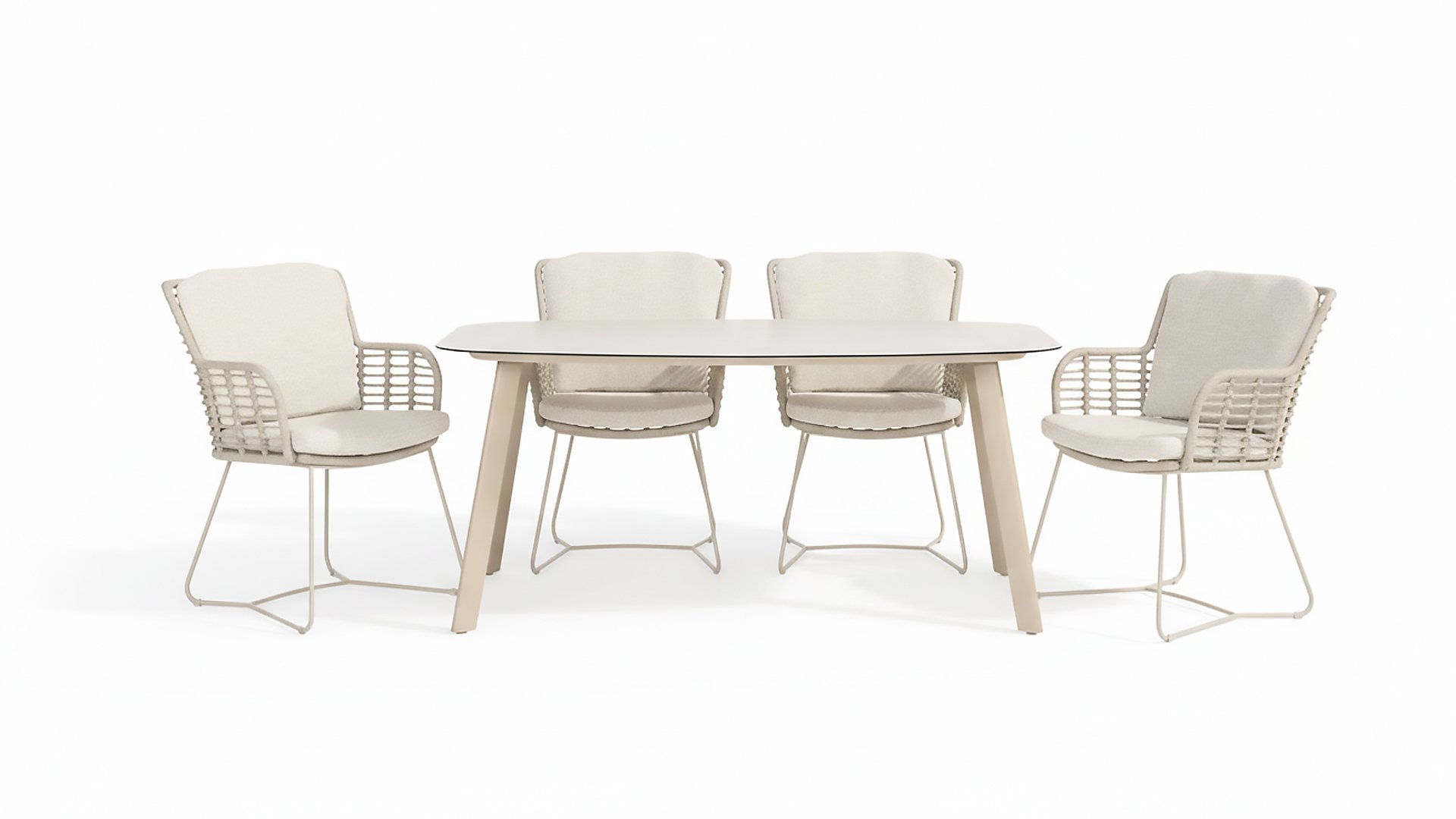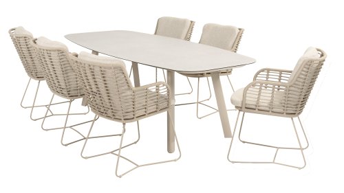 Der Rahmen des Fabrice 4SO Dining fließen in einander und dies wird fertiggemacht mit dem einzigartige Rope Geflechte. Rückenlehne und Sitzfläche ist mit dieser starken Rope geflochten und gibt ein fest, aber bequem Sitzen. Die schönen Rahmen sind aus Aluminium. Ein schönes, flaches Seil (Rope) mit einem weichen und komfortablen Aussehen wurde in den Rahmen eingewebt. Die runden und Eckige Formen erhalten das Gleichgewicht dieses modernen Designs. Der Rahmen ist eine spielerische und zerbrechlich Zusammenspiel von glatten Linien, die wieder zusammen kommen und auseinander gehen, ein fest für die Augen! Die 4Seasons Fabrice Rahmen wird mit natürlichen Latte farbige Kunststoff Faser in Form von Schnüre (Rope) abgedeckt. Die Kissen kommen in einer schönen latte farbenen Olefin-Stoff. Die 4SO Fabrice Gartenmöbel verfügen über bequeme Kissen mit Bezügen aus Olefin-Material, das extrem witterungsbeständig und langlebig ist. Einfach den Reißverschluss öffnen und bei 30 Grad waschen / trocknen.