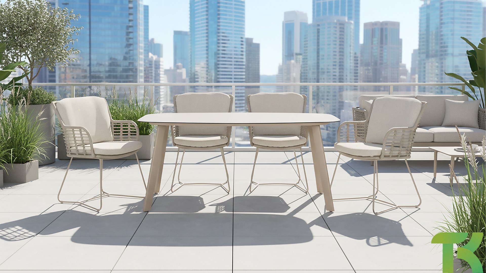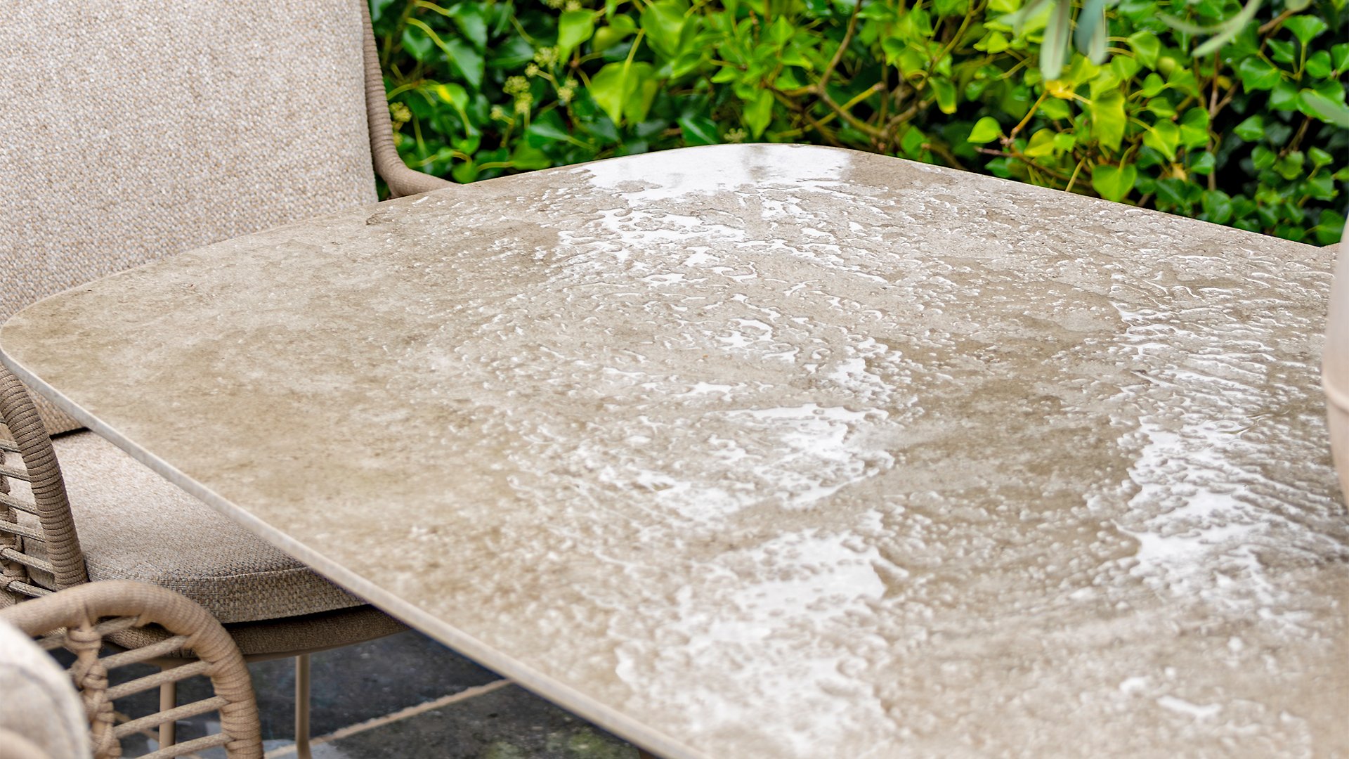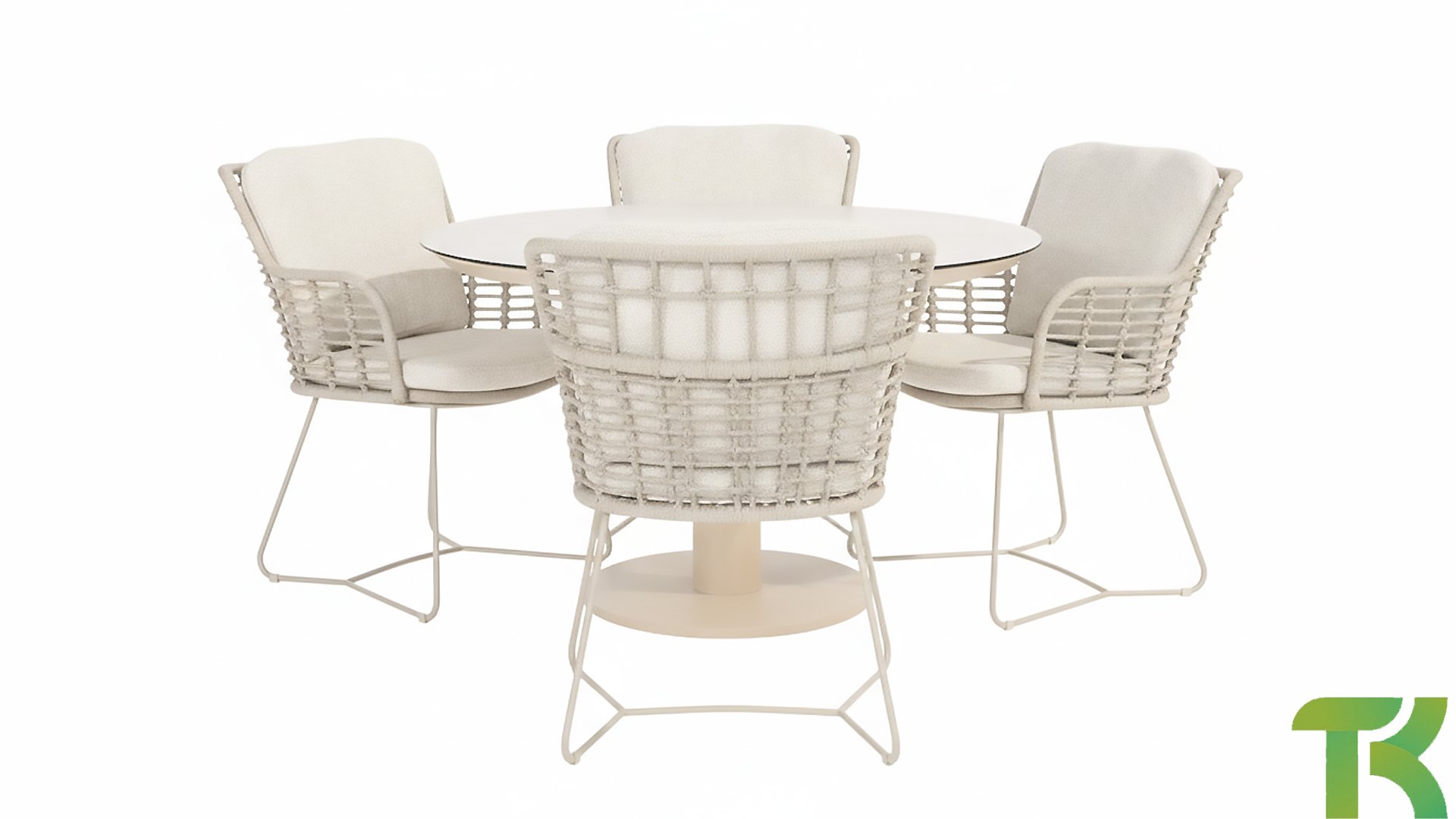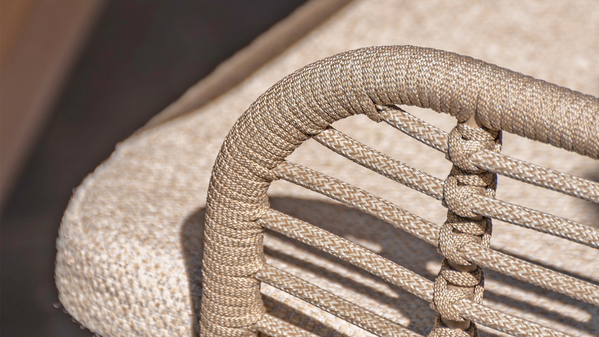 Der Rahmen des Fabrice 4SO Dining fließen in einander und dies wird fertiggemacht mit dem einzigartige Rope Geflechte. Rückenlehne und Sitzfläche ist mit dieser starken Rope geflochten und gibt ein fest, aber bequem Sitzen. Die schönen Rahmen sind aus Aluminium. Ein schönes, flaches Seil (Rope) mit einem weichen und komfortablen Aussehen wurde in den Rahmen eingewebt. Die runden und Eckige Formen erhalten das Gleichgewicht dieses modernen Designs. Der Rahmen ist eine spielerische und zerbrechlich Zusammenspiel von glatten Linien, die wieder zusammen kommen und auseinander gehen, ein fest für die Augen! Die 4Seasons Fabrice Rahmen wird mit natürlichen Latte farbige Kunststoff Faser in Form von Schnüre (Rope) abgedeckt. Die Kissen kommen in einer schönen latte farbenen Olefin-Stoff. Die 4SO Fabrice Gartenmöbel verfügen über bequeme Kissen mit Bezügen aus Olefin-Material, das extrem witterungsbeständig und langlebig ist. Einfach den Reißverschluss öffnen und bei 30 Grad waschen / trocknen.