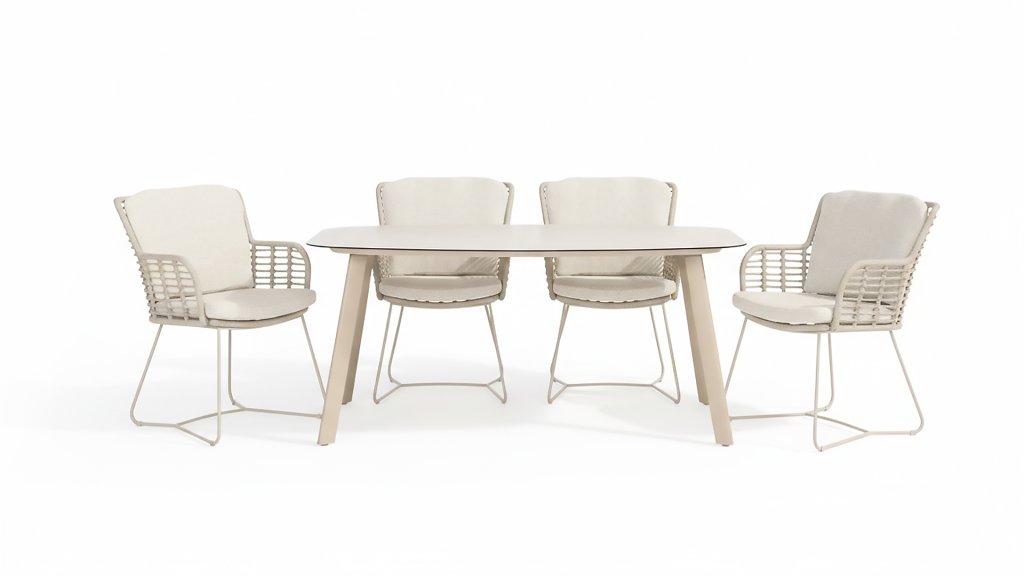 Aus den besten Materialien gefertigt, mit Leidenschaft hergestellt. Diese wunderschöne 4Seasons Fabrice Dining-Serie besticht nicht nur durch Stil, sondern auch durch hervorragenden Sitzkomfort. Der Stuhl ist auch in folgenden Farben erhältlich: Anthrazit, Latte & TerreDie verwendeten Materialien sind Kunststoffseil, Olefin & Aluminium. Kunststoffseil enthält einen Kern, der für Farbechtheit sorgt und es schimmelbeständig macht. Olefin macht die Kissen ebenfalls farbecht und wasserbeständig, der Stoff fühlt sich auch angenehm an. Das Gestell des Fabrice ist pulverbeschichtetes Aluminium, um das moderne Design abzurunden! Auch erhältlich in Lounge: 4SO Fabrice Eck-Loungeset & 4SO Fabrice Loungeset.