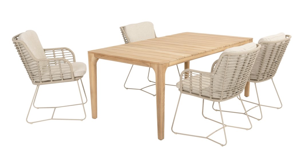 Aus den besten Materialien gefertigt, mit Leidenschaft hergestellt. Diese wunderschöne 4Seasons Fabrice Dining-Serie besticht nicht nur durch Stil, sondern auch durch hervorragenden Sitzkomfort. Der Stuhl ist auch in folgenden Farben erhältlich: Anthrazit, Latte & TerreDie verwendeten Materialien sind Kunststoffseil, Olefin & Aluminium. Kunststoffseil enthält einen Kern, der für Farbechtheit sorgt und es schimmelbeständig macht. Olefin macht die Kissen ebenfalls farbecht und wasserbeständig, der Stoff fühlt sich auch angenehm an. Das Gestell des Fabrice ist pulverbeschichtetes Aluminium, um das moderne Design abzurunden! Auch erhältlich in Lounge: 4SO Fabrice Eck-Loungeset & 4SO Fabrice Loungeset.