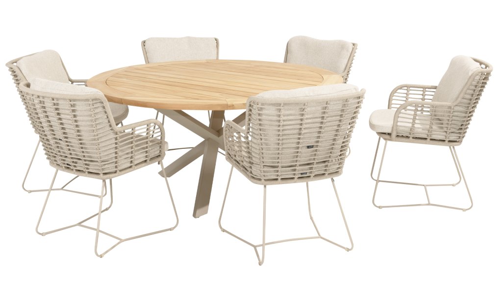 Aus den besten Materialien gefertigt, mit Leidenschaft hergestellt. Diese wunderschöne 4Seasons Fabrice Dining-Serie besticht nicht nur durch Stil, sondern auch durch hervorragenden Sitzkomfort. Der Stuhl ist auch in folgenden Farben erhältlich: Anthrazit, Latte & TerreDie verwendeten Materialien sind Kunststoffseil, Olefin & Aluminium. Kunststoffseil enthält einen Kern, der für Farbechtheit sorgt und es schimmelbeständig macht. Olefin macht die Kissen ebenfalls farbecht und wasserbeständig, der Stoff fühlt sich auch angenehm an. Das Gestell des Fabrice ist pulverbeschichtetes Aluminium, um das moderne Design abzurunden! Auch erhältlich in Lounge: 4SO Fabrice Eck-Loungeset & 4SO Fabrice Loungeset.
