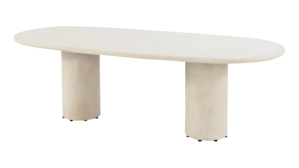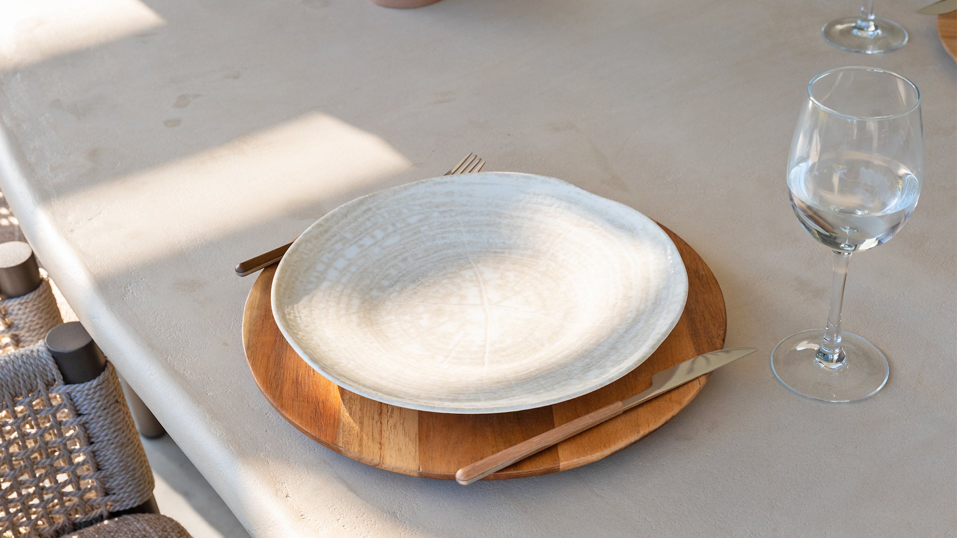 Der Hampton ist aus hochwertigem Mortex gefertigt, einem langlebigen und wasserfesten Material, das für seine natürliche Optik und außergewöhnliche Wetterbeständigkeit bekannt ist. Jede Tischplatte wird von Hand bearbeitet und schafft so einen einzigartigen, warmen Look, der sowohl moderne als auch mediterrane Gärten perfekt ergänzt.