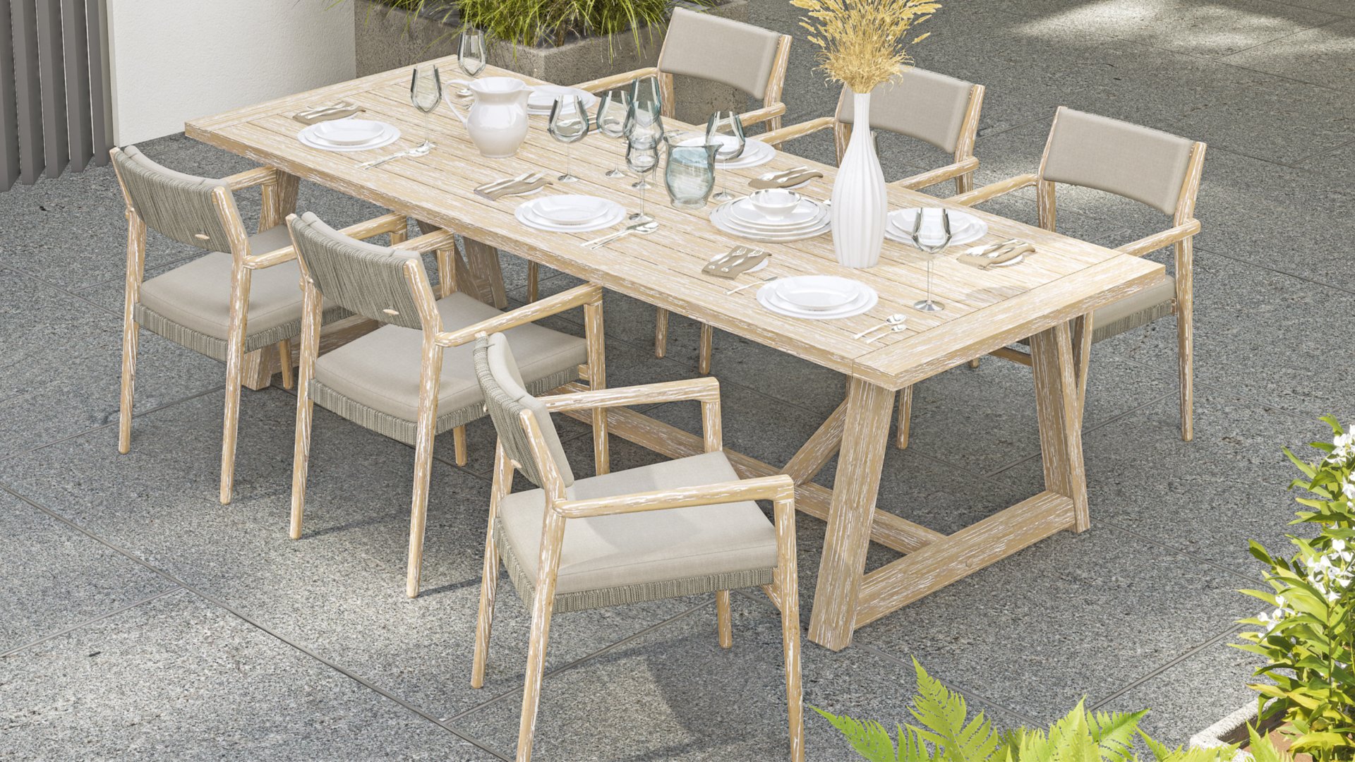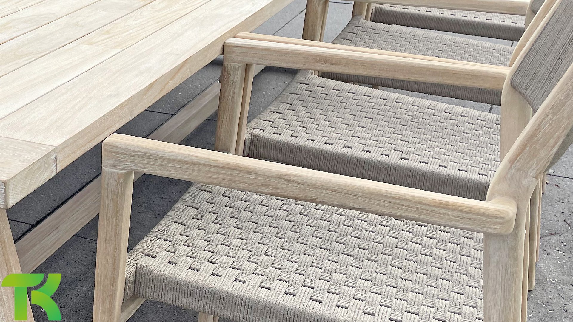 Das Teakholz ist gebürstet, was bedeutet, dass es eine raue, natürliche Oberfläche mit leichten Akzenten in den Rillen hat. Dieses Finish ist einzigartig und verleiht diesen Gartenmöbeln ein einzigartiges Aussehen.
