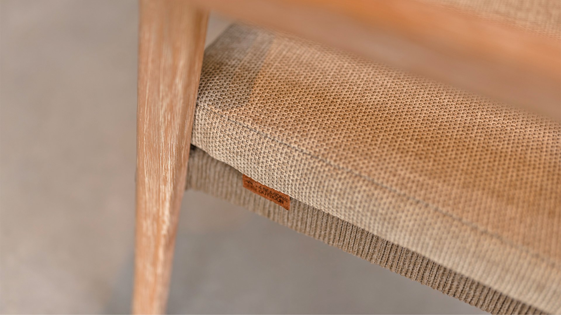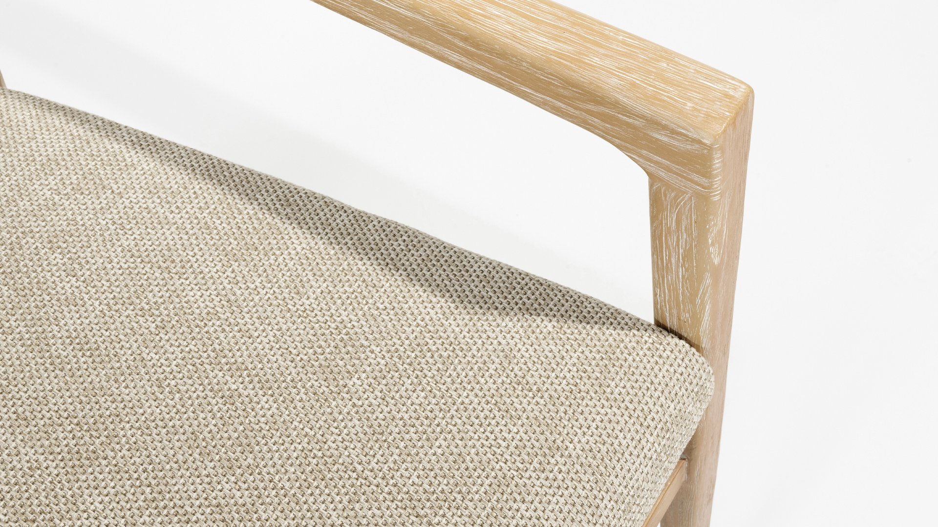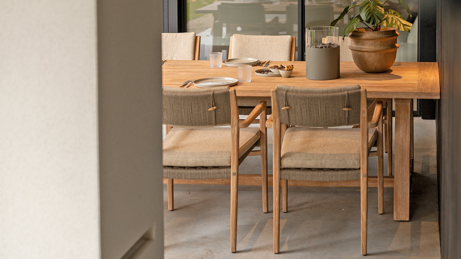 Het teak is geborsteld, wat wil zeggen dat het een ruwe, natuurlijke afwerking heeft met lichte highlights in de groeven. Deze afwerking is uniek en geeft dit buitenmeubel een unieke look.