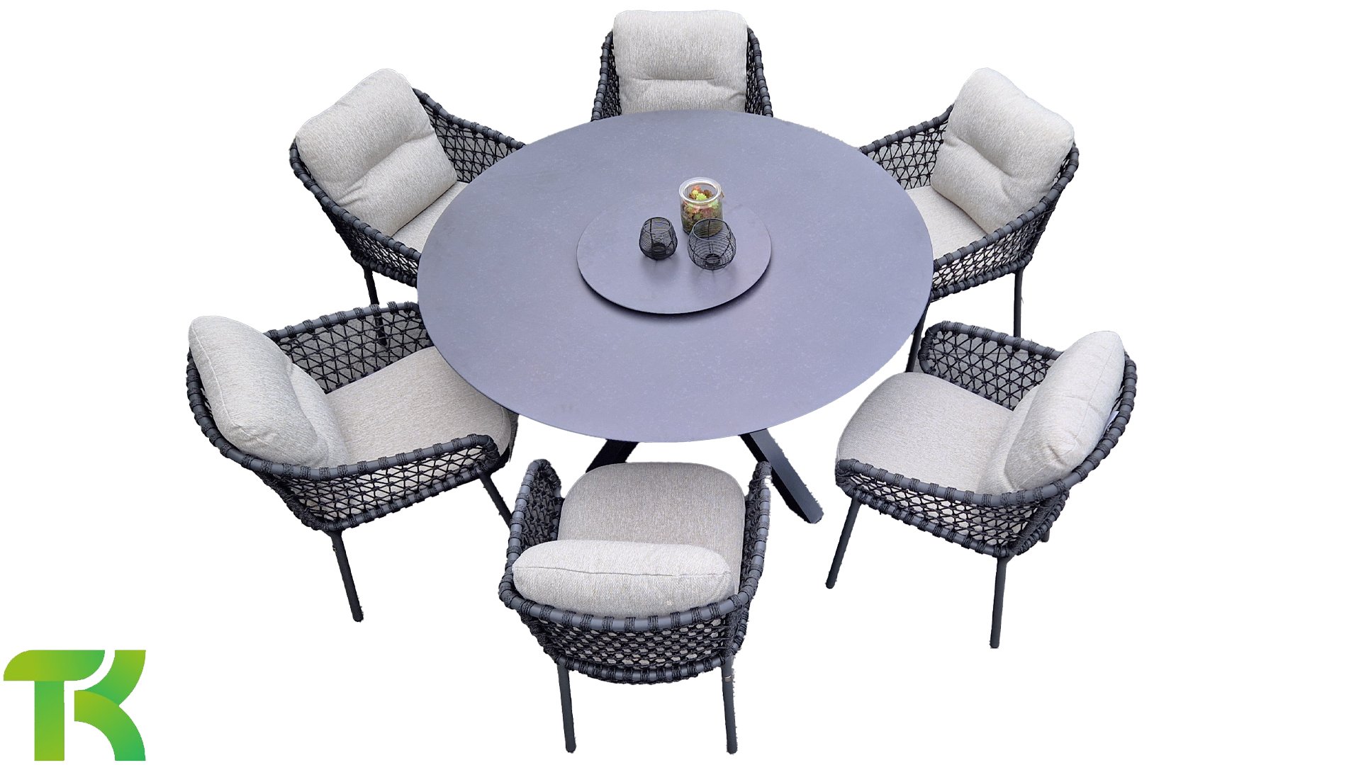 Hergestellt aus pulverbeschichtetem Aluminium in der Farbe Anthrazit und einer 5 mm dicken Keramik auf Glass-Tischplatte. Der Tisch ist nahezu wartungsfrei. Zum Tisch gehört auch ein Lazy-Susan-Drehteller, der ideal ist, wenn Sie Besucher empfangen und etwas überreichen möchten. Dieser schöne Tisch vereint Funktionalität mit stilvollem Design und ist somit die ideale Wahl für alle, die gerne im Freien leben.