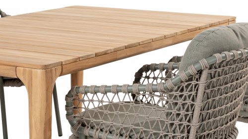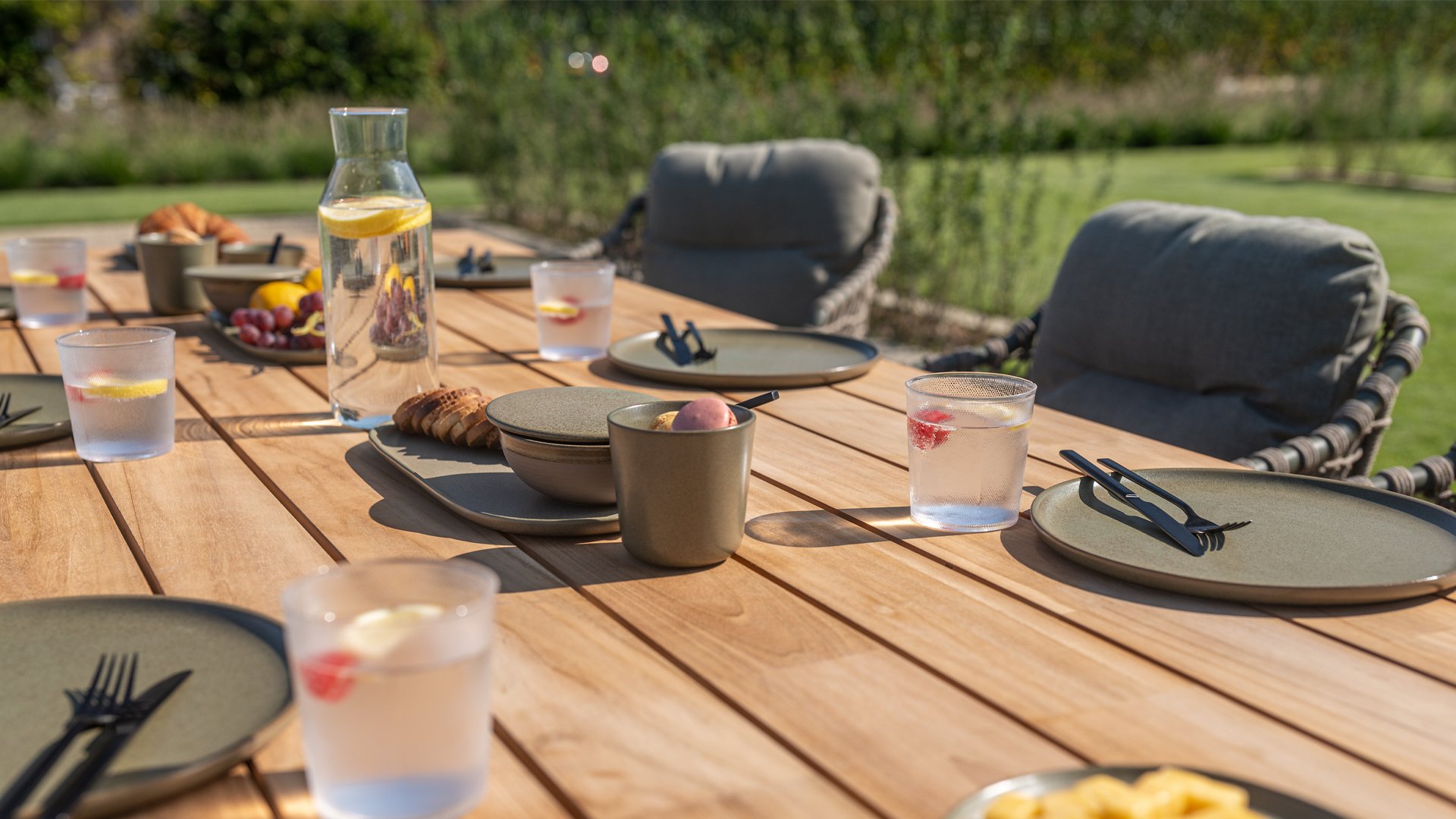Met de Liam tafel van Taste 4SO kunt u genieten van de tijdloze charme en duurzaamheid van teakhout terwijl je dineert in de open lucht. Verkrijgbaar in volledig teakhout en teakhout-keramiek: