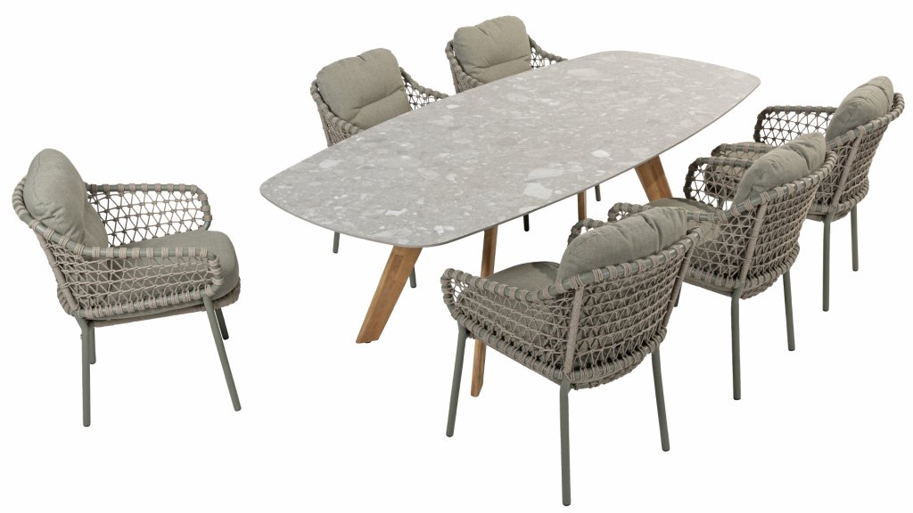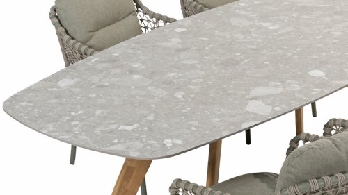 Der 4Seasons Outdoor Montana ist ein wunderschöner Tisch, der sofort ins Auge fällt. Es sieht nicht nur modern aus, sondern ist durch die Form der Tischplatte auch äußerst praktisch. Der Tisch zeichnet sich durch seine dänisch-ovale Tischplatte aus, die Form schafft ausreichend Platz auf allen Seiten des Tisches. Bei der Montana-Serie gibt es mehrere Optionen; Die 240 cm hohe Terrazzo-Keramikplatte kann mit einem Untergestell aus Edelstahl oder Teakholz kombiniert werden. Innerhalb der Montana-Serie gibt es auch einen 280 cm großen Tisch mit HPL-Platte.