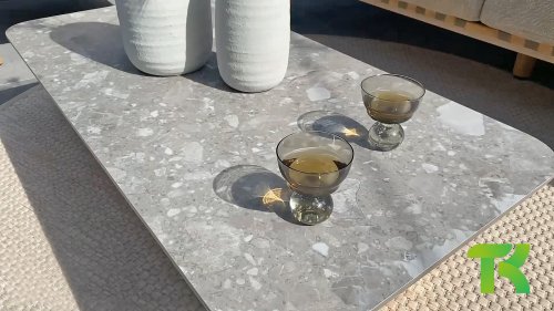 Fügen Sie Ihrer Terrasse, Ihrem Garten oder Ihrer Veranda mit dem rechteckigen Couchtisch 4 Seasons Outdoor Lucas einen Hauch von Luxus und Stil hinzu. Genießen Sie die Haltbarkeit von Teakholz in Kombination mit dem modernen Design der Keramik-Terrazzo-Tischplatte.