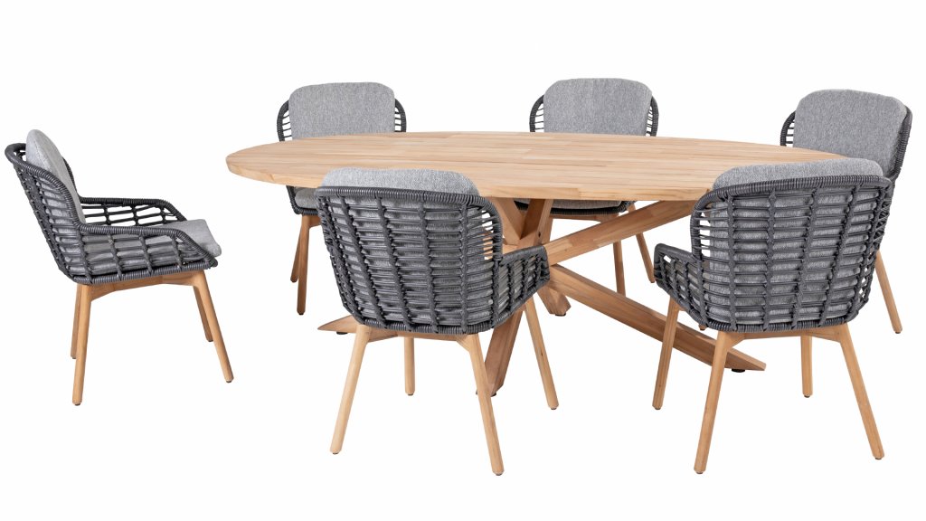 Die Taste by 4Seasons Prado Ellipse kann getrost als Kunstwerk bezeichnet werden. Schauen Sie sich an, wie kunstvoll dieses Beinset zusammengestellt ist. Die dicke Teakplatte hat eine abgeschrägte Seite und verleiht dem Tisch etwas Luftiges. Kann mit unserer gesamten Kollektion an Gartenstühlen kombiniert werden. Der Prado Ellips ist auch mit anthrazitfarbenen Aluminiumbeinen erhältlich.