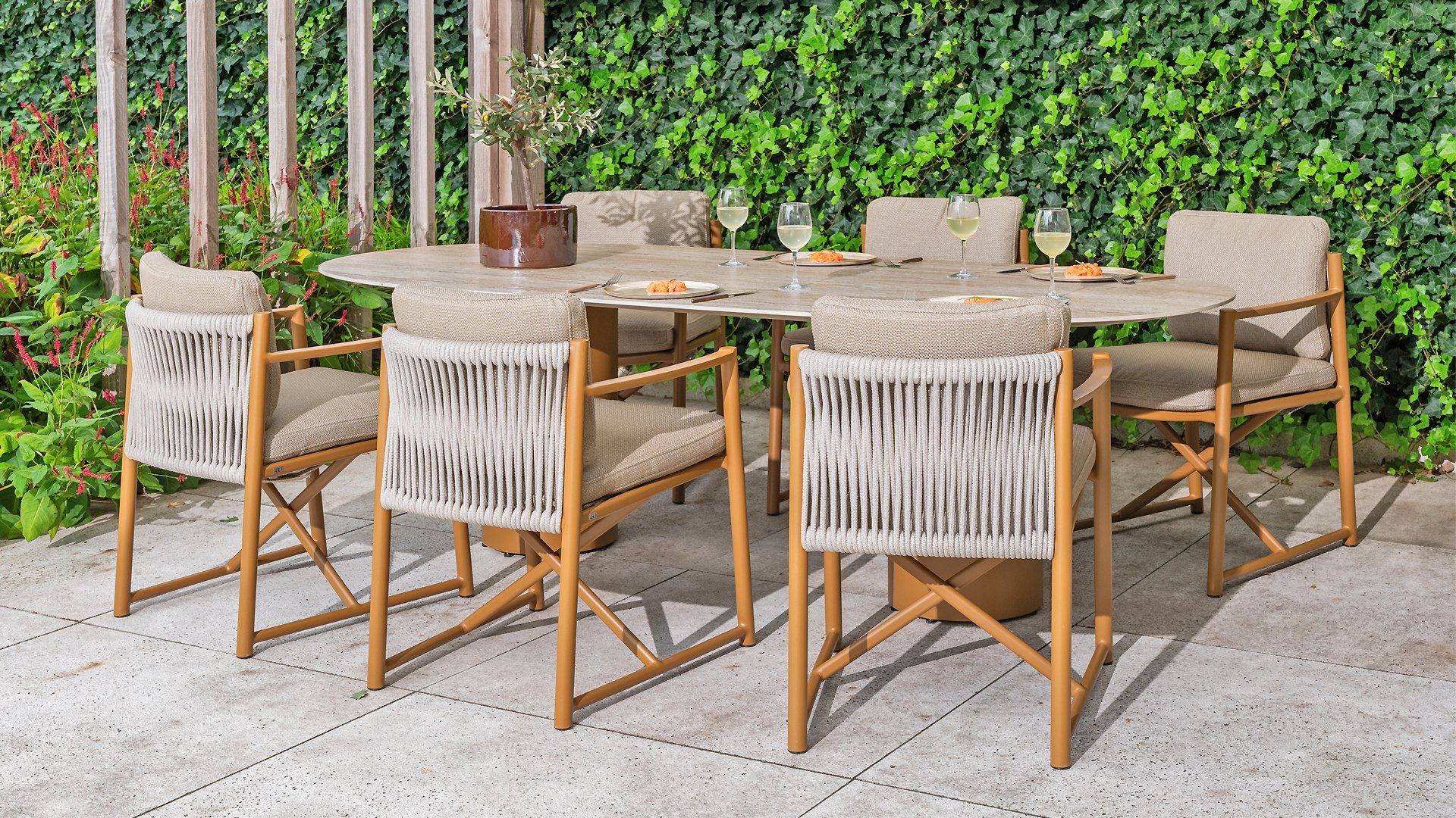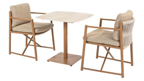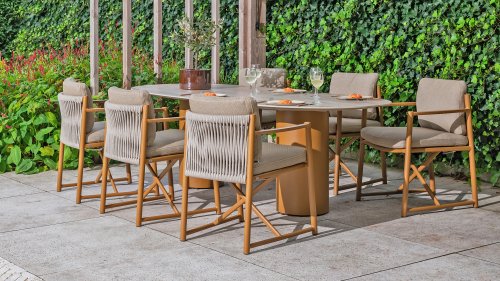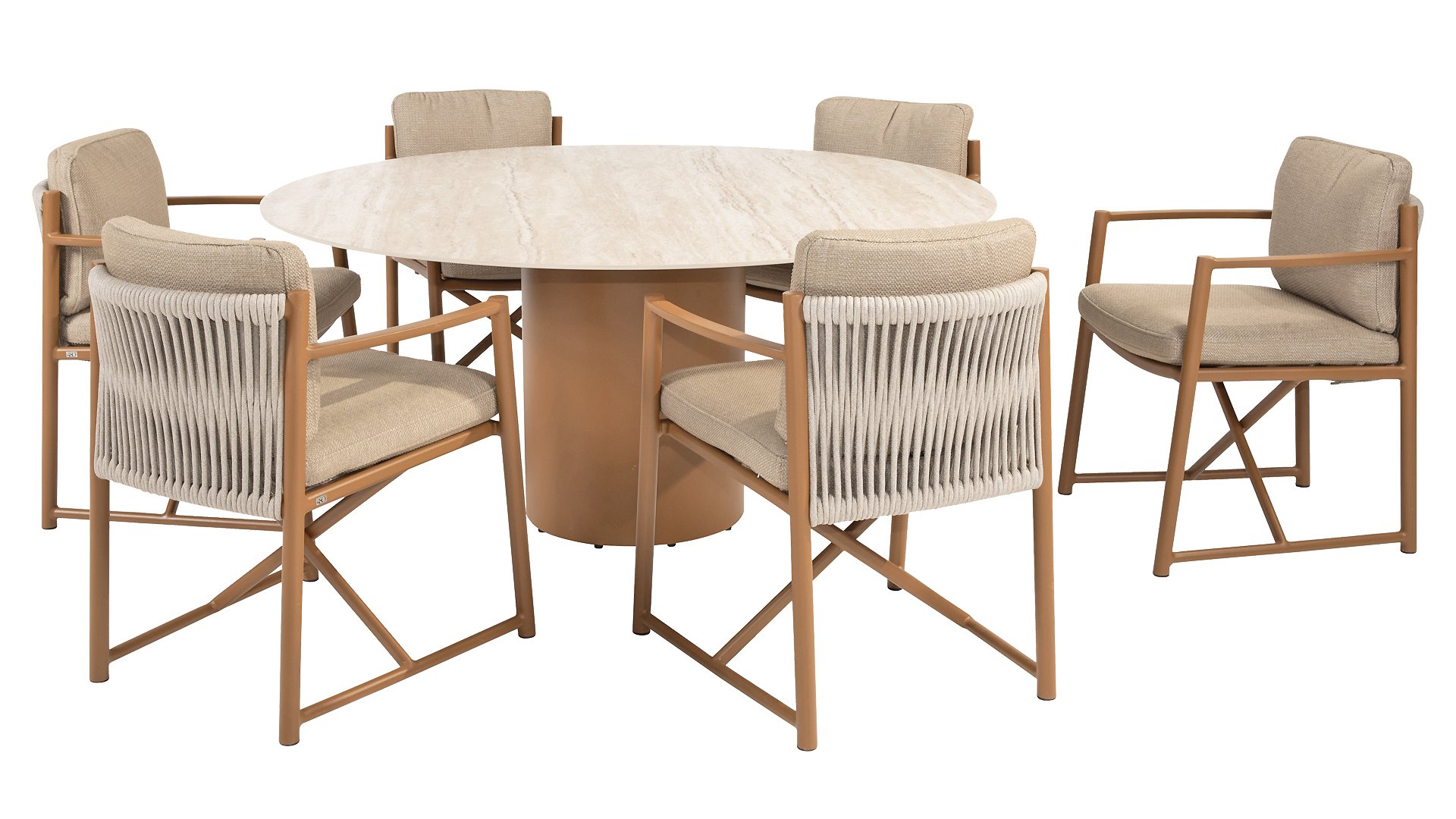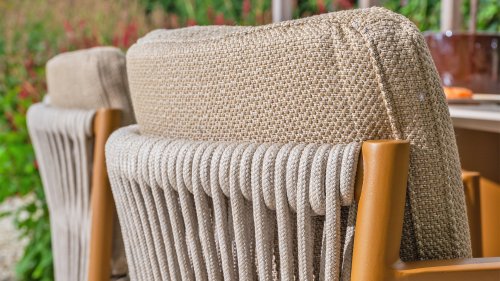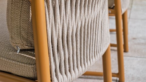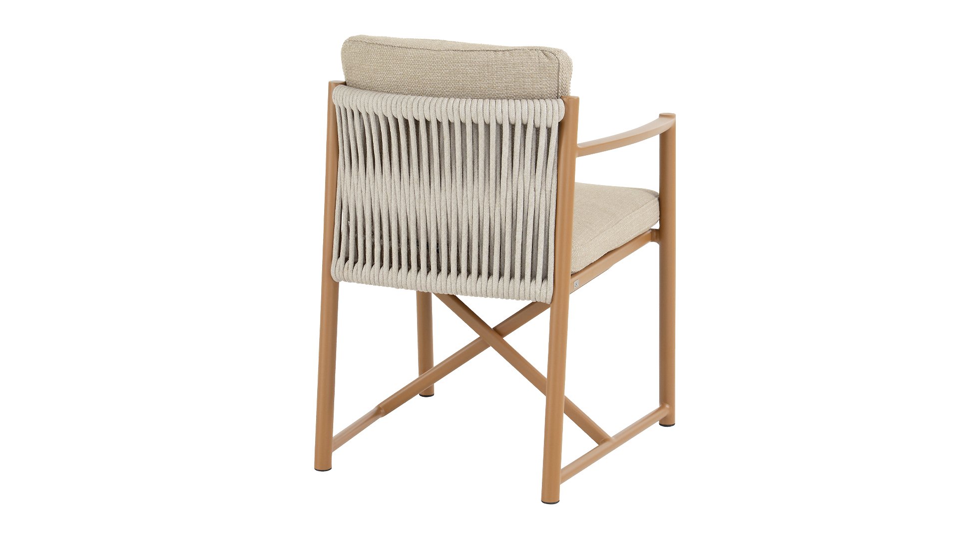 Der 4 Seasons Outdoor Marina Amber Esszimmerstuhl ist ideal für alle, die elegante, formschöne Möbel lieben. Das Gestell aus pulverbeschichtetem Aluminium in einem warmen Erdton kombiniert mit luftigen Seiten und einem Seilgeflecht an der Rückenlehne verleiht ihm einen luxuriösen Look. Die wetterfesten Olefin-Kissenbezüge sind UV- und schimmelresistent – perfekt für jahrelange Nutzung im Freien.