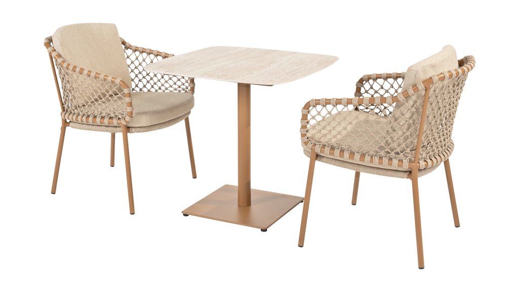 Mit einer eleganten und luftigen geflochtenen Seilstruktur in einem warmen Bernsteinton, kombiniert mit einer dezent geschwungenen Rückenlehne. Die Kombination aus offenem Seilgeflecht und natürlichen Farbtönen schafft eine moderne, einladende Atmosphäre. Die weichen sandfarbenen Kissen bieten bequemen Sitzkomfort – ideal für lange Sommerabende am Tisch.