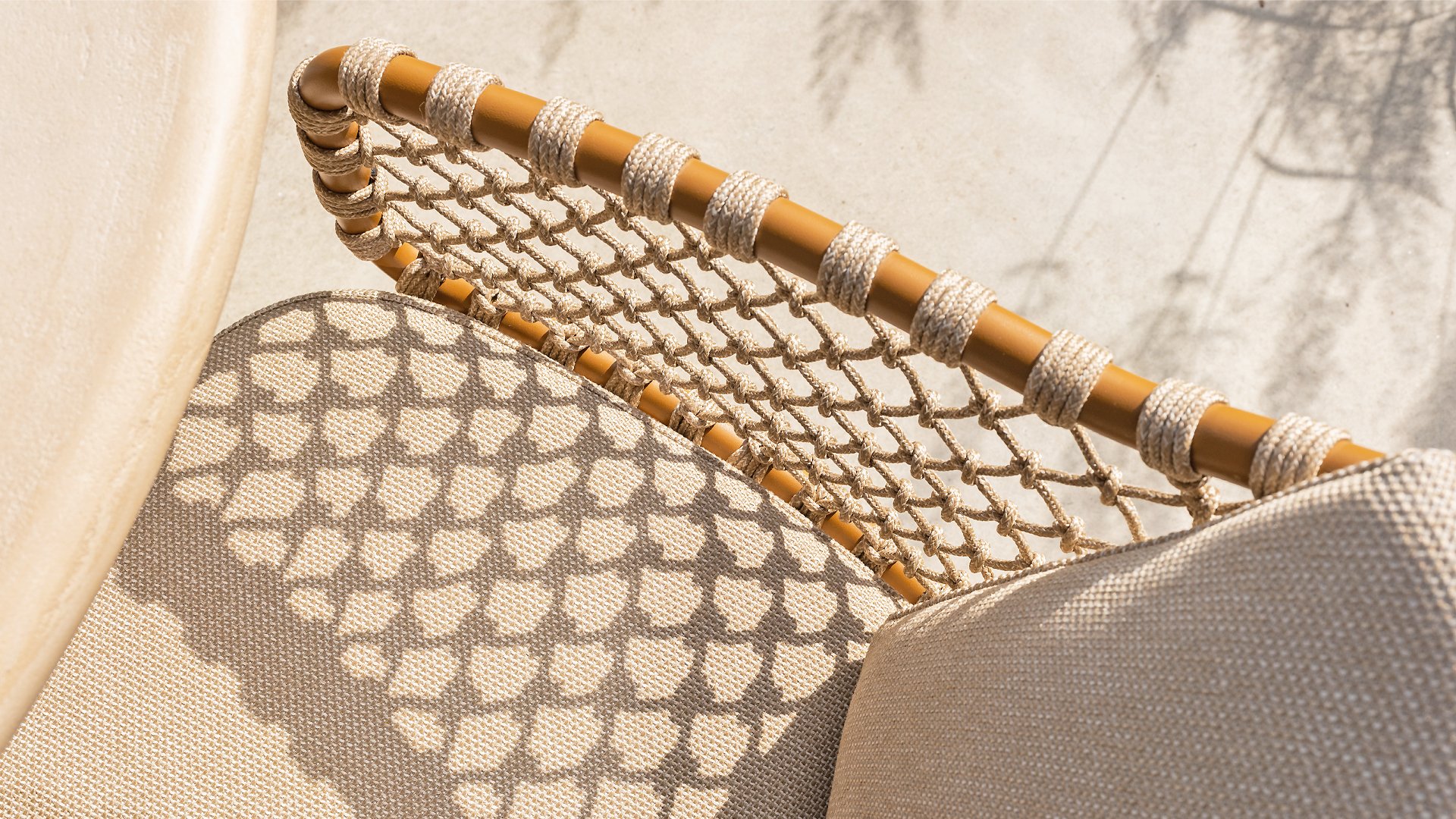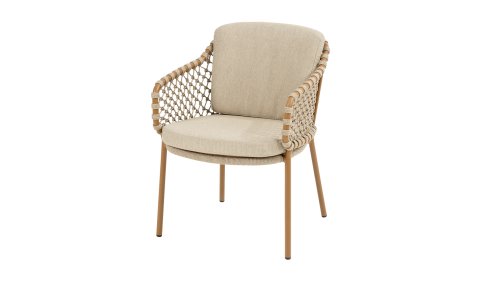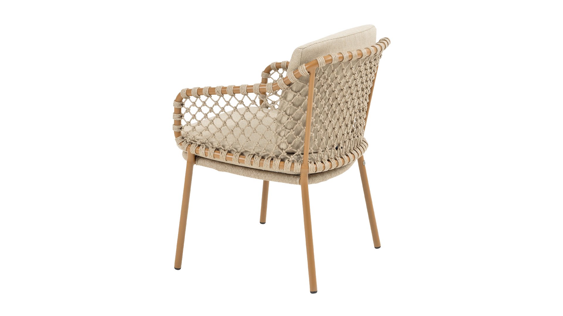 Mit einer eleganten und luftigen geflochtenen Seilstruktur in einem warmen Bernsteinton, kombiniert mit einer dezent geschwungenen Rückenlehne. Die Kombination aus offenem Seilgeflecht und natürlichen Farbtönen schafft eine moderne, einladende Atmosphäre. Die weichen sandfarbenen Kissen bieten bequemen Sitzkomfort – ideal für lange Sommerabende am Tisch.
