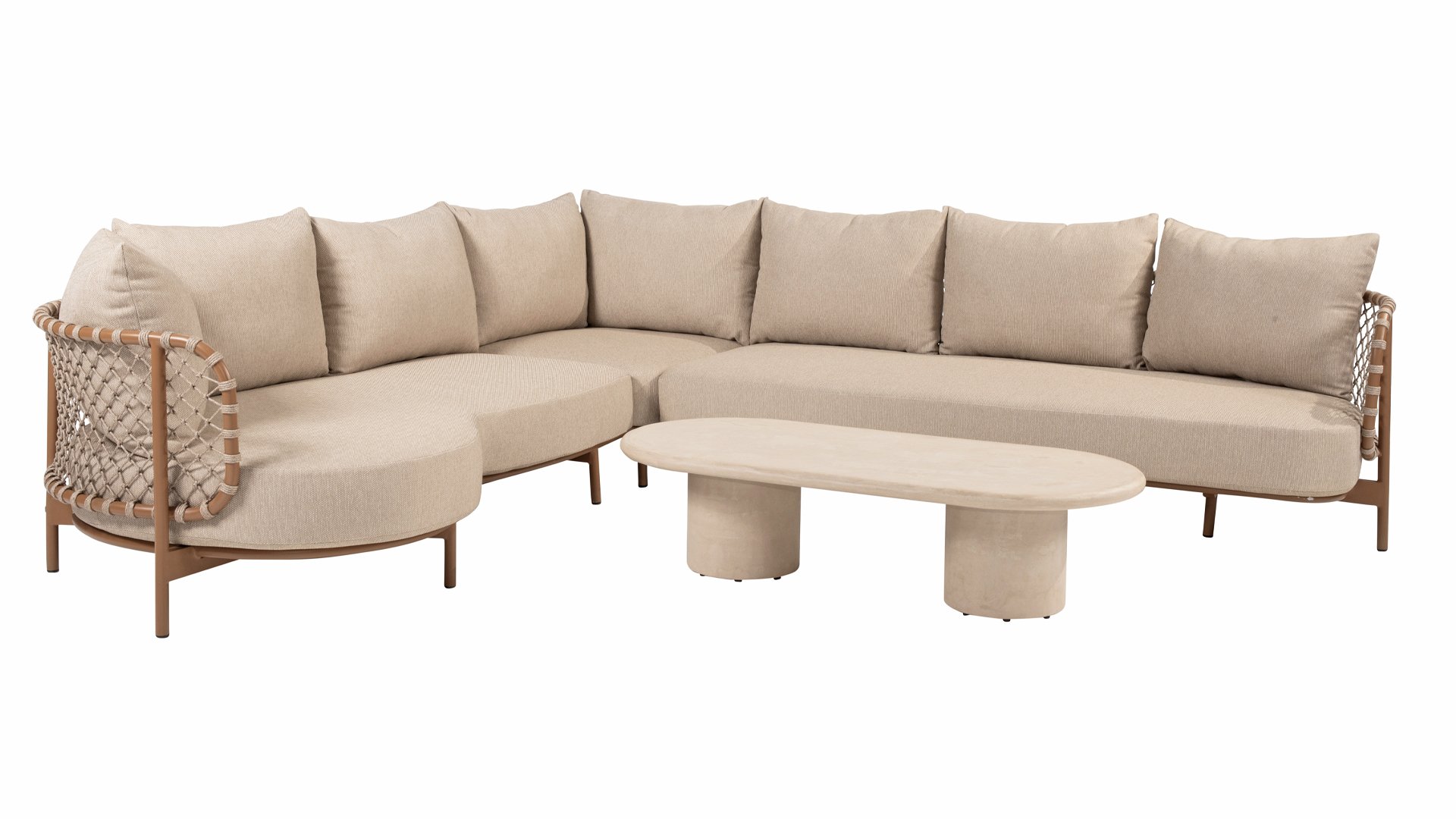 Erleben Sie zeitlosen Luxus mit der Martinique Loungegruppe von 4 Seasons Outdoor. Das auffällige geknotete Rope-Design verleiht einen spielerischen, aber raffinierten Charakter, während der bernsteinfarbene Rahmen Wärme und Ambiente in Ihren Garten oder Ihre Terrasse bringt. Dieses Set ist perfekt für alle, die eine Kombination aus Stil und Komfort suchen.