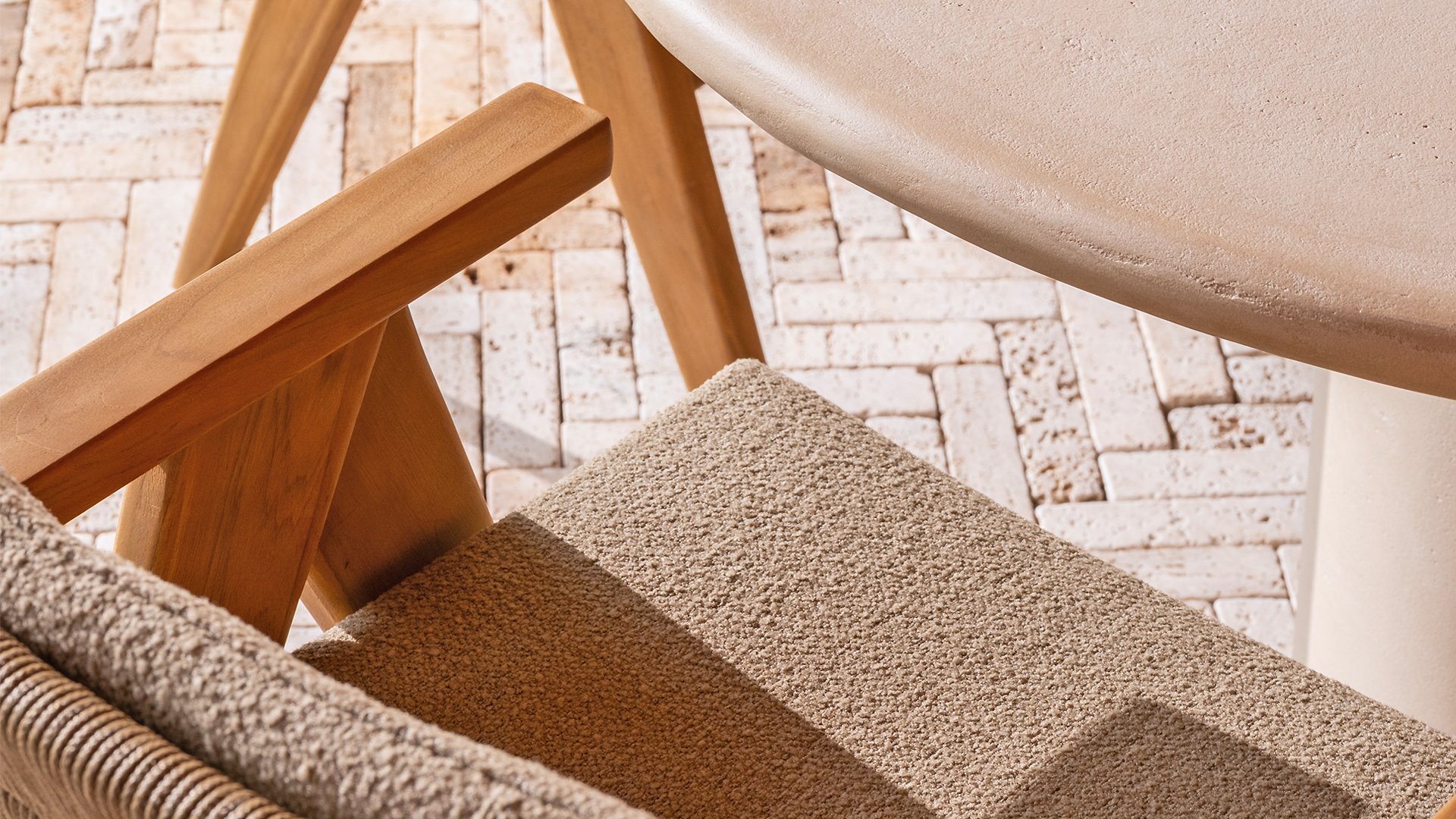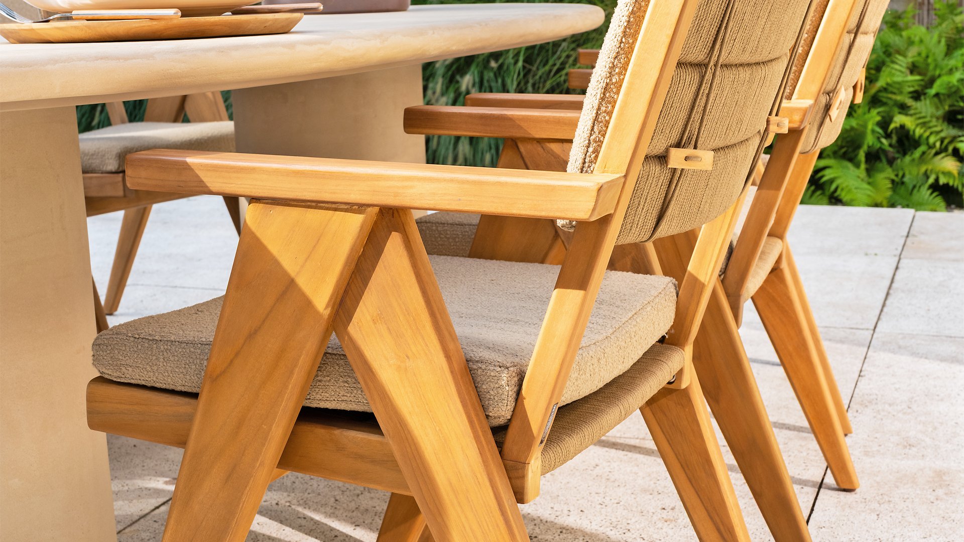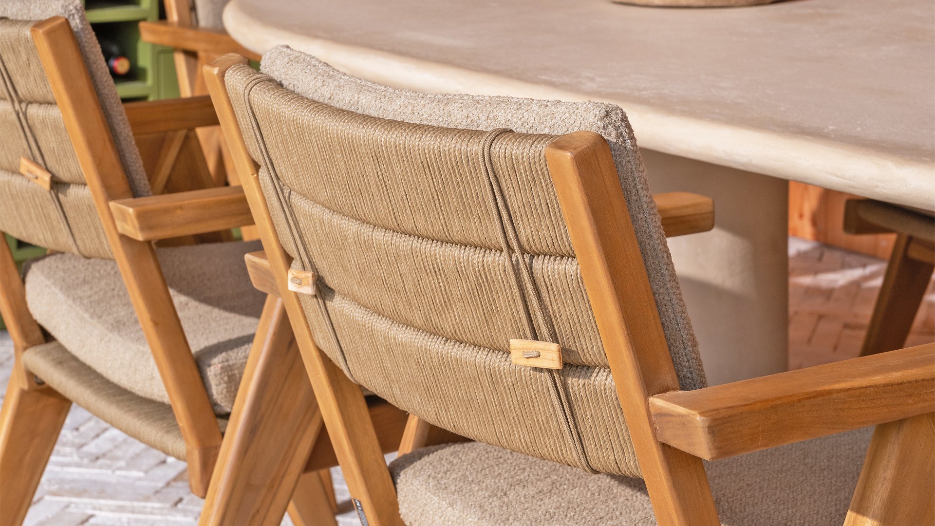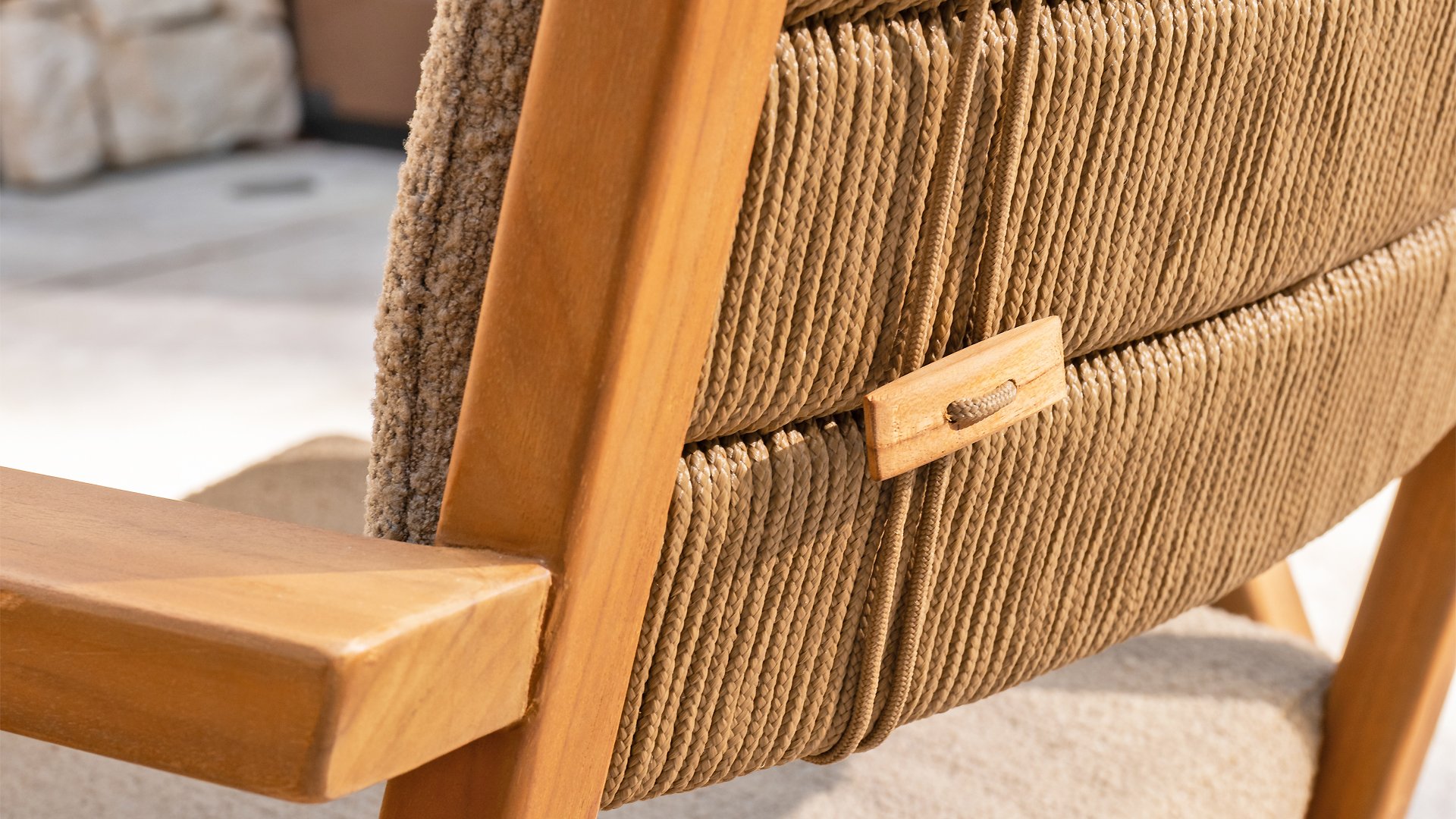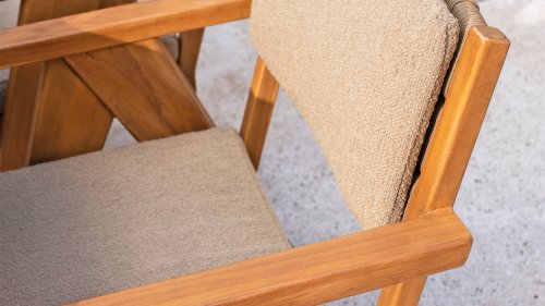 - Stilvolles und zeitloses Design: Die Kombination aus Teakholz und taupefarbenem Bouclé schafft eine elegante und beruhigende Atmosphäre in jedem Garten.