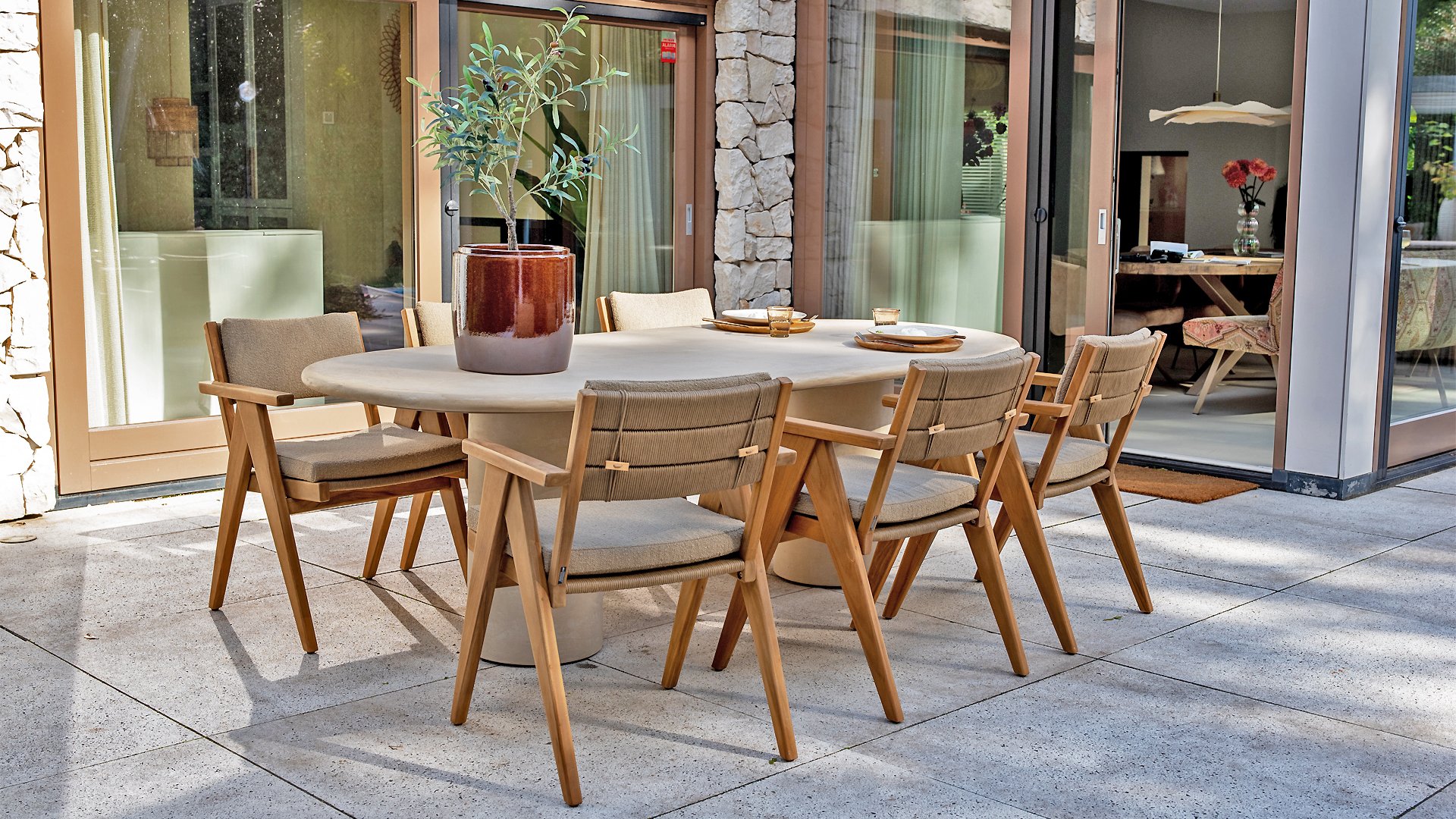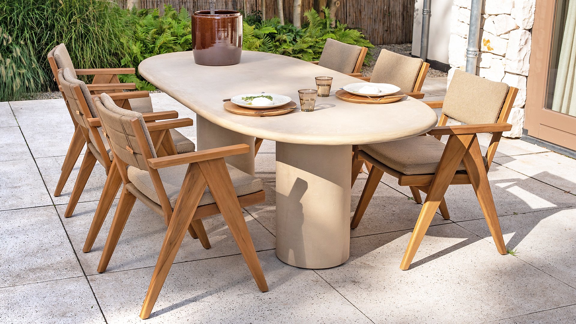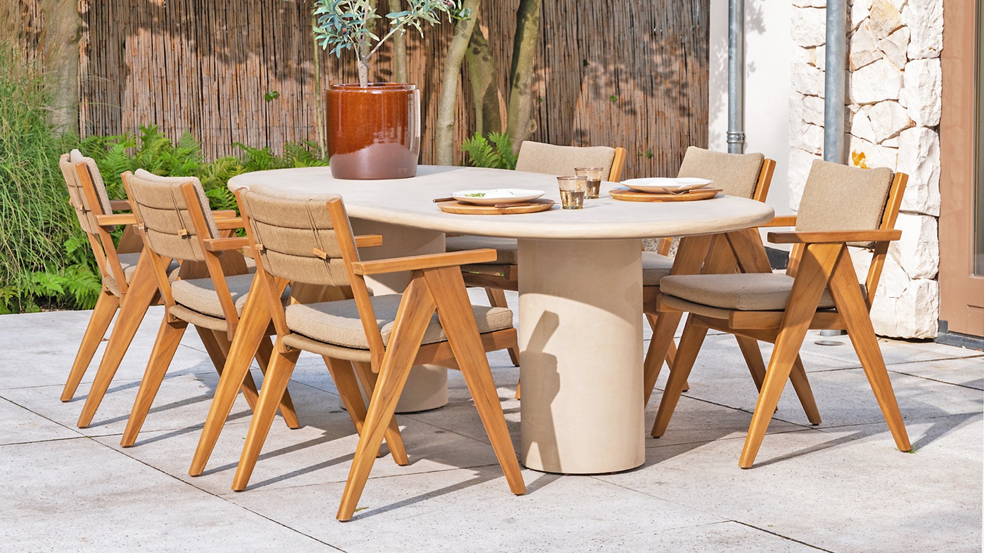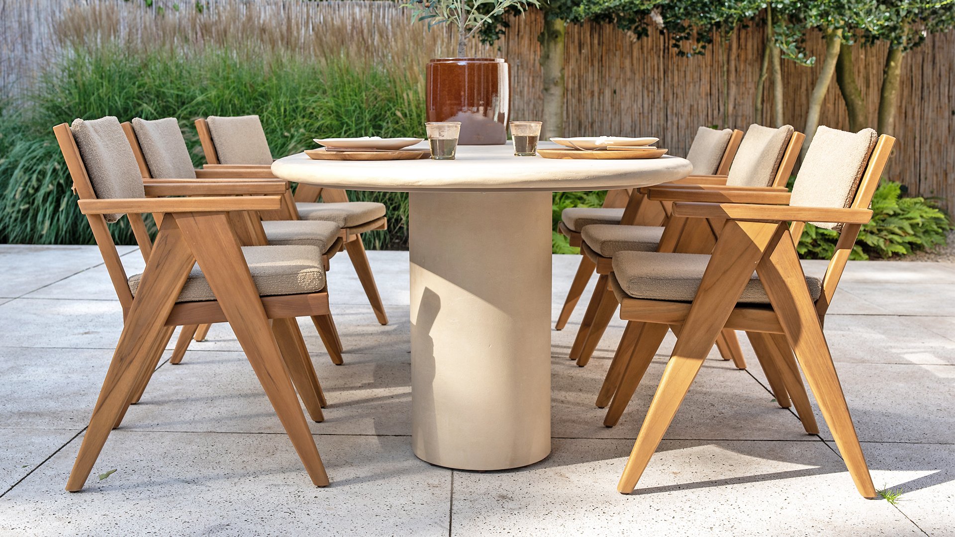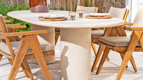 - Stilvolles und zeitloses Design: Die Kombination aus Teakholz und taupefarbenem Bouclé schafft eine elegante und beruhigende Atmosphäre in jedem Garten.
