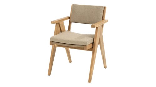 Das Stuhlkissen besteht aus Olefin und ist mit Bouclé Amber gewebt, was ihm zusätzliche Eleganz verleiht. Der braune Farbton des Kissens sorgt für eine beruhigende, neutrale Note und ergänzt die natürliche Optik des Teakholzgestells. Das Kissen ist an vier Punkten am Teakholzgestell befestigt.