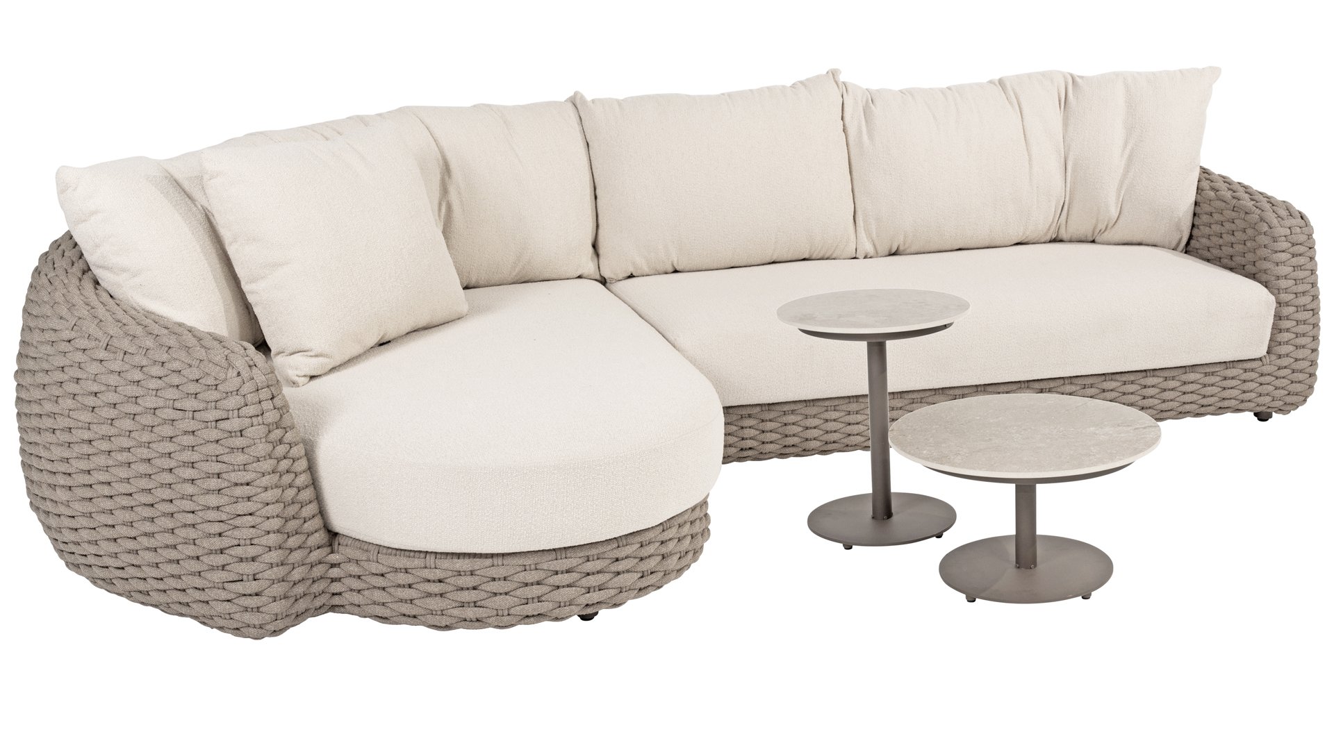 Verbessern Sie Ihr Lounge-Erlebnis mit der Maxime-Lounge von 4 Seasons Outdoor. Dieses Lounge-Set ist eine perfekte Ergänzung für Ihre luxuriöse Terrasse. Die schönen Kurven sind eine Augenweide, während die dicken Loungekissen aus cremefarbenem Bouclé-Stoff für absolute Entspannung sorgen.