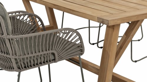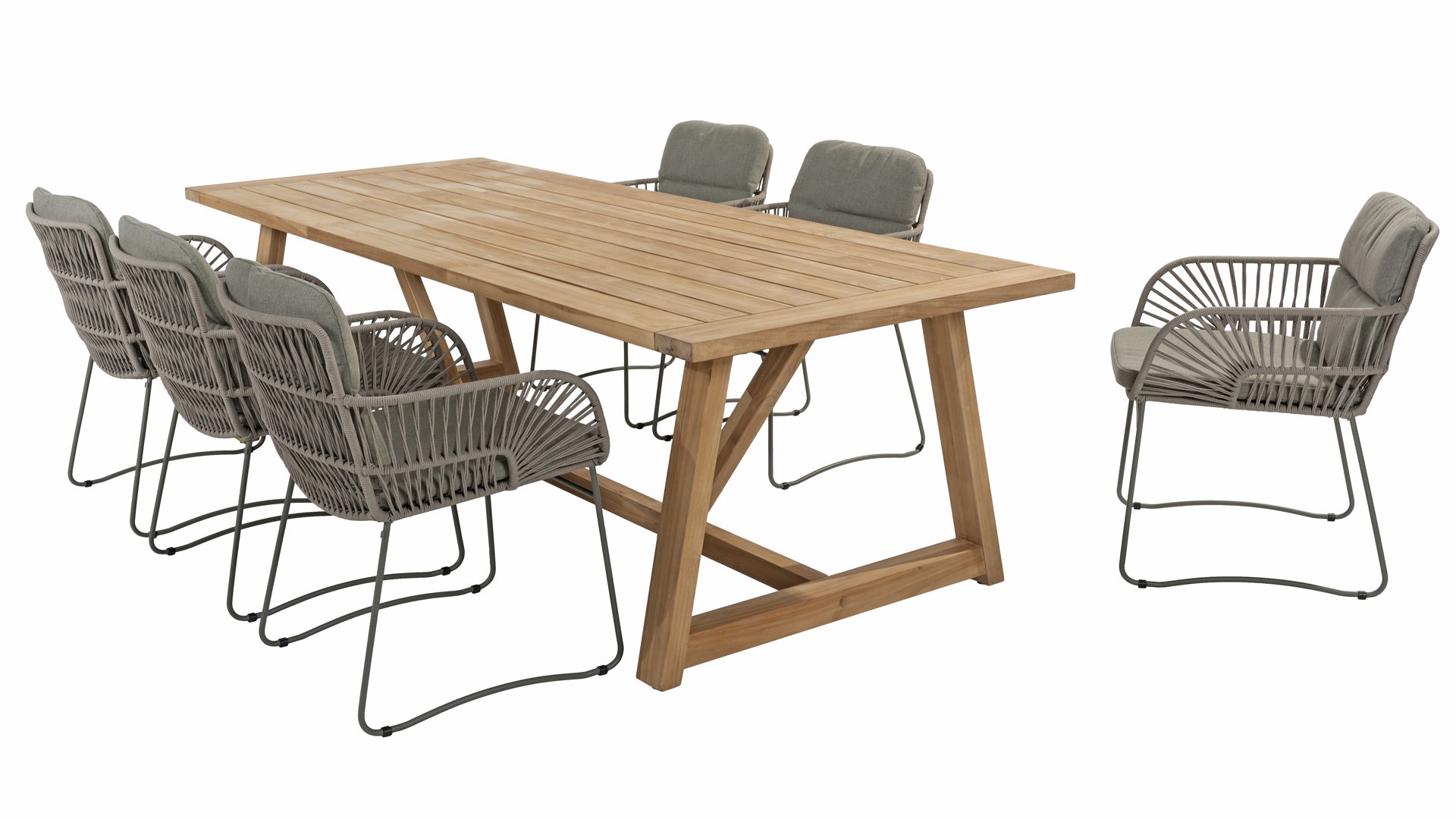 Gartenmöbel aus Teakholz bieten einen atemberaubenden Blick.Teakholz eignet sich besonders gut für den Einsatz im Außenbereich. Es ist resistent gegen Schädlinge und Pilze und widerstandsfähig gegen Sonne, Regen und Schnee. Mit der Zeit entwickelt das Teakholz eine silbergraue Patina. Gartenmöbel aus Teakholz bieten einen atemberaubenden Blick. Darüber hinaus ist es starkes Material und erfordert nur wenig Wartung. Wer die ursprüngliche Farbe des Teakholzes bevorzugt, kann durch regelmäßiges benutzen unser Pflegemittel ganz einfach das Vergrauen des Holzes verhindern.Darüber hinaus können Sie Teak mit grüner Seife reinigen. Durch Temperaturunterschiede und durch den Wechsel von Feuchtigkeit und Trockenheit können kleine Haarrisse entstehen. Es ist üblich, dass Man in dies Unvollkommenheiten findet, diese Unregelmäßigkeiten sind kennzeichnend für dieses Produkt. Diese Unregelmäßigkeiten können nie einen Anlass zu Reklamation, Garantie oder Claim formen. Es betrifft eine Unterschrift von Originalität!  Wir gewähren Garantie auf alle Produktions- und Konstruktionsfehler. Die Wirkung von Teakholz ist nicht enthalten. Wenn Sie sich für Teakholz entscheiden, erwarten wir, dass Sie diese Eigenschaften zu schätzen wissen. Eventuell auftretende Haarrisse, Äste im Teakholz und raue Oberflächen im Laufe der Zeit fallen nicht unter unsere Garantie. Diese Eigenschaften verleihen dem Teakholz seinen eigenen Charakter und sind Teil der Optik. Seien Sie vorsichtig mit einem Blumentopf oder einer Vase auf Ihrem Gartentisch aus Teakholz, da dies zu hartnäckigen Kreisen oder Farbunterschieden führen kann.